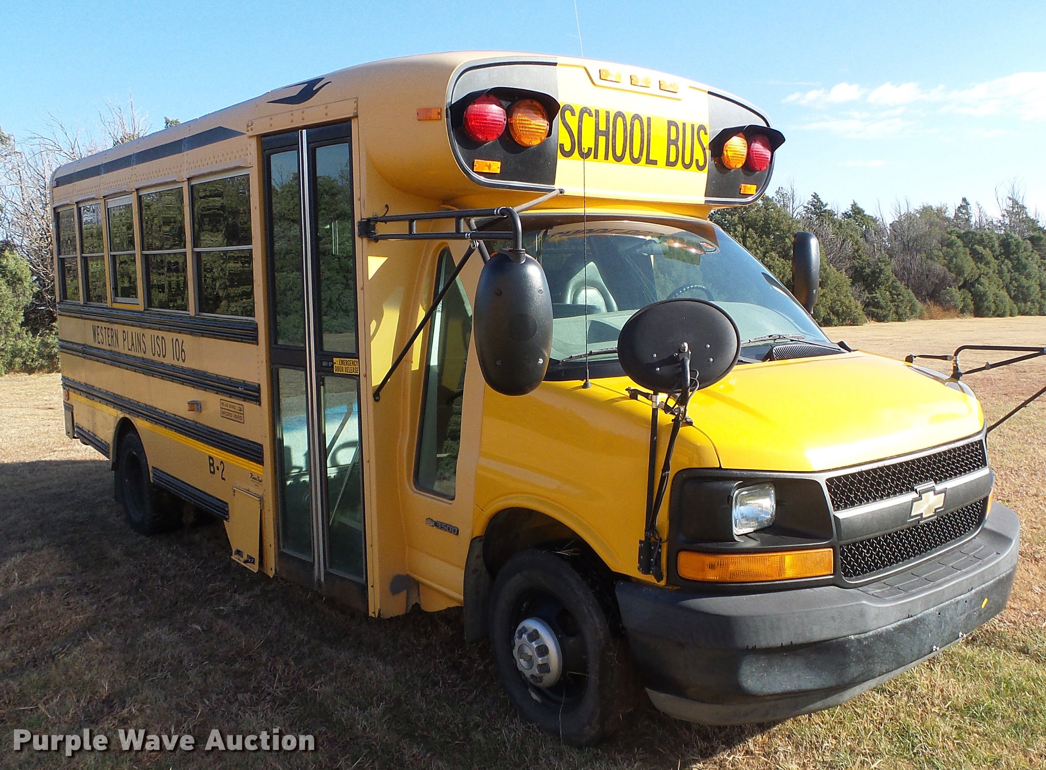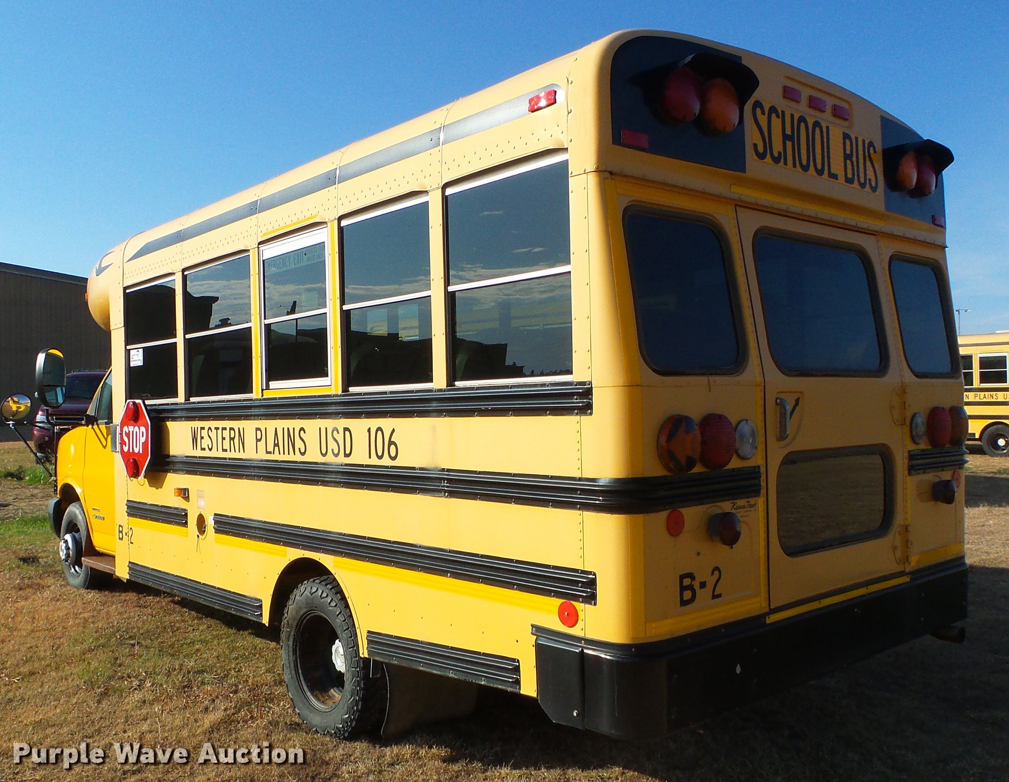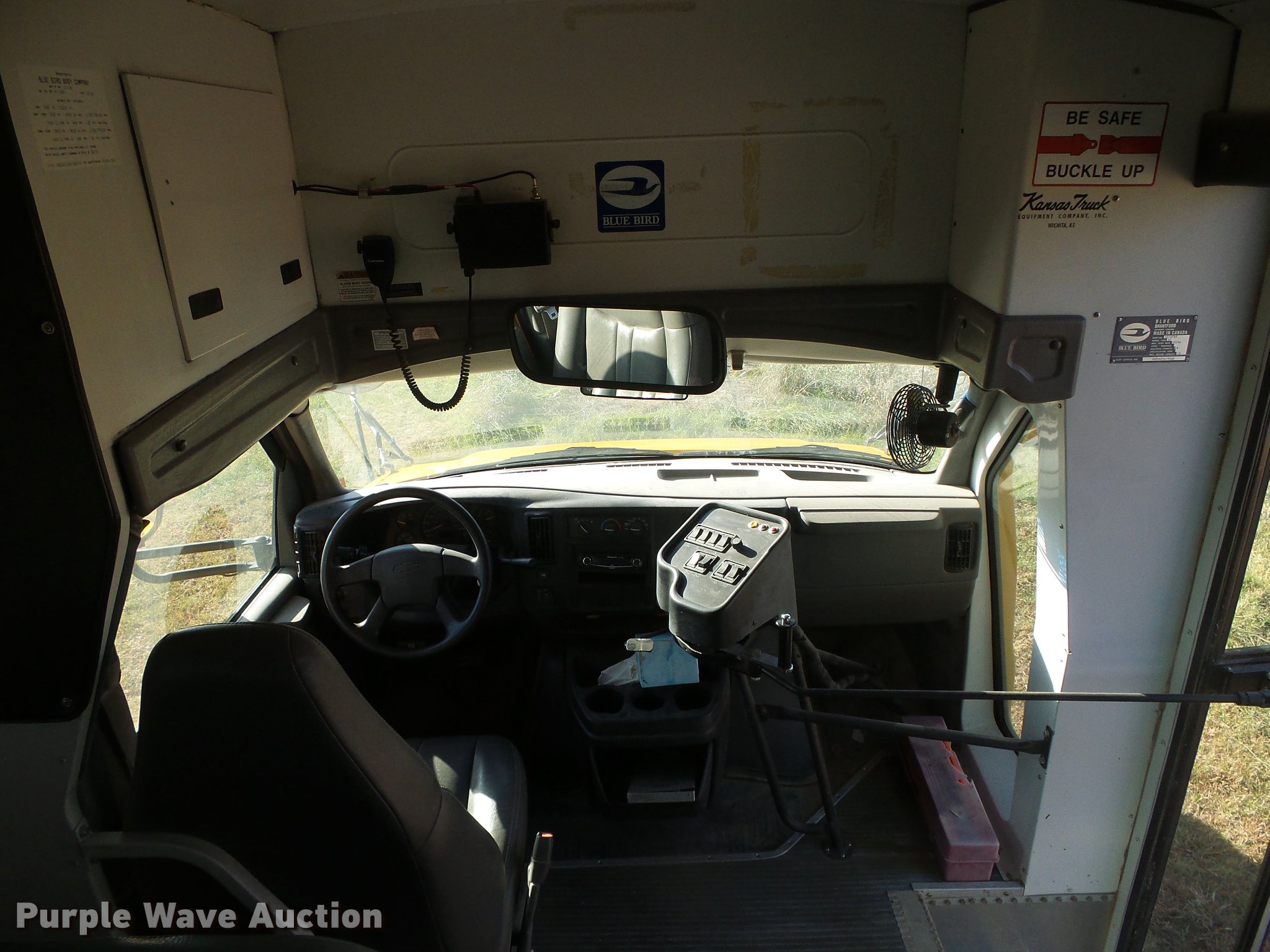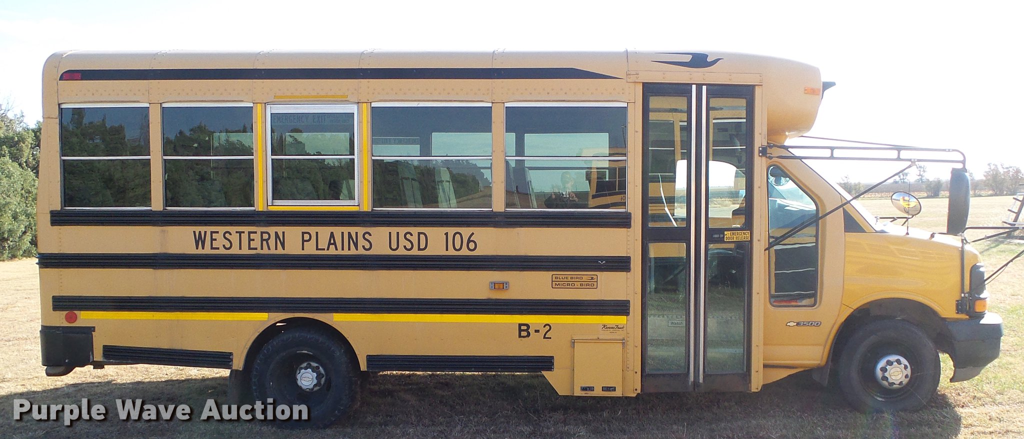 Purple Wave is selling a used Bus in Kansas. This item is a 2007 Chevrolet Express 3500 Blue Bird school bus with the following: Unknown miles on odometer, 6.6L V8 OHV 32V turbo diesel engine, Serial 6GMXH06.6591, Automatic transmission, Single axle, AC and heat, AM/FM, Heated mirrors, Suspension seat, 28 passenger capacity, (8) child safety seats, Seat belts, Ceiling, rear, and side emergency exits, Lighted stop sign, Block heater, Rear tow hooks, Spring suspension, Hydraulic brakes, LT225/75R16 tires, GVWR 12,300 lbs, Batteries need to be replaced, Non-operational unit, Unit# B-2