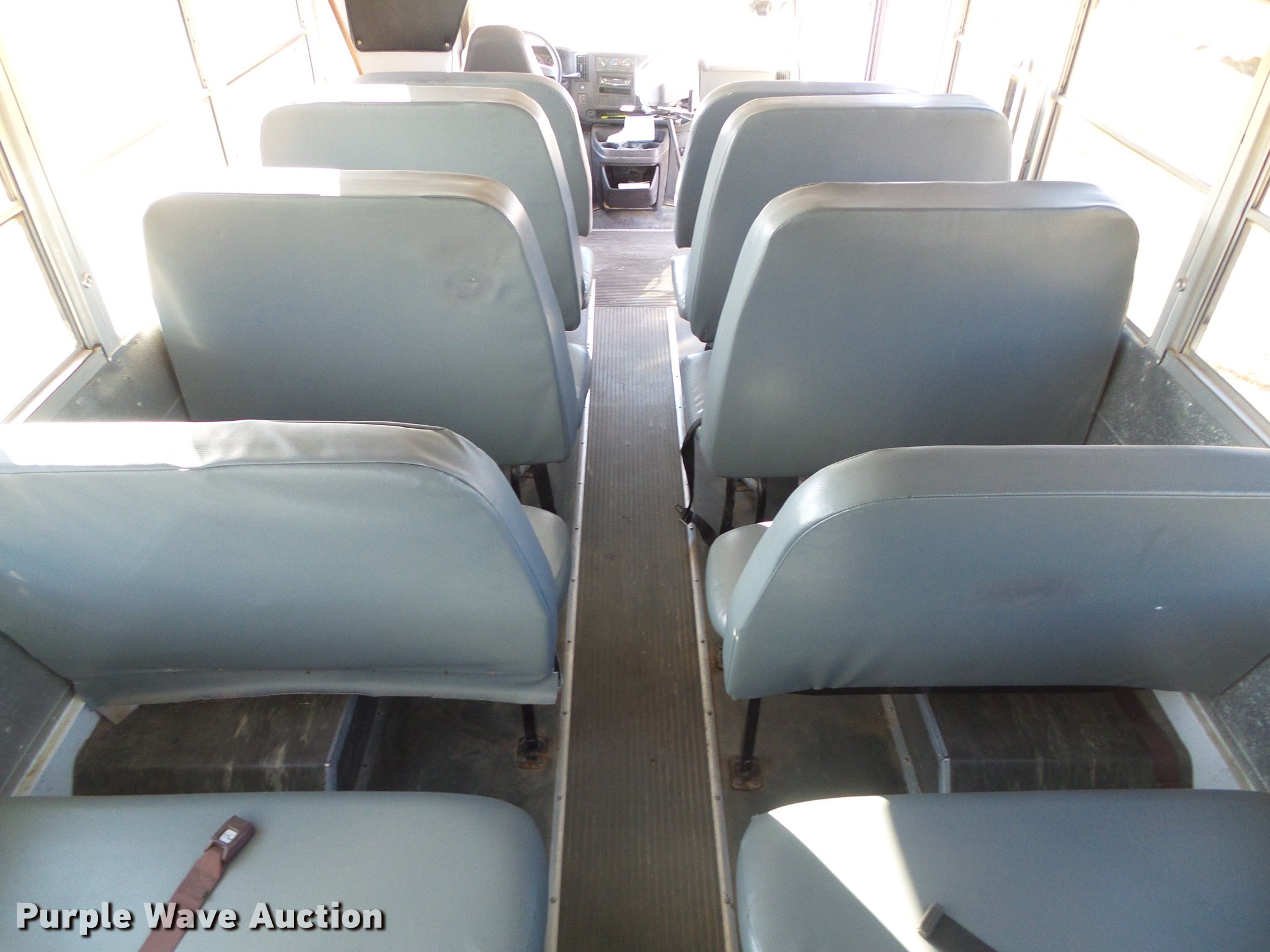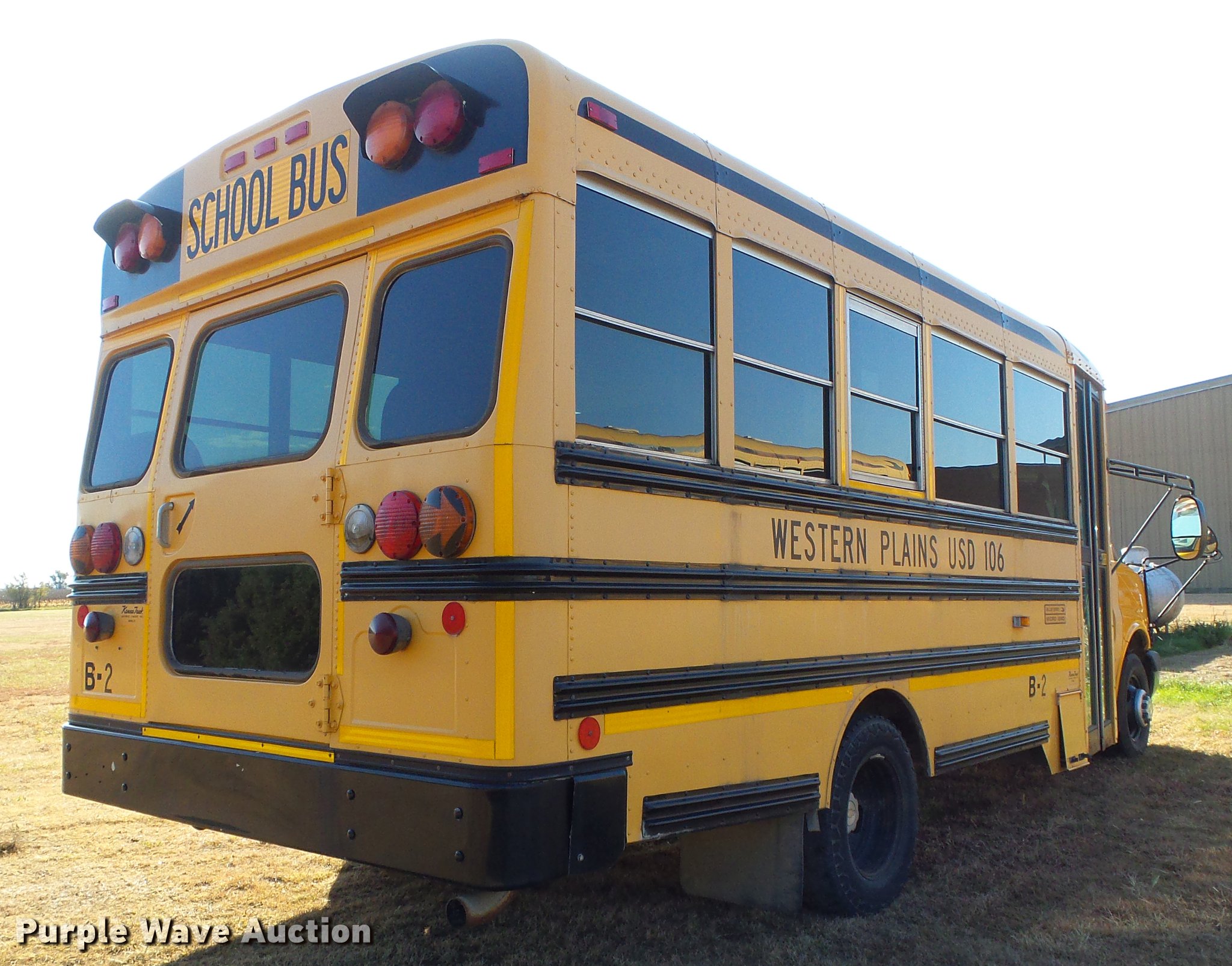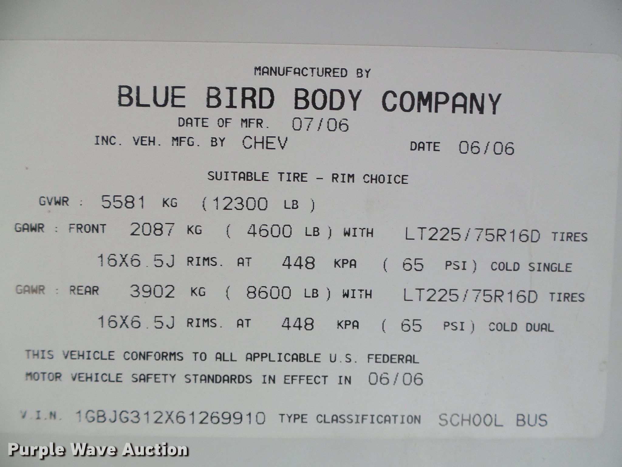 Purple Wave is selling a used Bus in Kansas. This item is a 2007 Chevrolet Express 3500 Blue Bird school bus with the following: Unknown miles on odometer, 6.6L V8 OHV 32V turbo diesel engine, Serial 6GMXH06.6591, Automatic transmission, Single axle, AC and heat, AM/FM, Heated mirrors, Suspension seat, 28 passenger capacity, (8) child safety seats, Seat belts, Ceiling, rear, and side emergency exits, Lighted stop sign, Block heater, Rear tow hooks, Spring suspension, Hydraulic brakes, LT225/75R16 tires, GVWR 12,300 lbs, Batteries need to be replaced, Non-operational unit, Unit# B-2