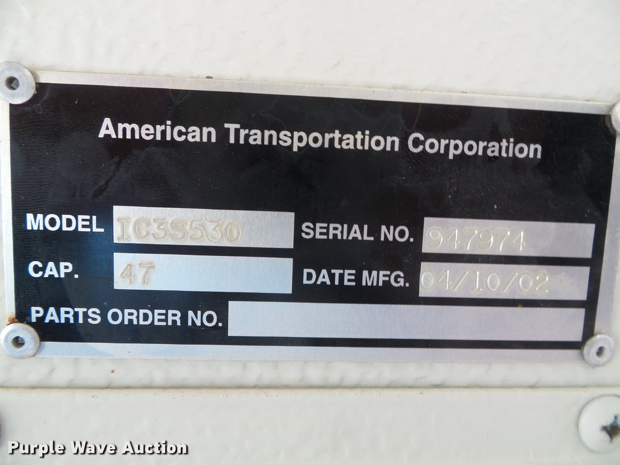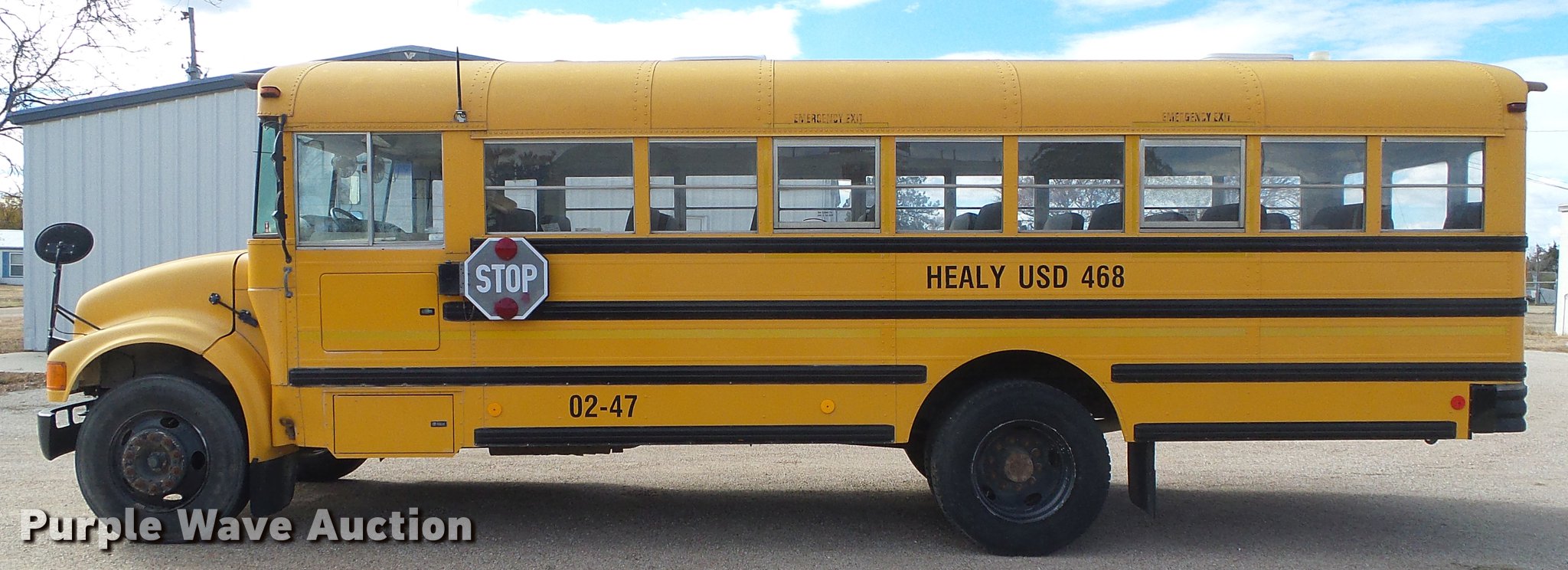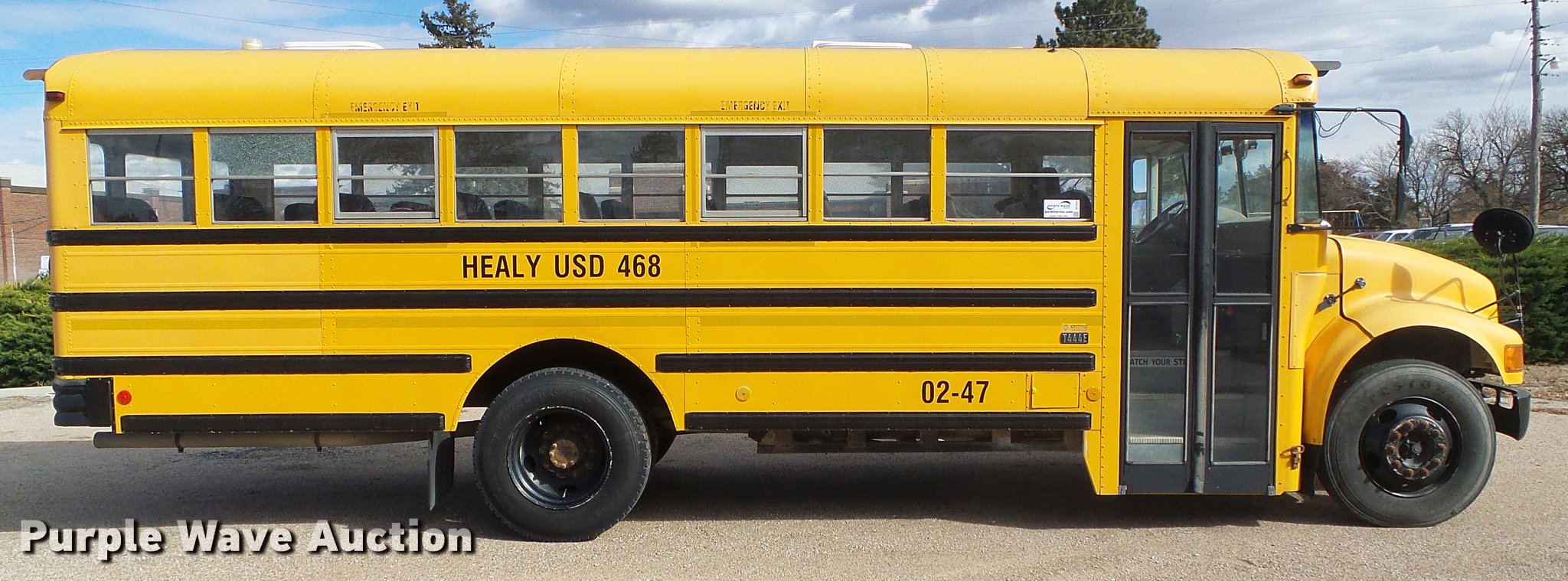 Purple Wave is selling a used Bus in Kansas. This item is a 2002 International school bus with the following: 130,426 miles on odometer, 4,619 hours on meter, International T444E/C210 7.3L V8 turbo diesel engine, Serial 2NVXH0444ANB, Automatic transmission, Single axle, Heat, Heated mirrors, Suspension seat, 47 passenger capacity, Ceiling, rear, and side emergency exits, Lighted stop sign, American Transportation Corp. TC35530 body, Front and rear tow hooks, Spring suspension, Hydraulic brakes, 10R22.5 tires, GVWR 25,500 lbs, Unit# 02-47