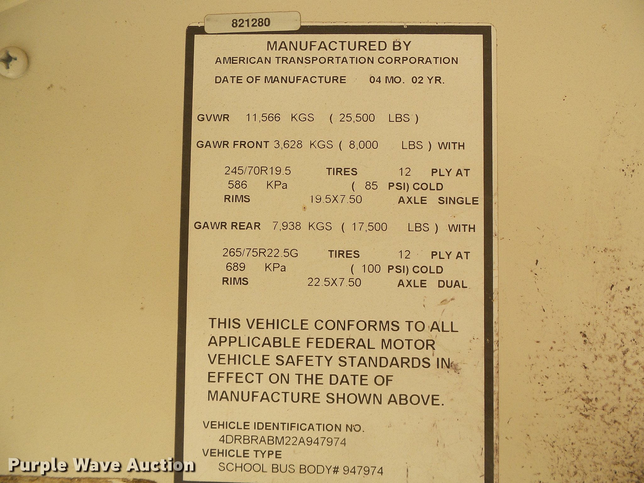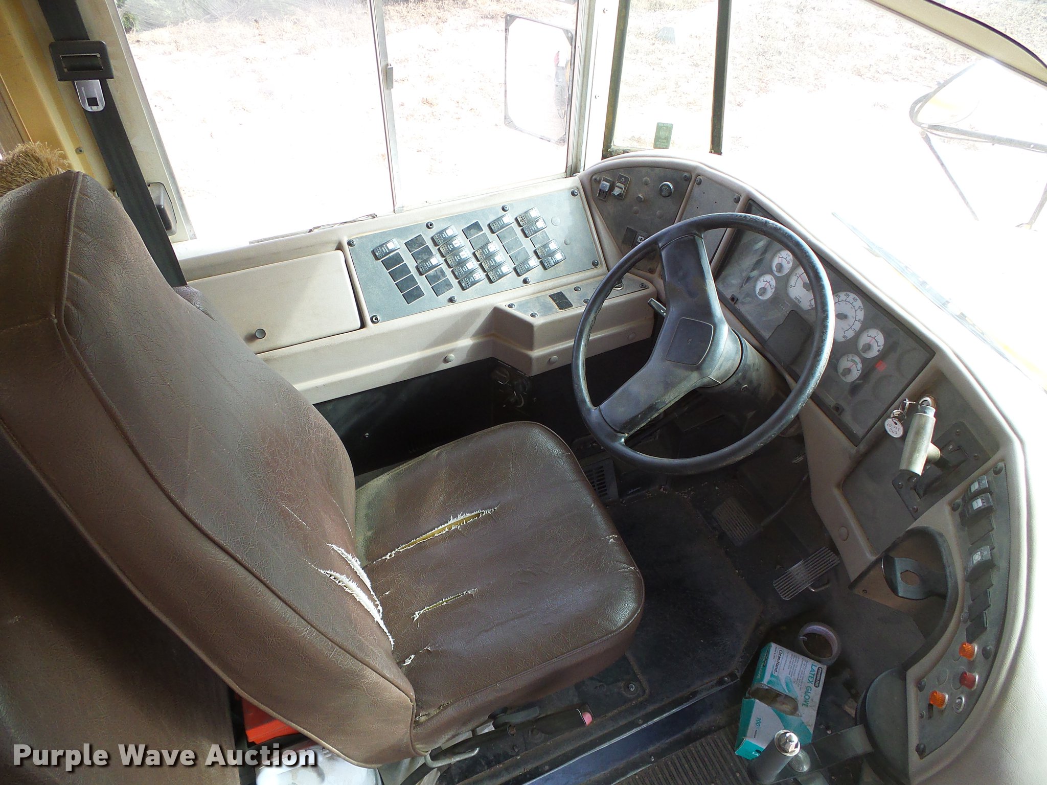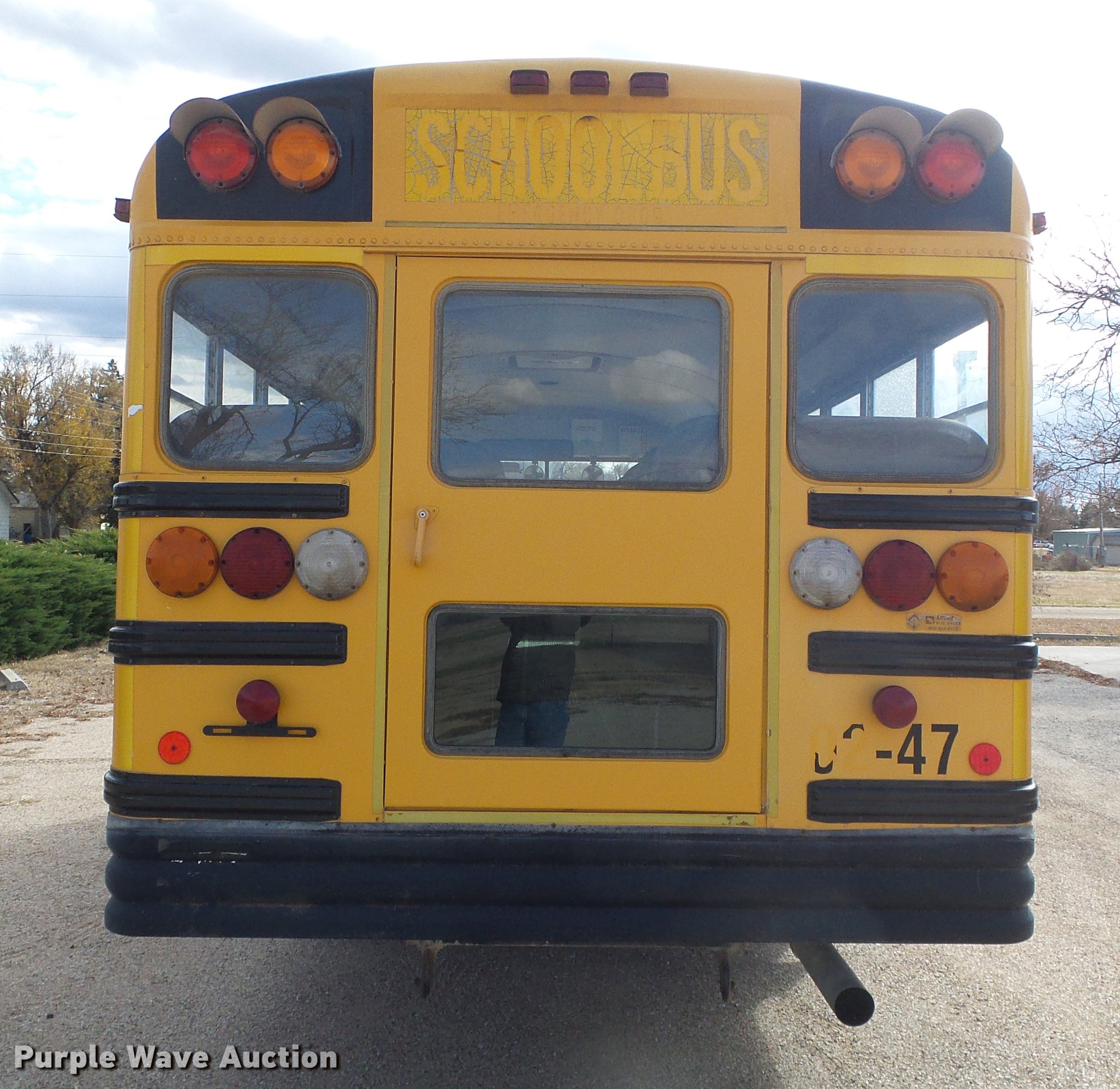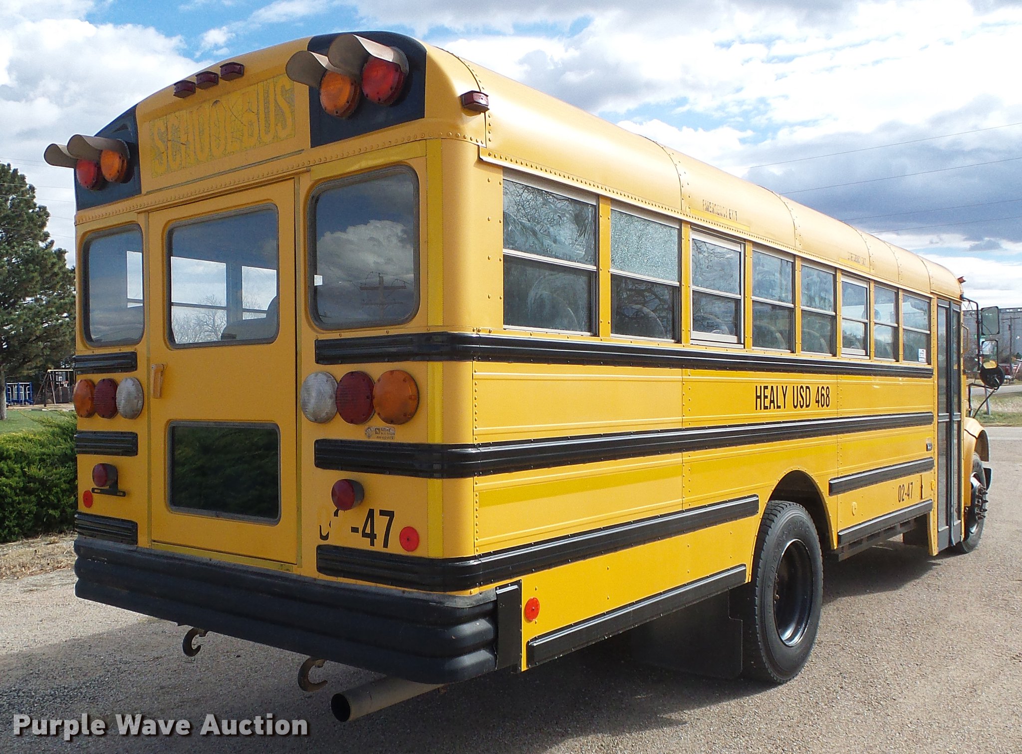 Purple Wave is selling a used Bus in Kansas. This item is a 2002 International school bus with the following: 130,426 miles on odometer, 4,619 hours on meter, International T444E/C210 7.3L V8 turbo diesel engine, Serial 2NVXH0444ANB, Automatic transmission, Single axle, Heat, Heated mirrors, Suspension seat, 47 passenger capacity, Ceiling, rear, and side emergency exits, Lighted stop sign, American Transportation Corp. TC35530 body, Front and rear tow hooks, Spring suspension, Hydraulic brakes, 10R22.5 tires, GVWR 25,500 lbs, Unit# 02-47