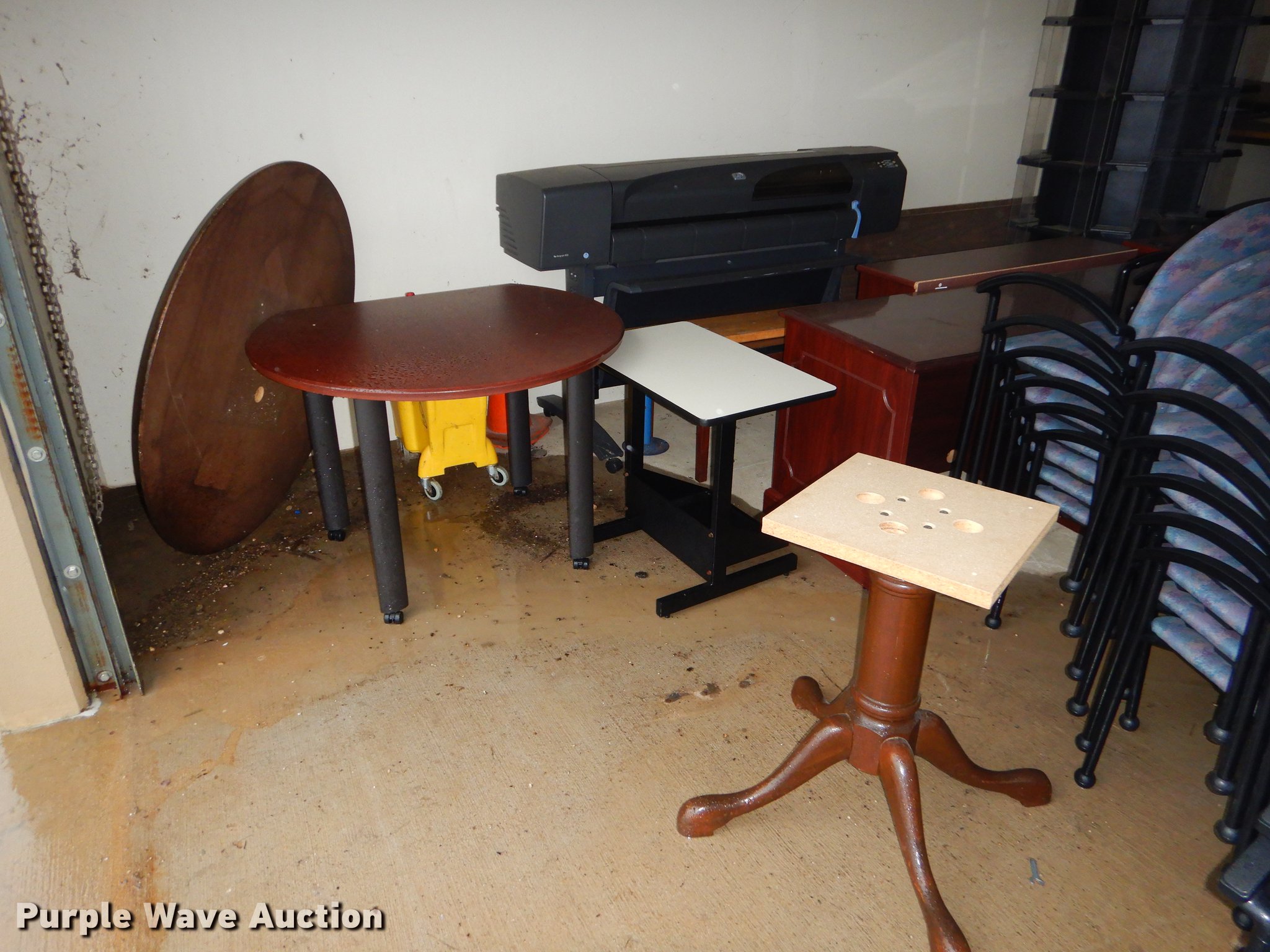 Purple Wave is selling a used Office Supplies and Equip. in Texas. This item is a Office supplies and equipment with the following: Approx. 4 metal file cabinets, Approx. 140 chairs, HP DeskJet 800 plotter/printer, XES 3030 printer, Approx. 15 desks, Approx. 4 cabinets, Round tables, Desk chairs and more, Aluminum stairs, door, and sound equipment not included