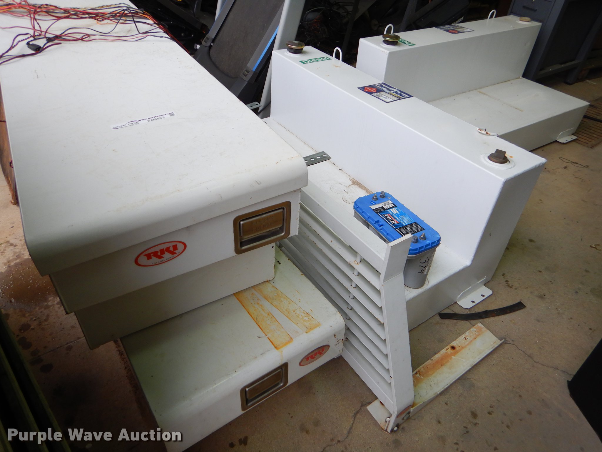 Purple Wave is selling a used Automotive Parts or Acces. in Texas. This item is a Automotive parts and accessories with the following: (2) steel headache racks, (3) toolboxes, (3) auxiliary fuel tanks, 90 gallon capacities