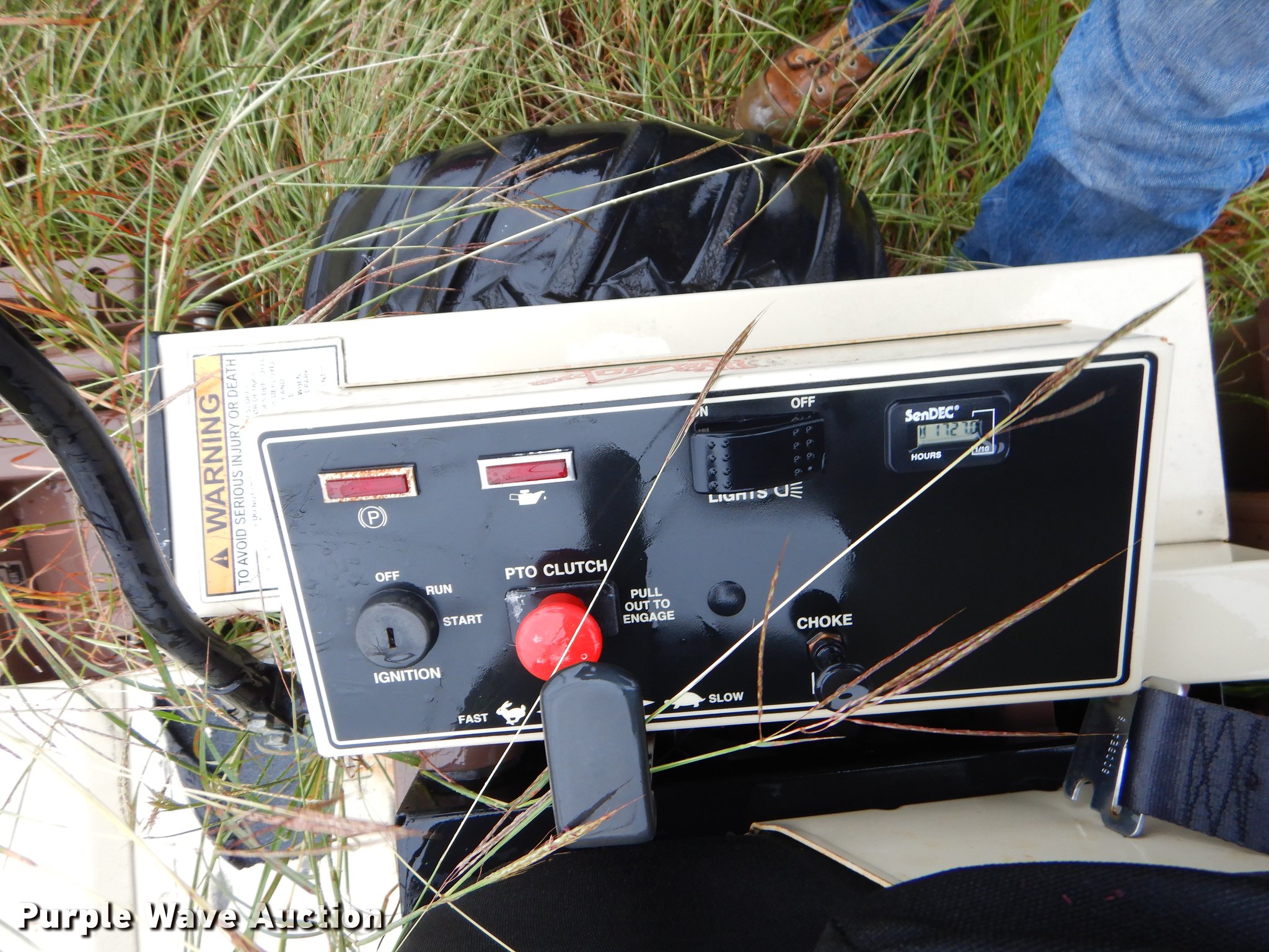 Purple Wave is selling a used Lawn Mower in Texas. This item is a Grasshopper 727K2 ZTR lawn mower with the following: 1,727 hours on meter, 52" cut, Kohler 27 HP gas engine, Hydrostatic transmission, ROPS, Serial 001185, PTO, Broken pulley, Unknown operating condition, Serial 55123