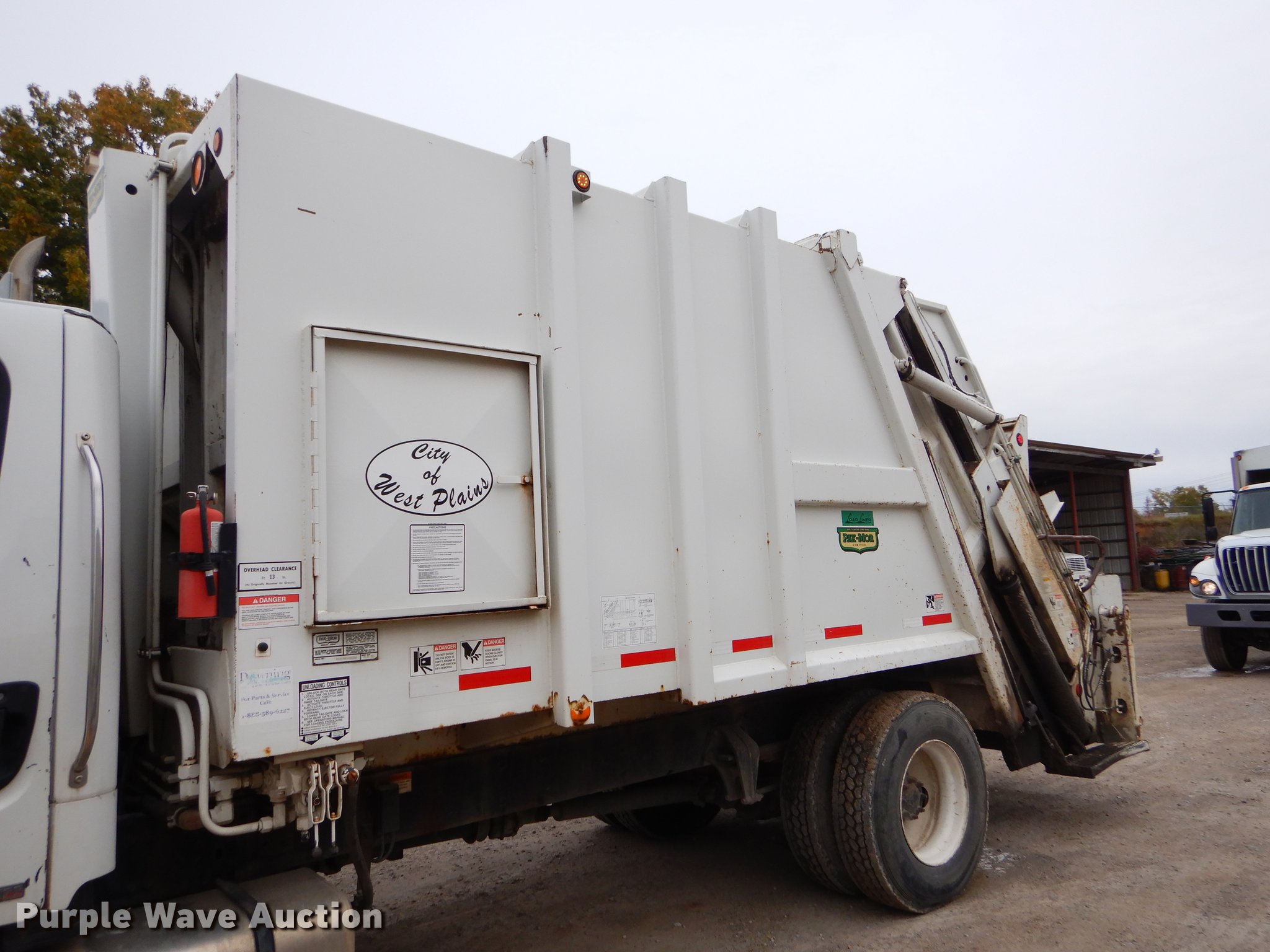 2007 Freightliner Business Class M2 refuse truck. 128,079 miles on odometer, 16,076 hours on meter, Mercedes-Benz MBE900 6.4L L6 turbo diesel engine, Allison automatic transmission, Single axle, AC and heat, Cruise, AM/FM, Air suspension seat, Backup camera, Tow hooks, PTO, Park-Mor Limited refuse bed 20 yd. capacity, Hydraulic winch, Rear load, Serial PMLR220B002151307, Single fuel tank, Air suspension, Air brakes, 208" wheelbase, 11R22.5 tires, GVWR 33,000 lbs, Non-operational backup camera, Windshield broken, Driver side door issues. Missouri title. 1FVACXCS57DY49016. City of West Plains. 1910 Holiday Ln. West Plains, MO 65775