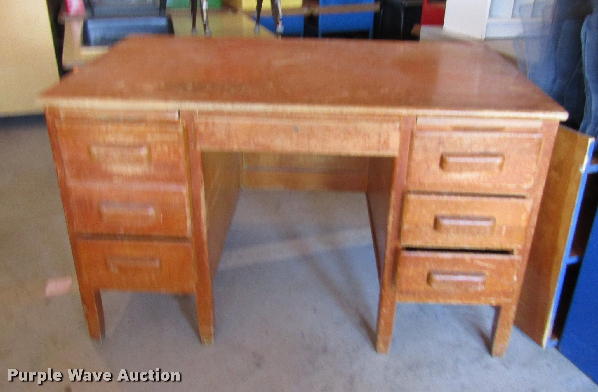 Purple Wave is selling a used Furniture in Nebraska. This item is a Furniture with the following: (2) wood tables, 64"L x 32"W x 25.5"H, Wood table with metal base, 47"L x 23.5"W x 30"H, Seven drawer wood desk, 49.5"L x 30"W x 30"H, Six drawer wood desk, 66"L x 36"W x 29.5"H, Side table