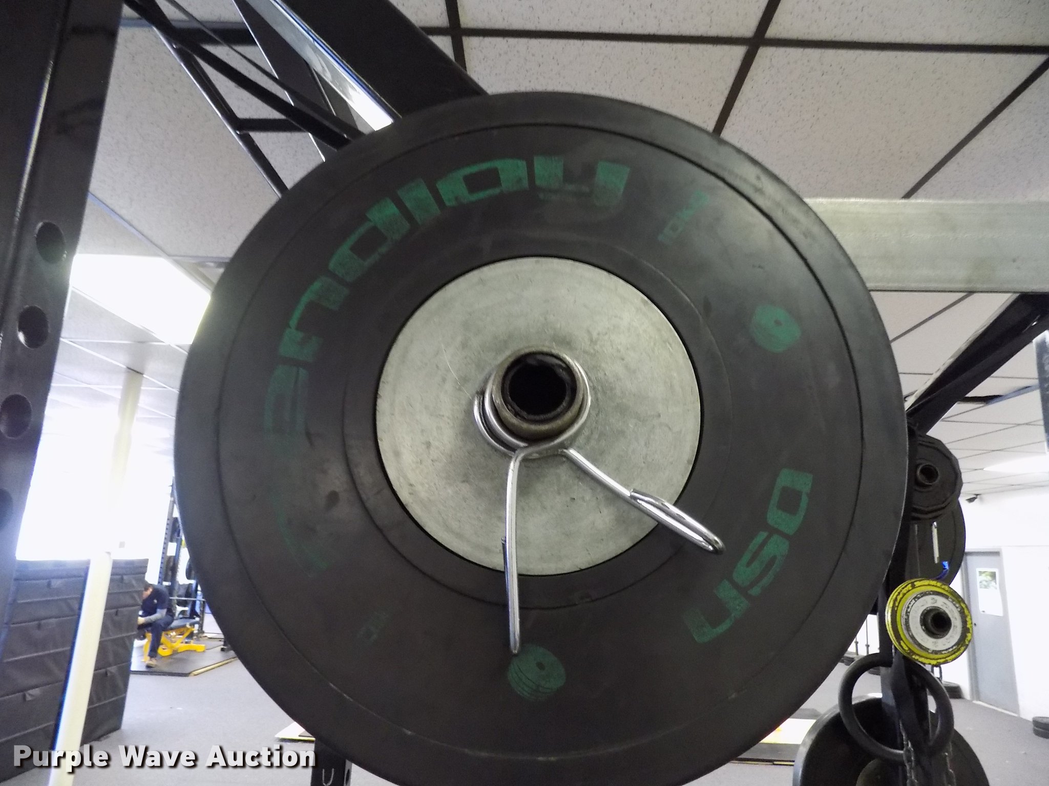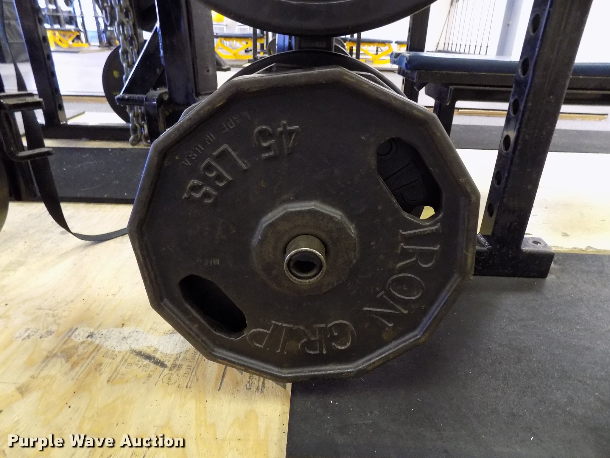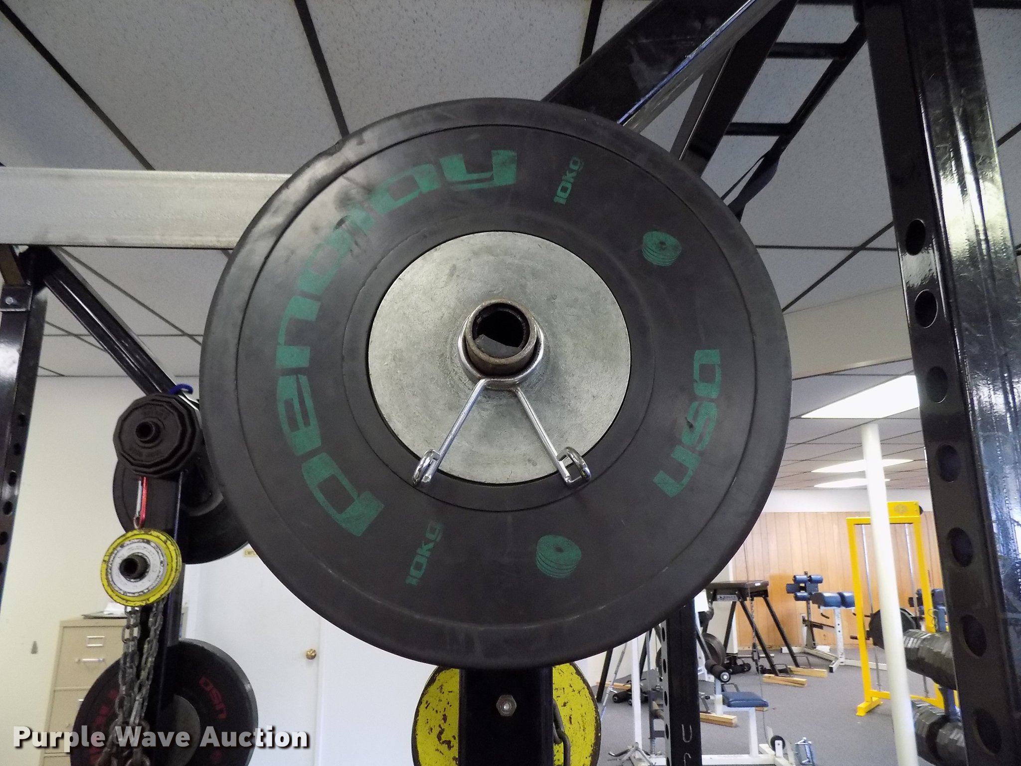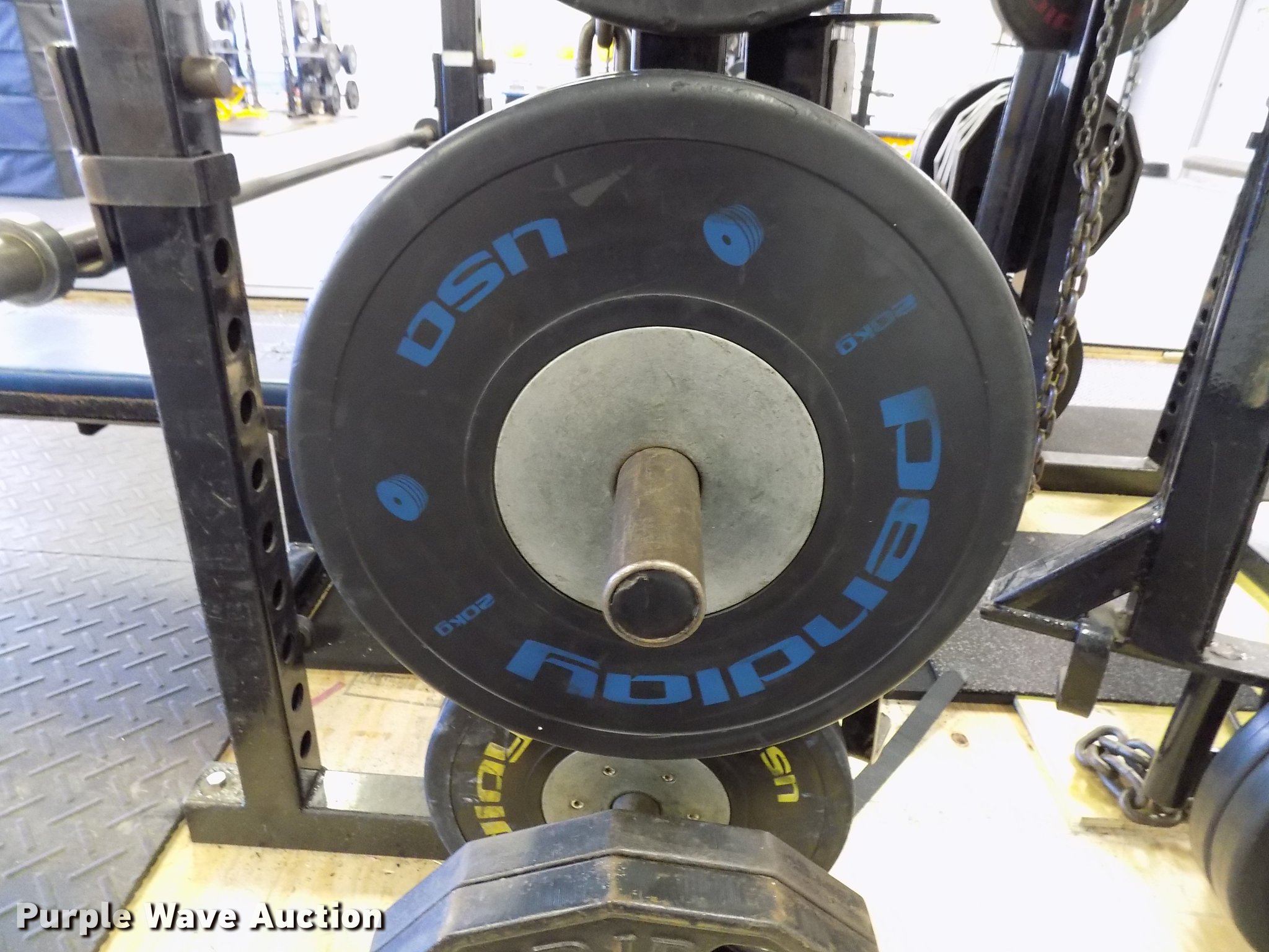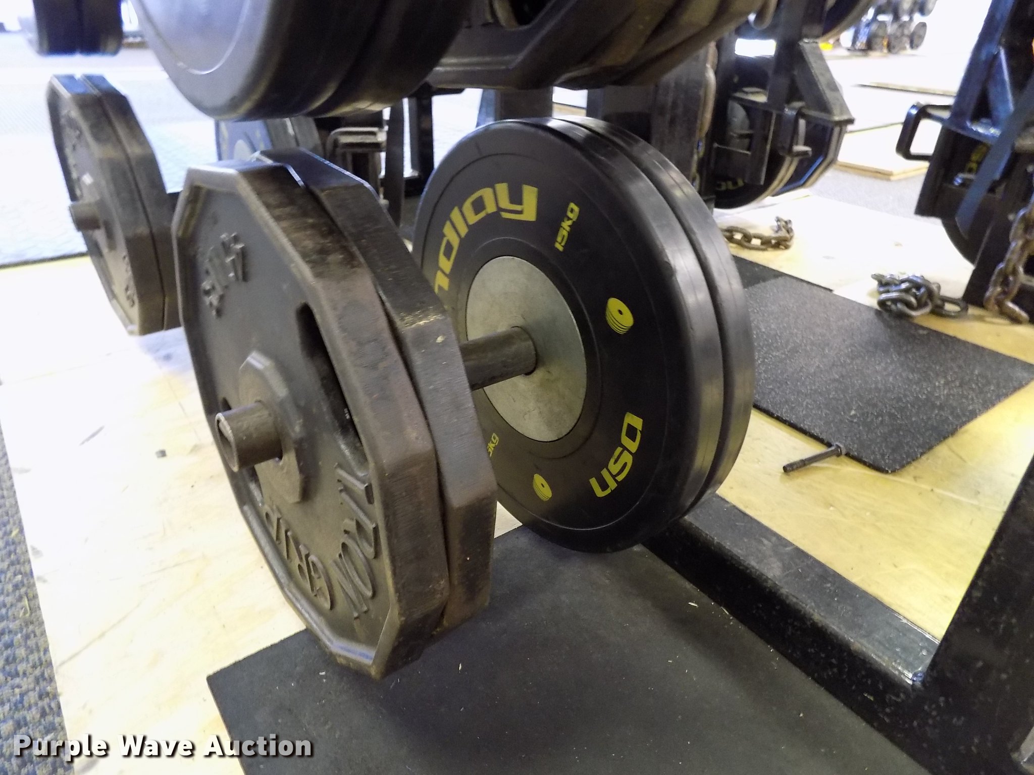 Purple Wave is selling a used Sporting Goods in Oklahoma. This item is a Weight lifting equipment with the following: Iron Grip/Pendlay free weight lifting system, Dual lifting stations, (2) hammer strength adjustable benches, (2) Olympic HD Nexgen lifting bars, (24) 45 lbs weights, (4) 25 kg weights, (8) 20 kg weights, (8) 15 kg weights, (4) 10 kg weights, (4) 5 kg weights, (4) 10 lbs weights, (4) 5 lbs weights, (4) 2.5 lbs weights, (8) 1.5 kg weights, (8) 0.5 kg weights, Chain sets, Chain carribeaners, Rings and clasps, Wood bases and mats not included