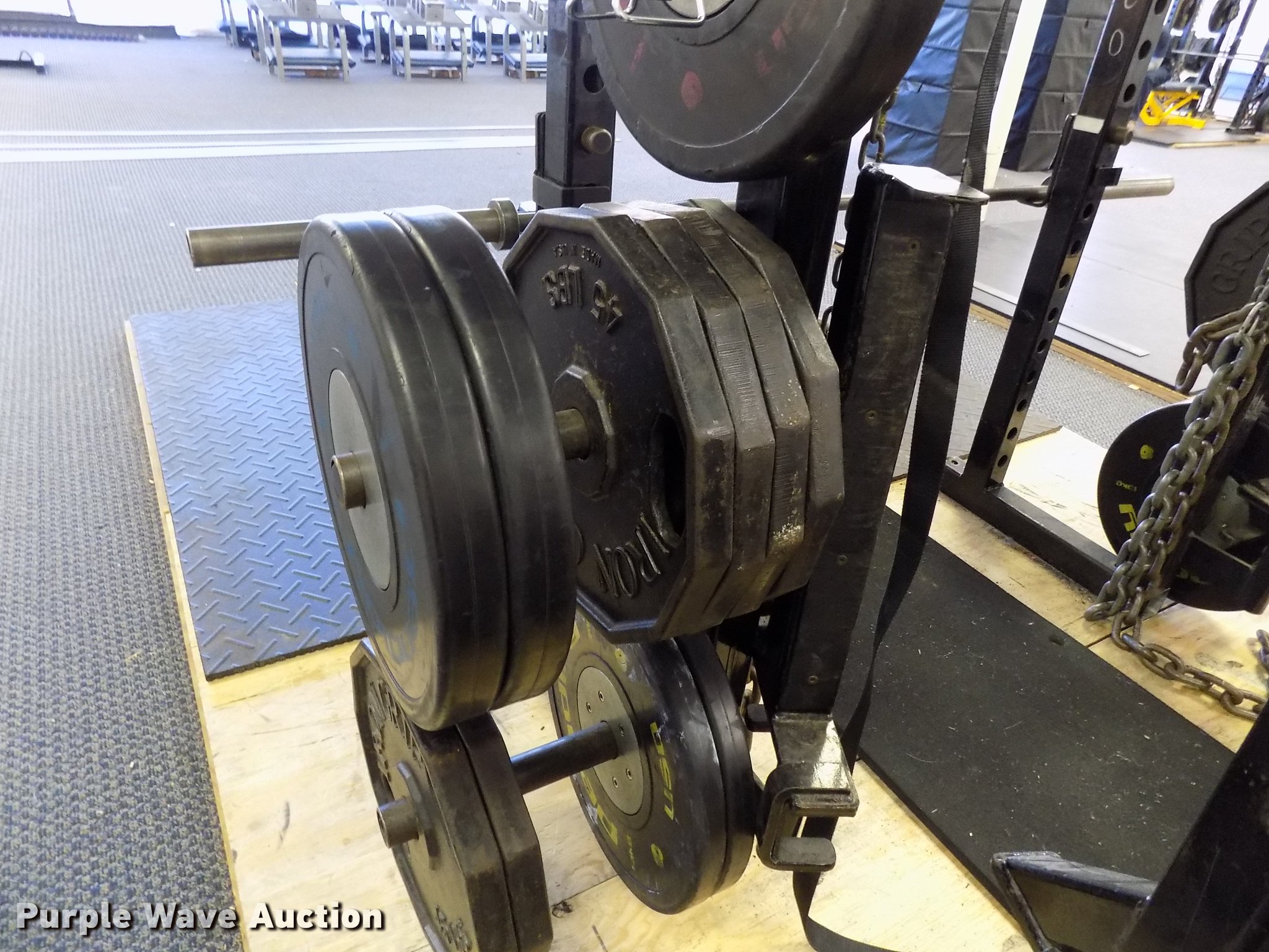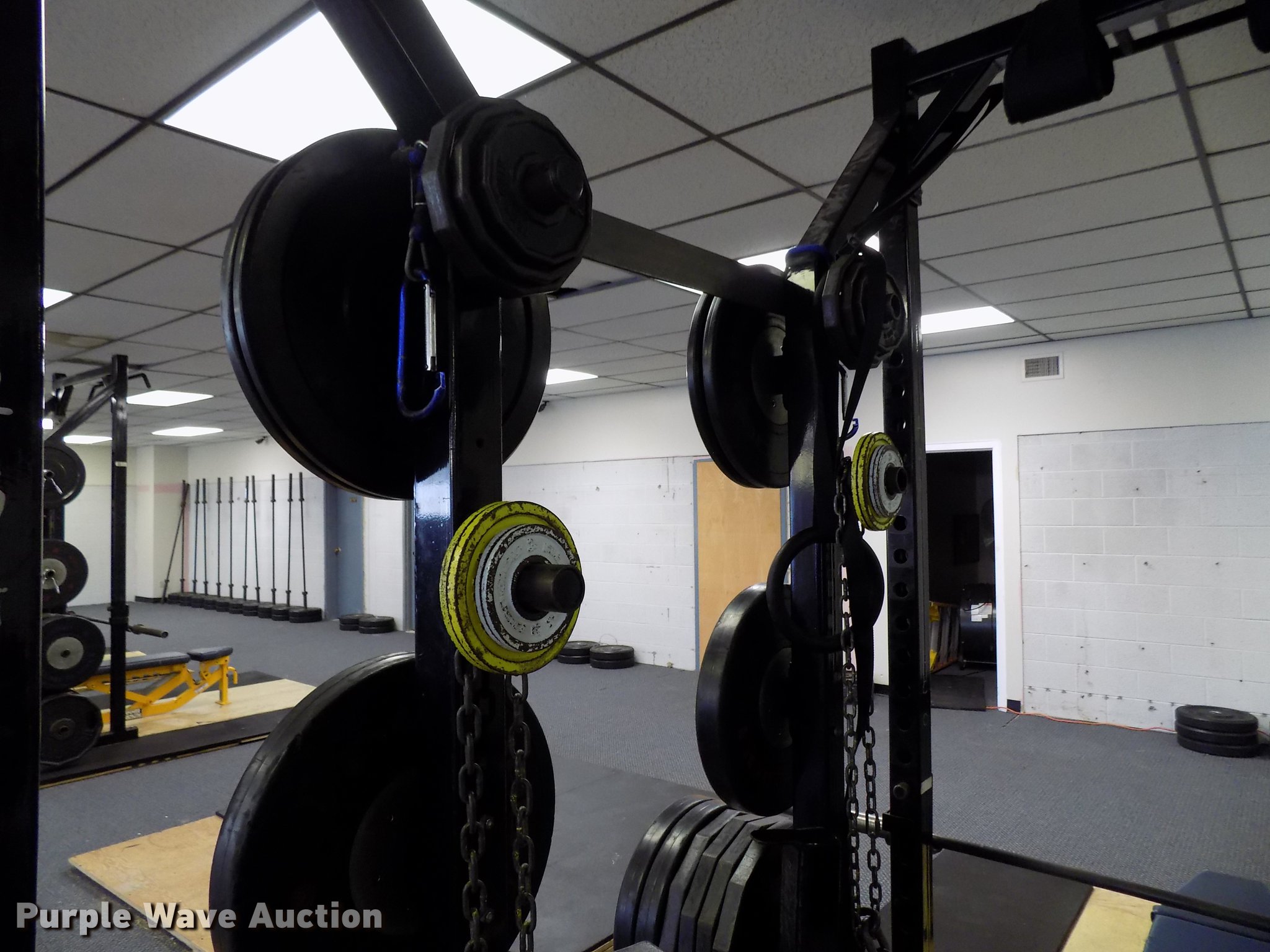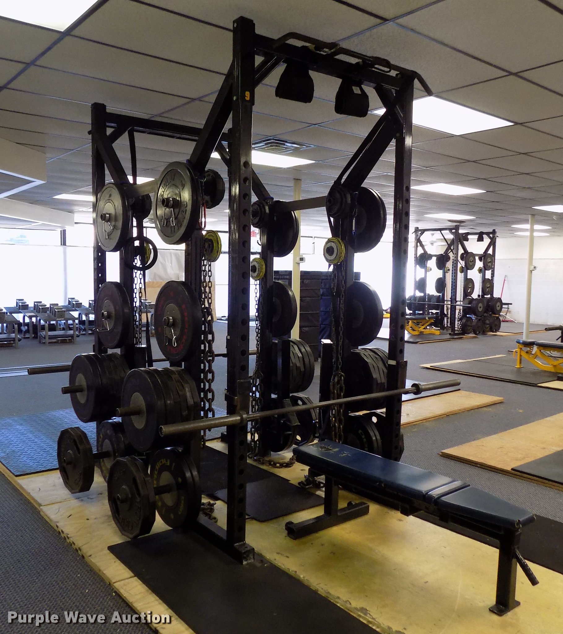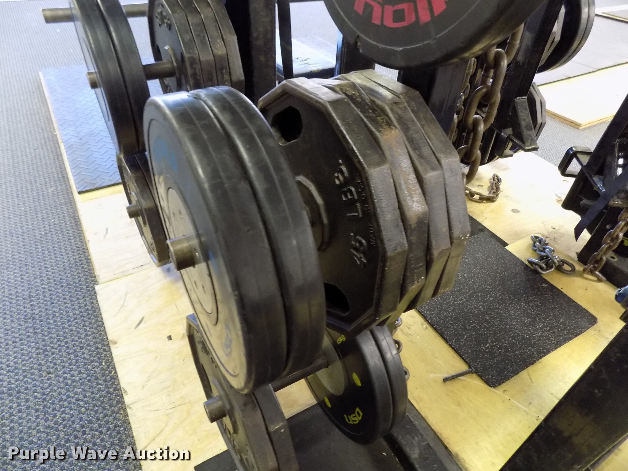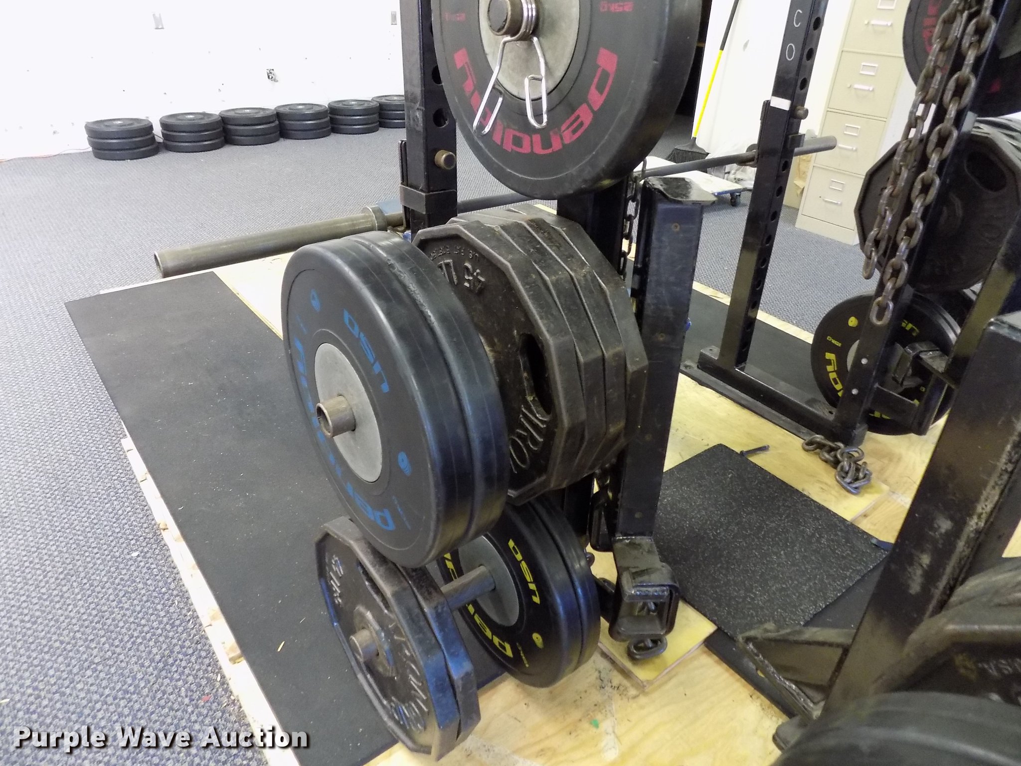 Purple Wave is selling a used Sporting Goods in Oklahoma. This item is a Weight lifting equipment with the following: Iron Grip/Pendlay free weight lifting system, Dual lifting stations, (2) hammer strength adjustable benches, (2) Olympic HD Nexgen lifting bars, (24) 45 lbs weights, (4) 25 kg weights, (8) 20 kg weights, (8) 15 kg weights, (4) 10 kg weights, (4) 5 kg weights, (4) 10 lbs weights, (4) 5 lbs weights, (4) 2.5 lbs weights, (8) 1.5 kg weights, (8) 0.5 kg weights, Chain sets, Chain carribeaners, Rings and clasps, Wood bases and mats not included