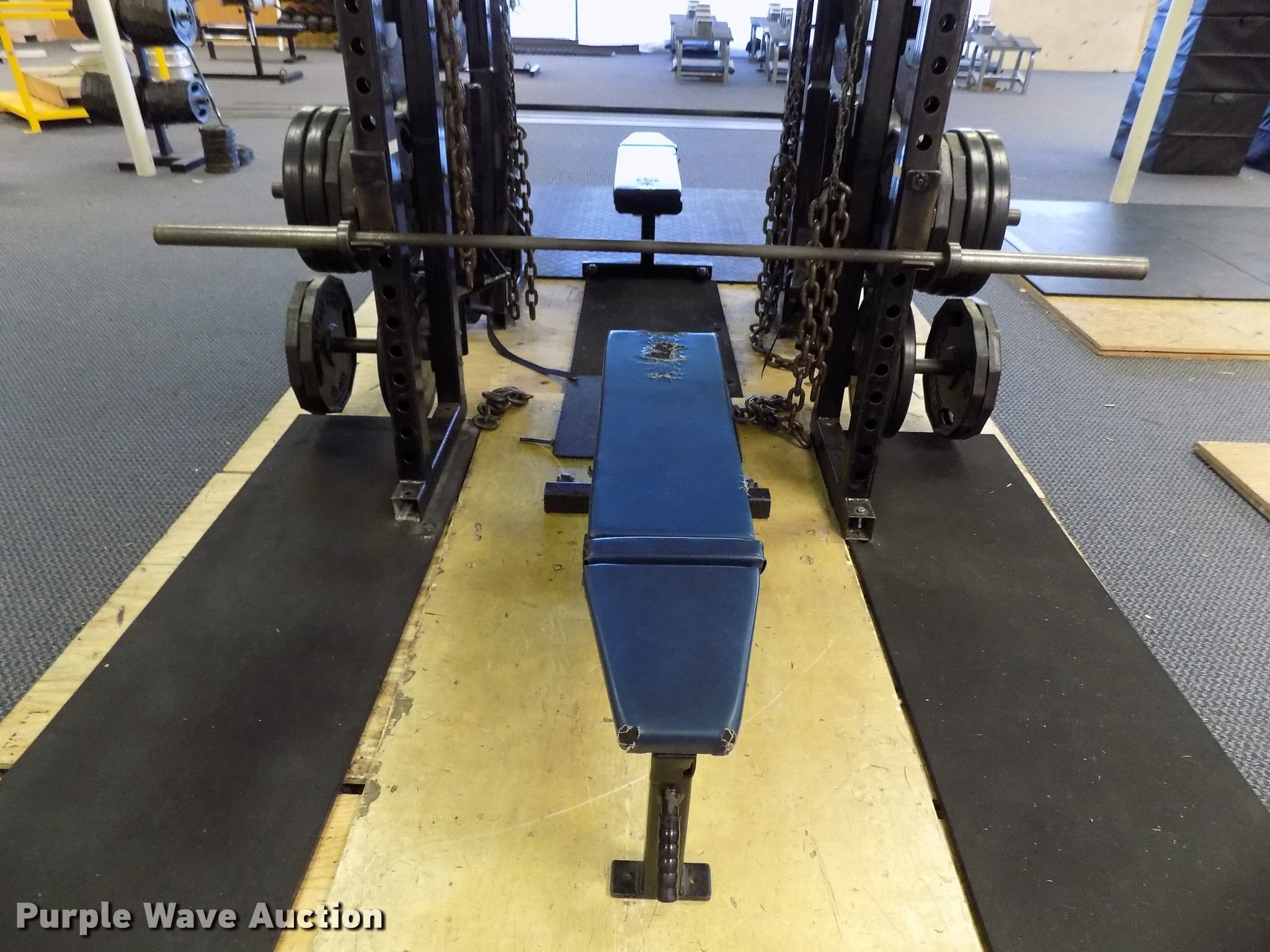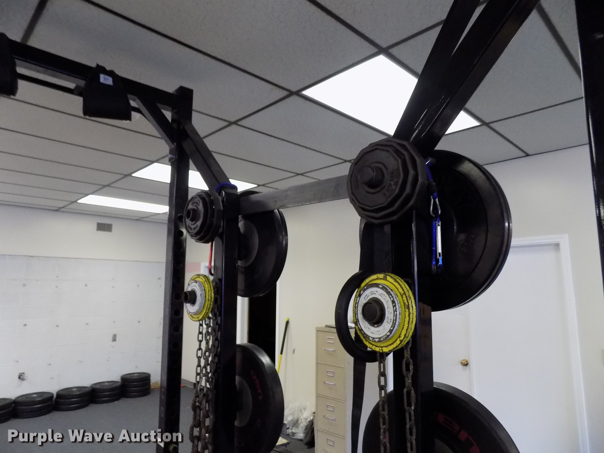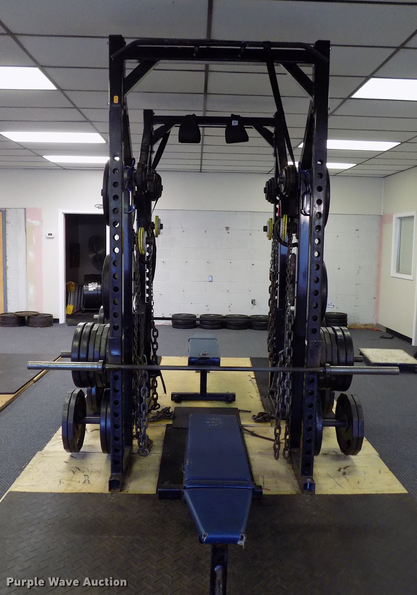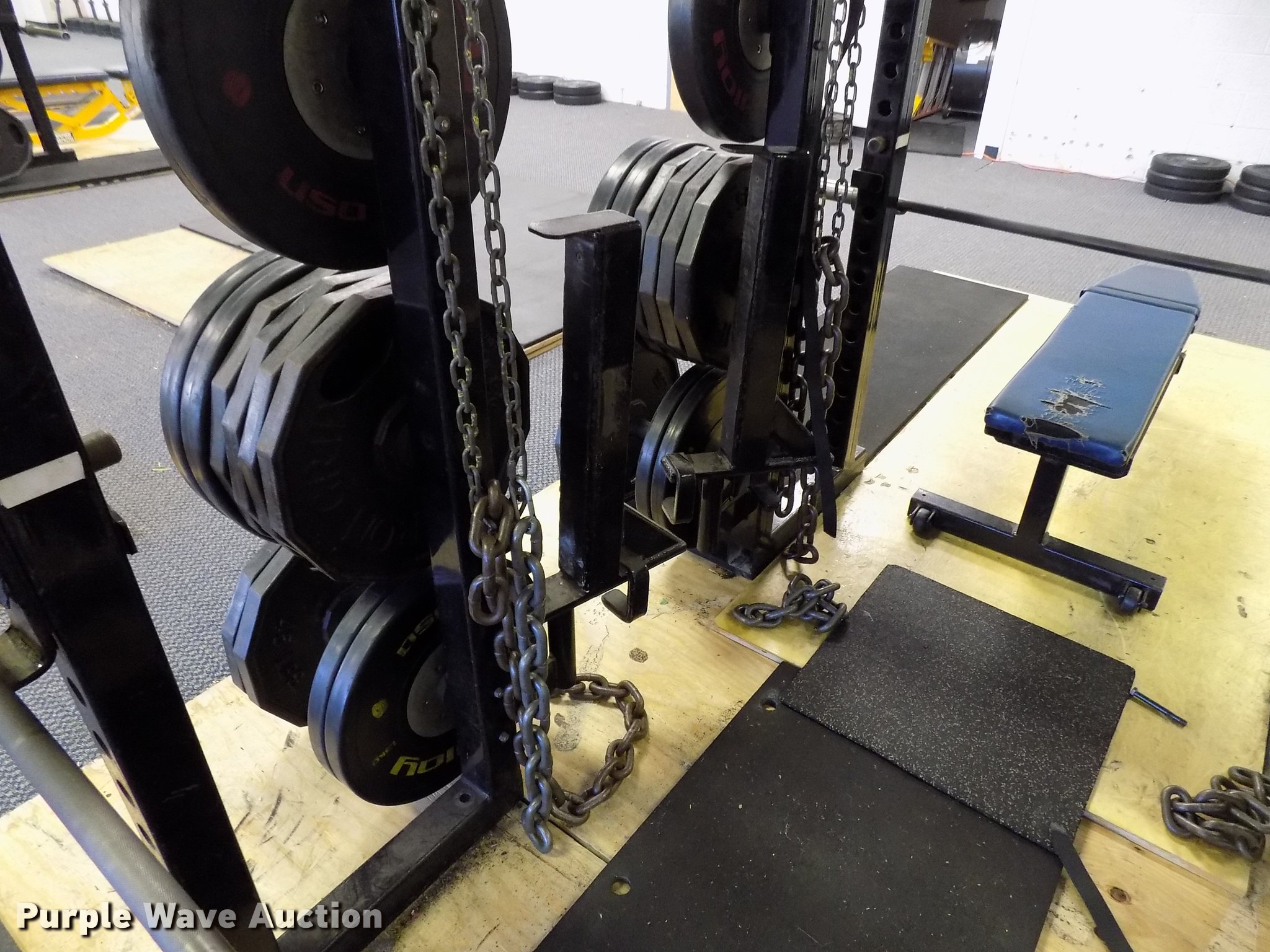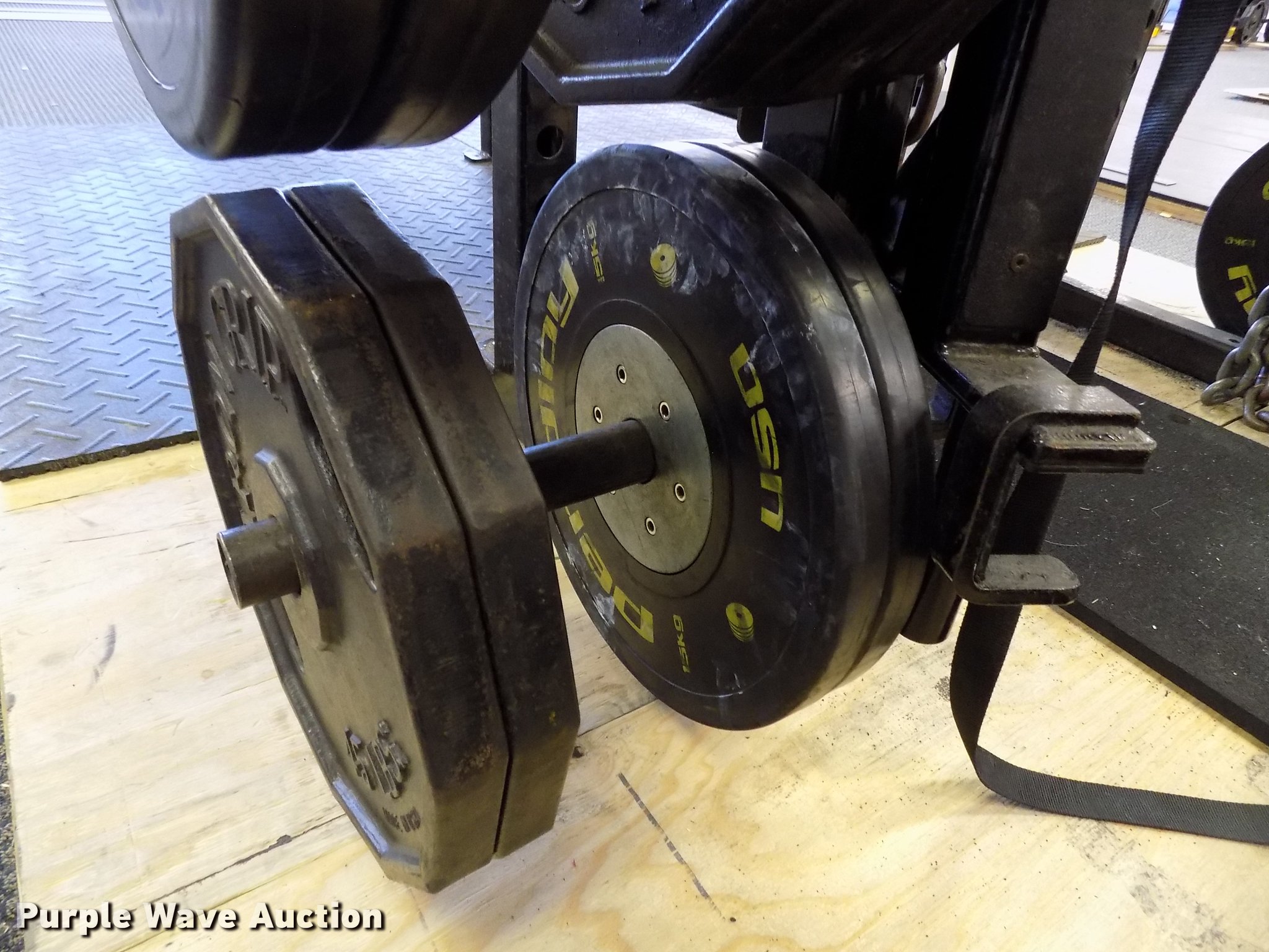 Purple Wave is selling a used Sporting Goods in Oklahoma. This item is a Weight lifting equipment with the following: Iron Grip/Pendlay free weight lifting system, Dual lifting stations, (2) hammer strength adjustable benches, (2) Olympic HD Nexgen lifting bars, (24) 45 lbs weights, (4) 25 kg weights, (8) 20 kg weights, (8) 15 kg weights, (4) 10 kg weights, (4) 5 kg weights, (4) 10 lbs weights, (4) 5 lbs weights, (4) 2.5 lbs weights, (8) 1.5 kg weights, (8) 0.5 kg weights, Chain sets, Chain carribeaners, Rings and clasps, Wood bases and mats not included