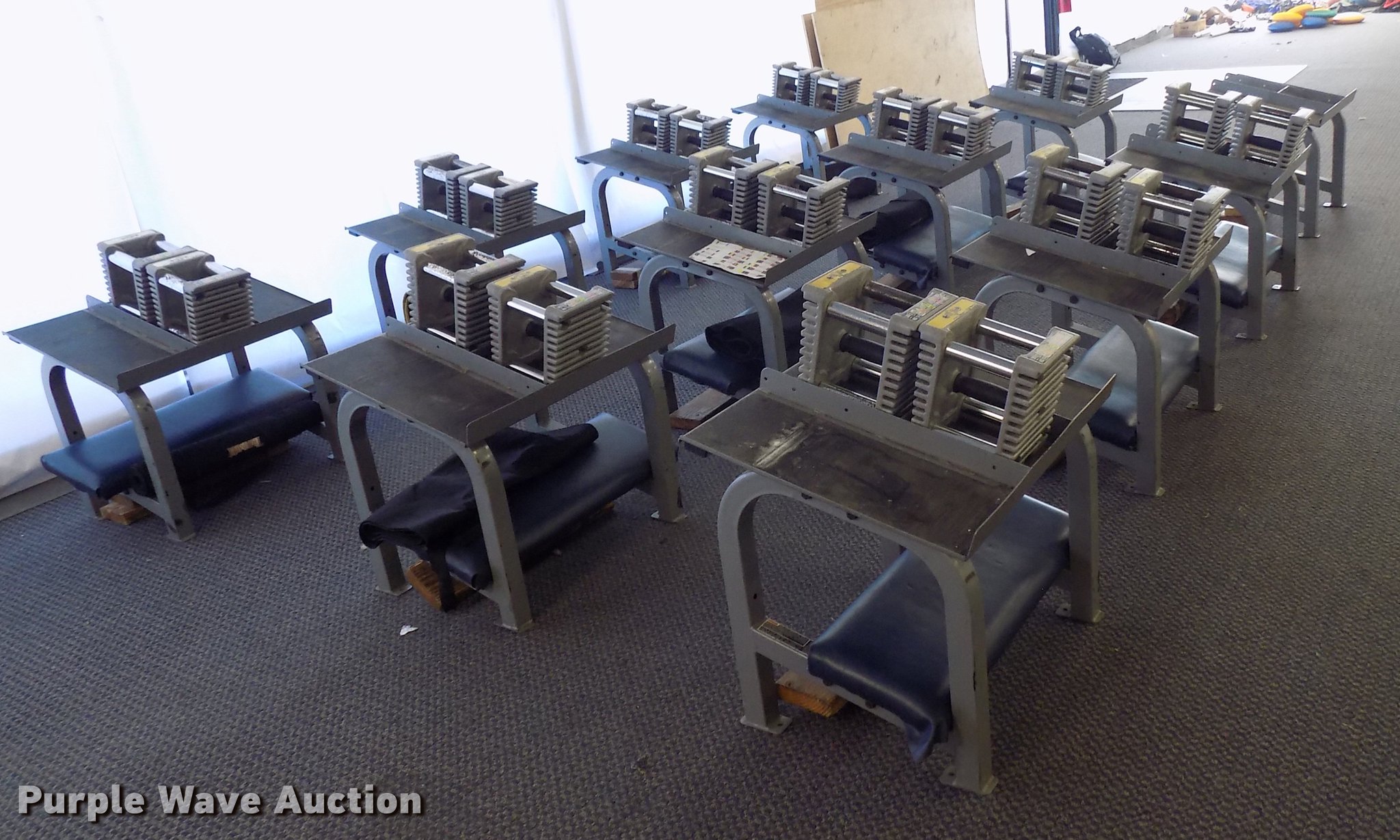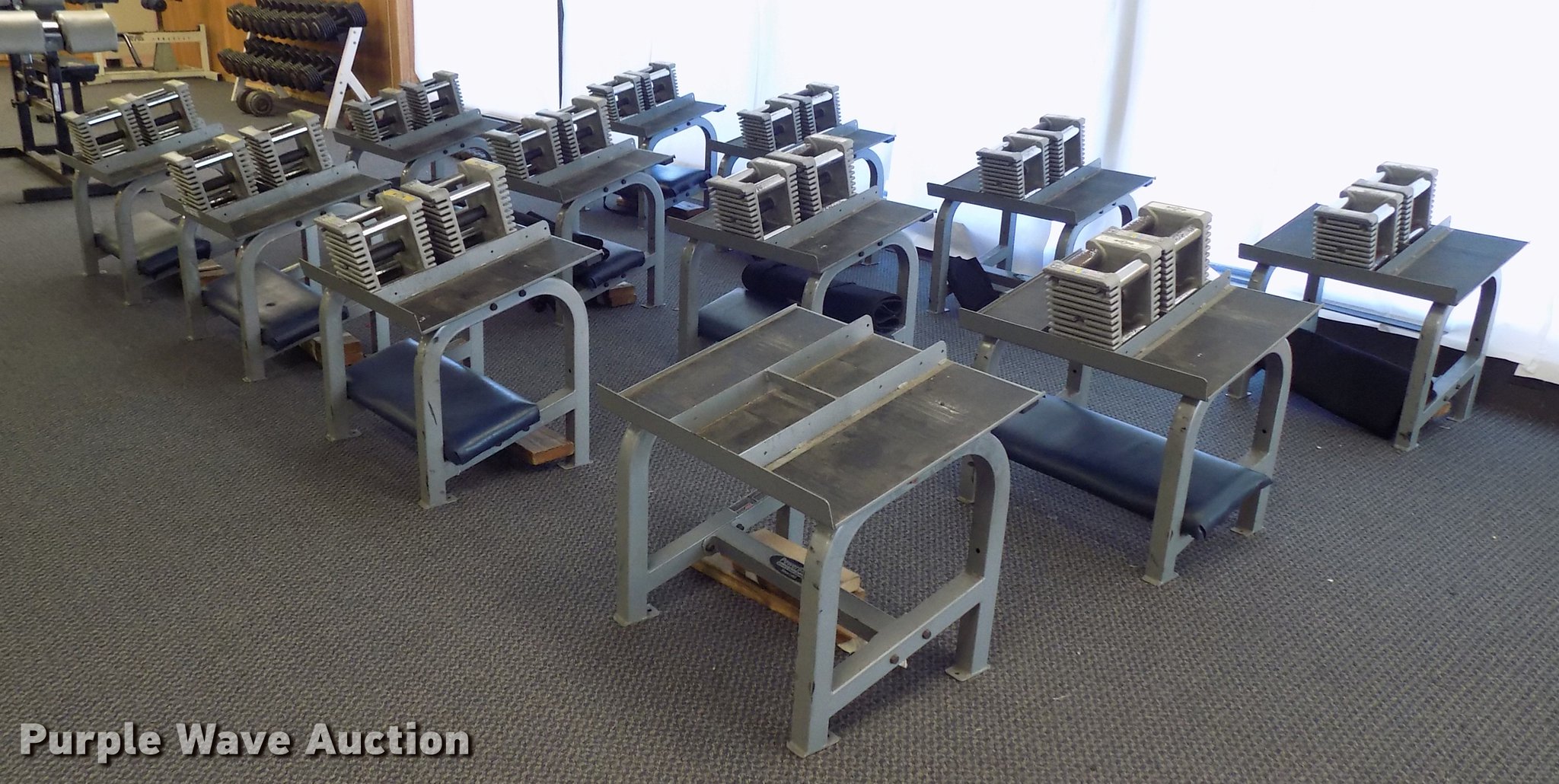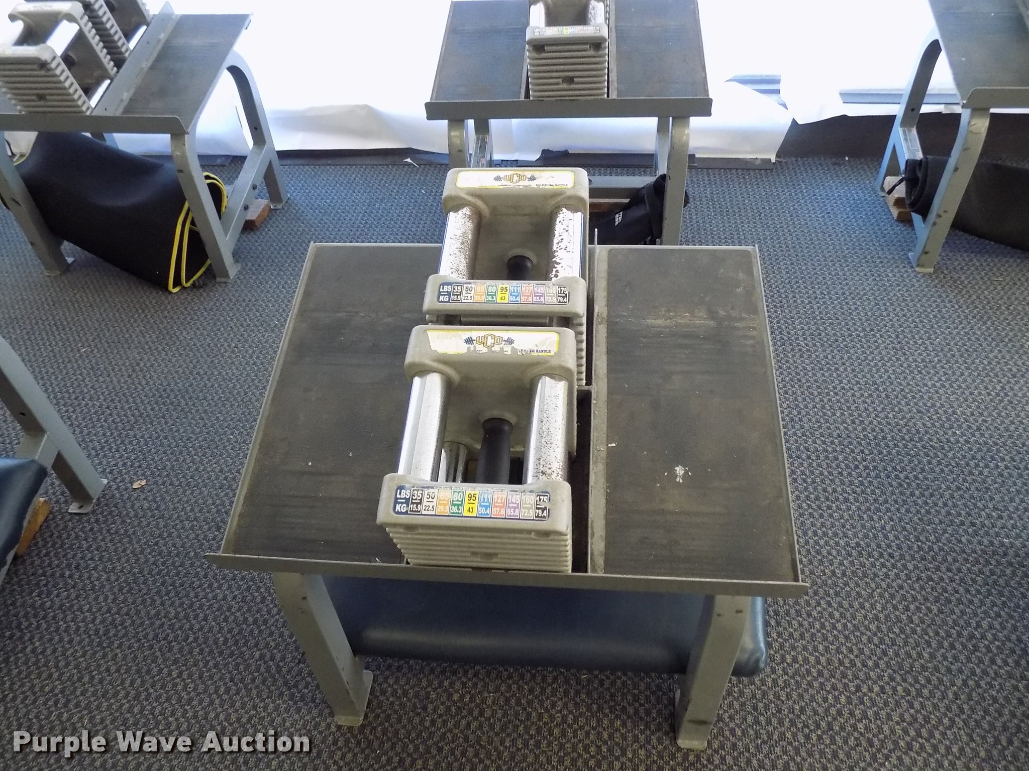 Purple Wave is selling a used Sporting Goods in Oklahoma. This item is a (12) PowerBlock dumbbell free weight stations with the following: Dumbbell base, Stand, Pads
