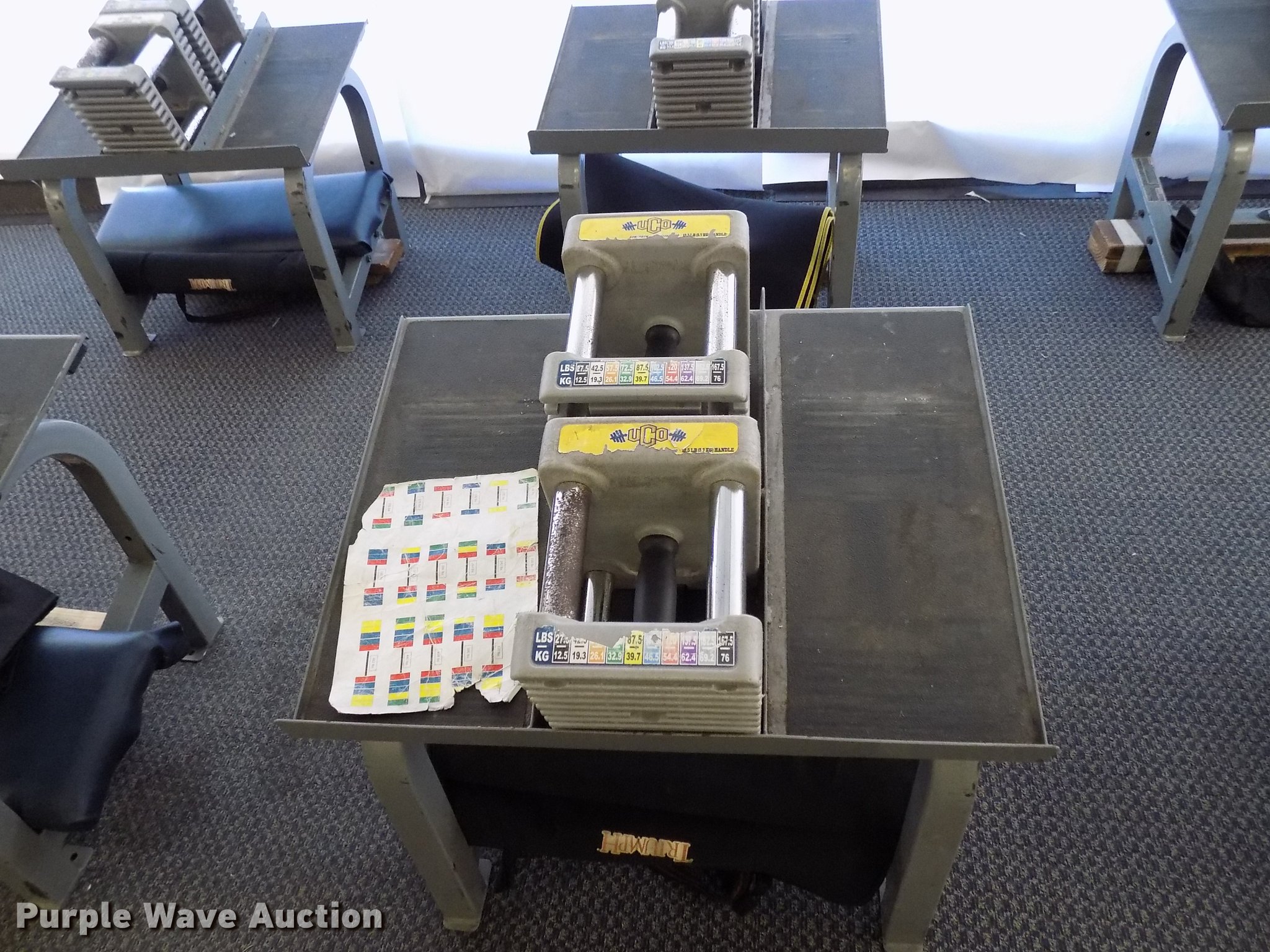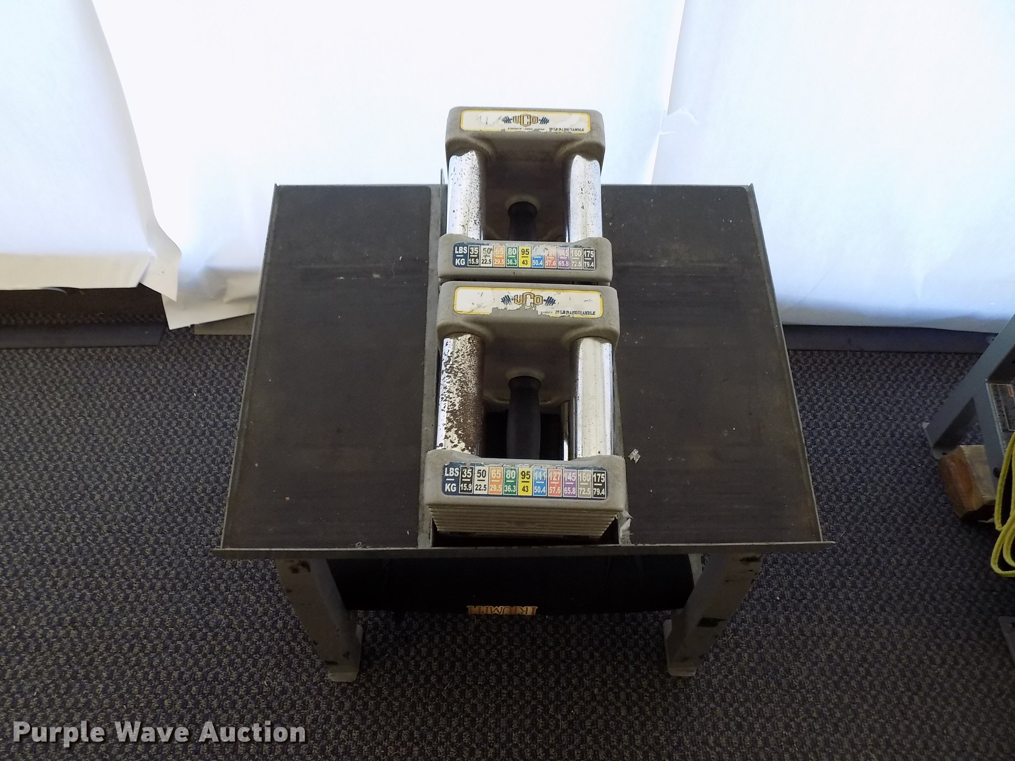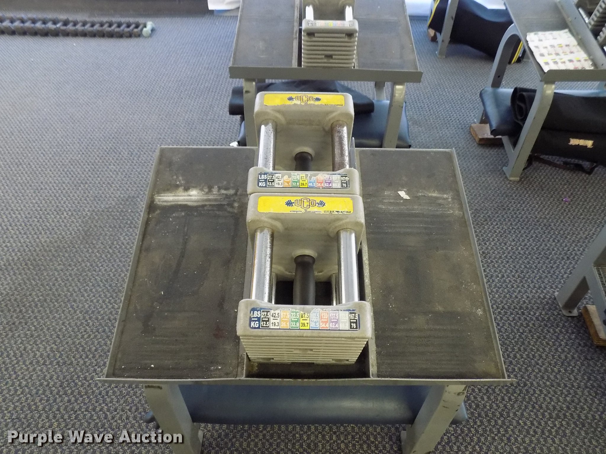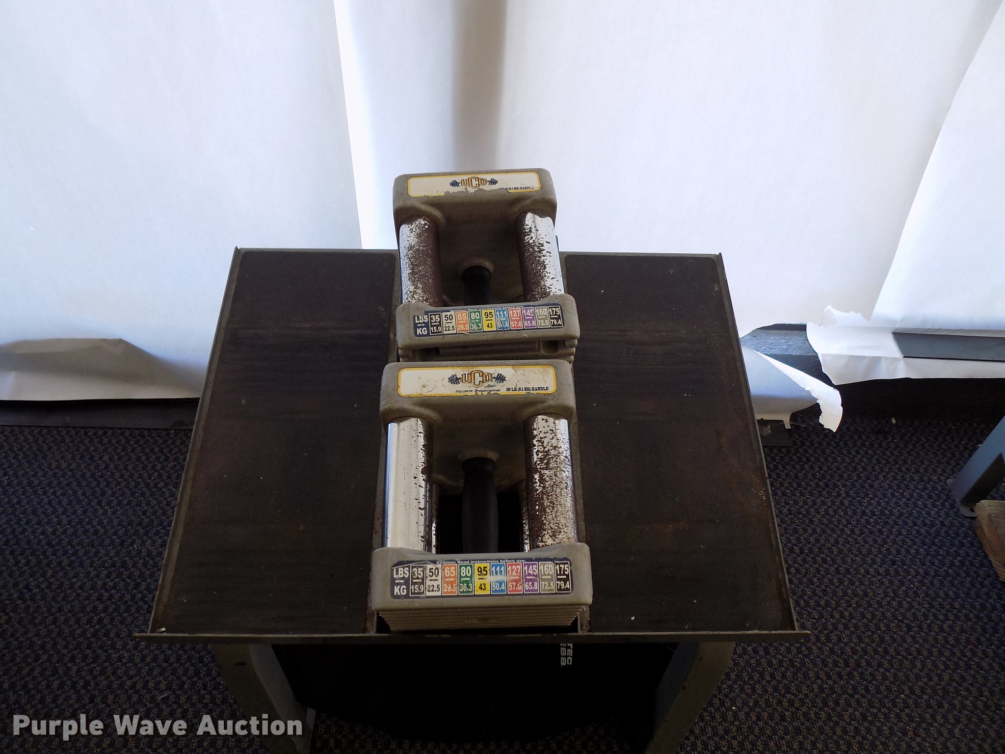 Purple Wave is selling a used Sporting Goods in Oklahoma. This item is a (12) PowerBlock dumbbell free weight stations with the following: Dumbbell base, Stand, Pads