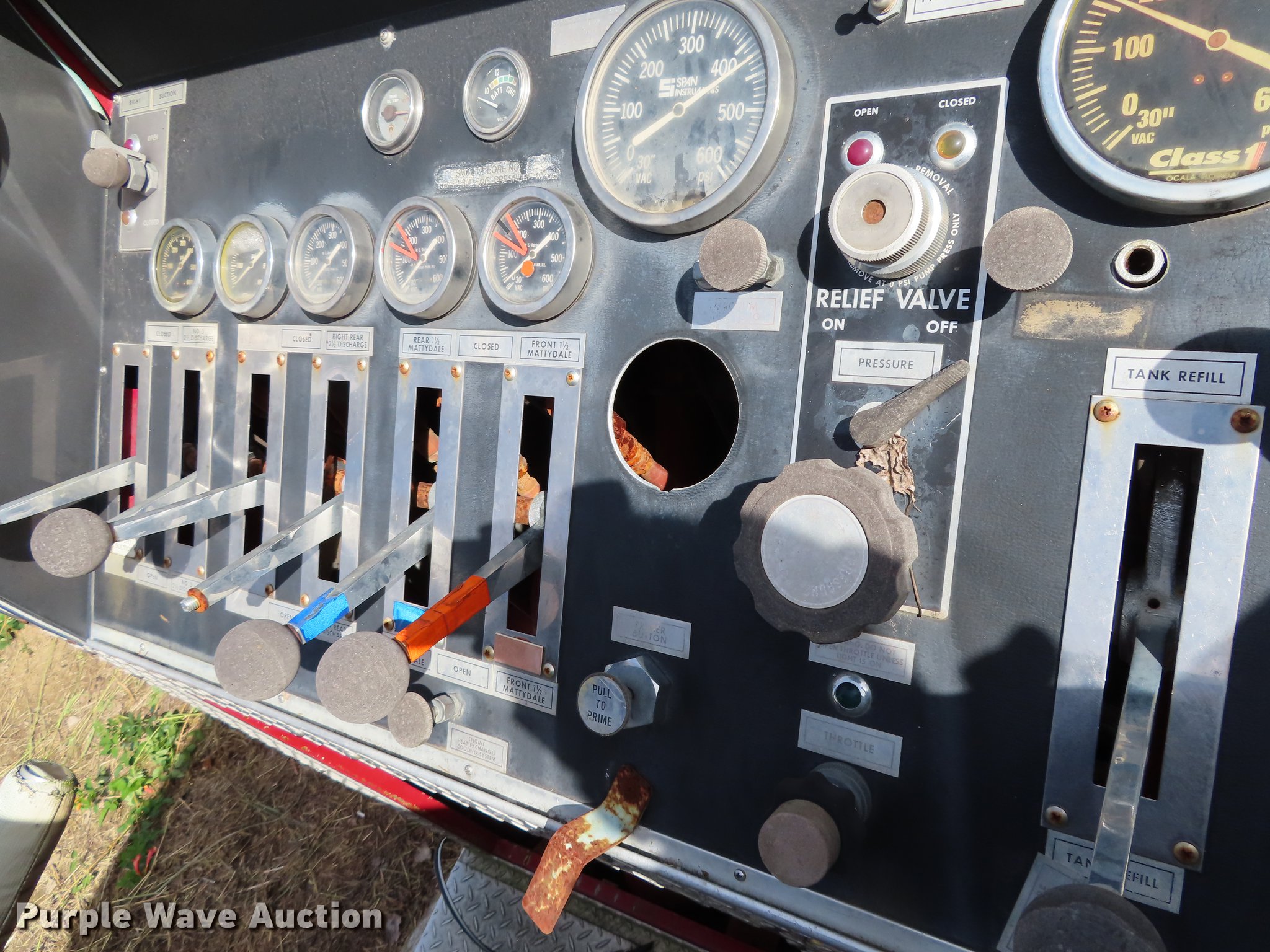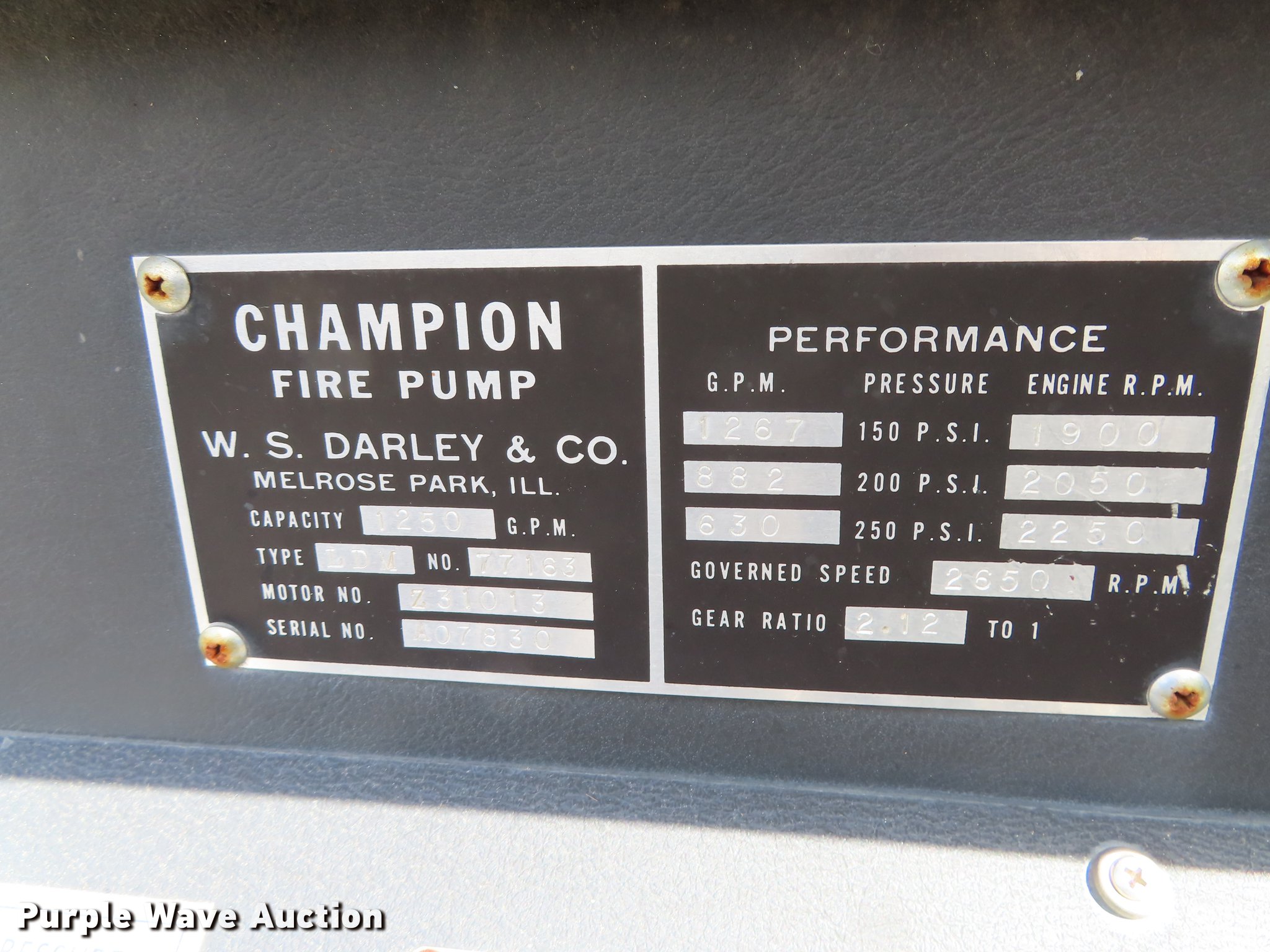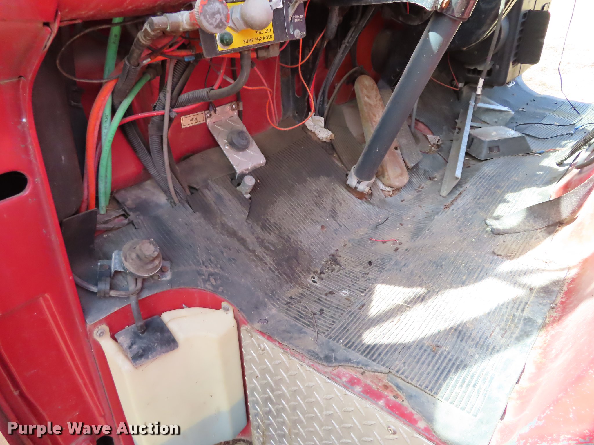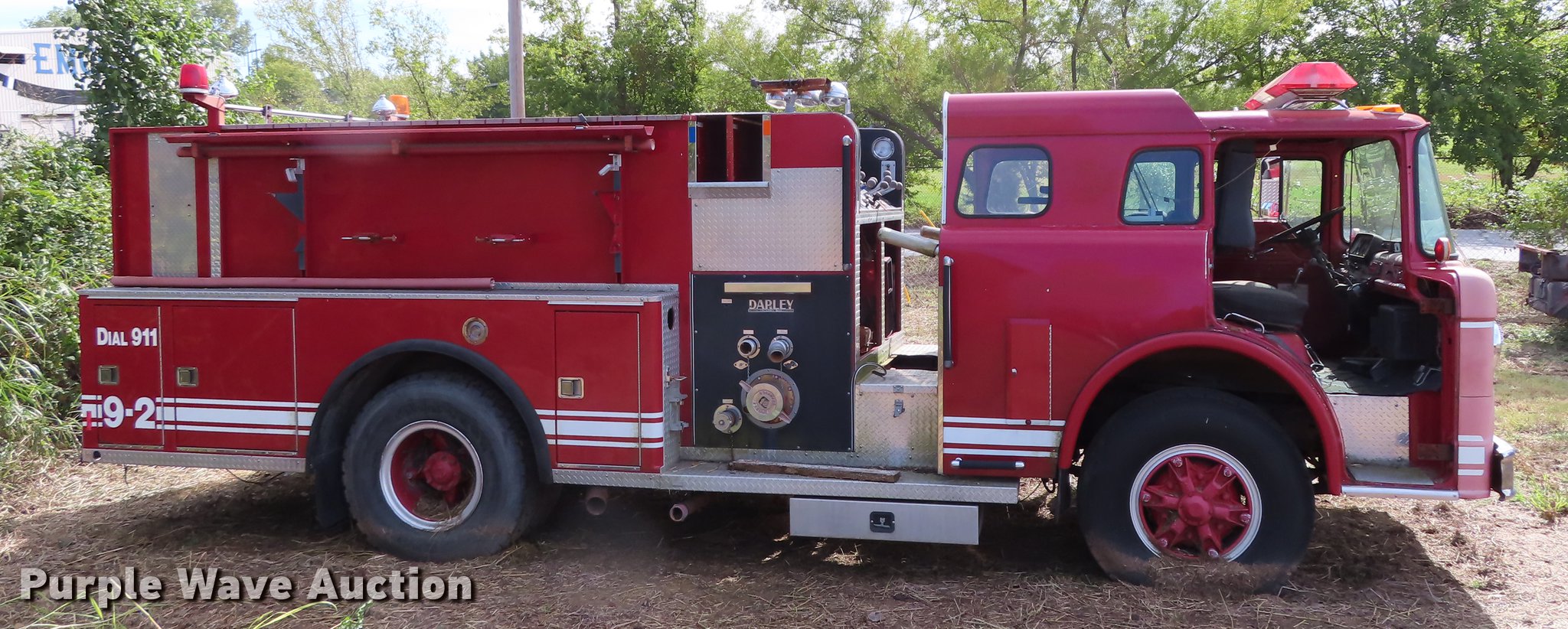 Purple Wave is selling a used Fire Truck or Emergency Vehicle in Oklahoma. This item is a 1987 Ford C8000 fire truck with the following: 5,719 miles on odometer, 2,287 hours on meter, Caterpillar 3208 eight cylinder turbo diesel engine, No transmission, Heat, Air horn, Darley fire apparatus, 1,250 gallon per minute pump, 500 gallon per minute capacity water gun, Air brakes, 11.00R20 tires, GVWR 35,000 lbs, Non-operational unit, No transmission, Tank bad