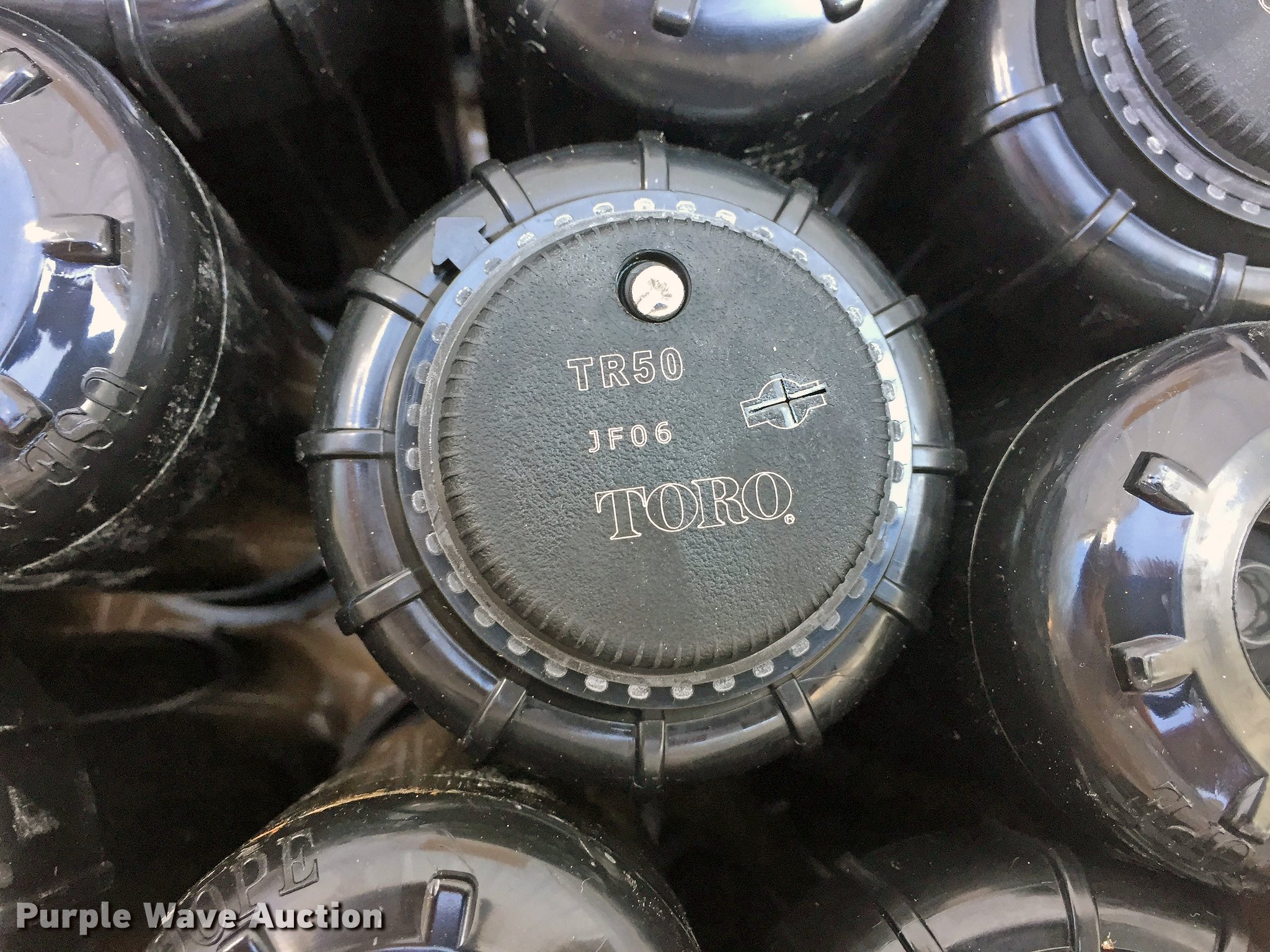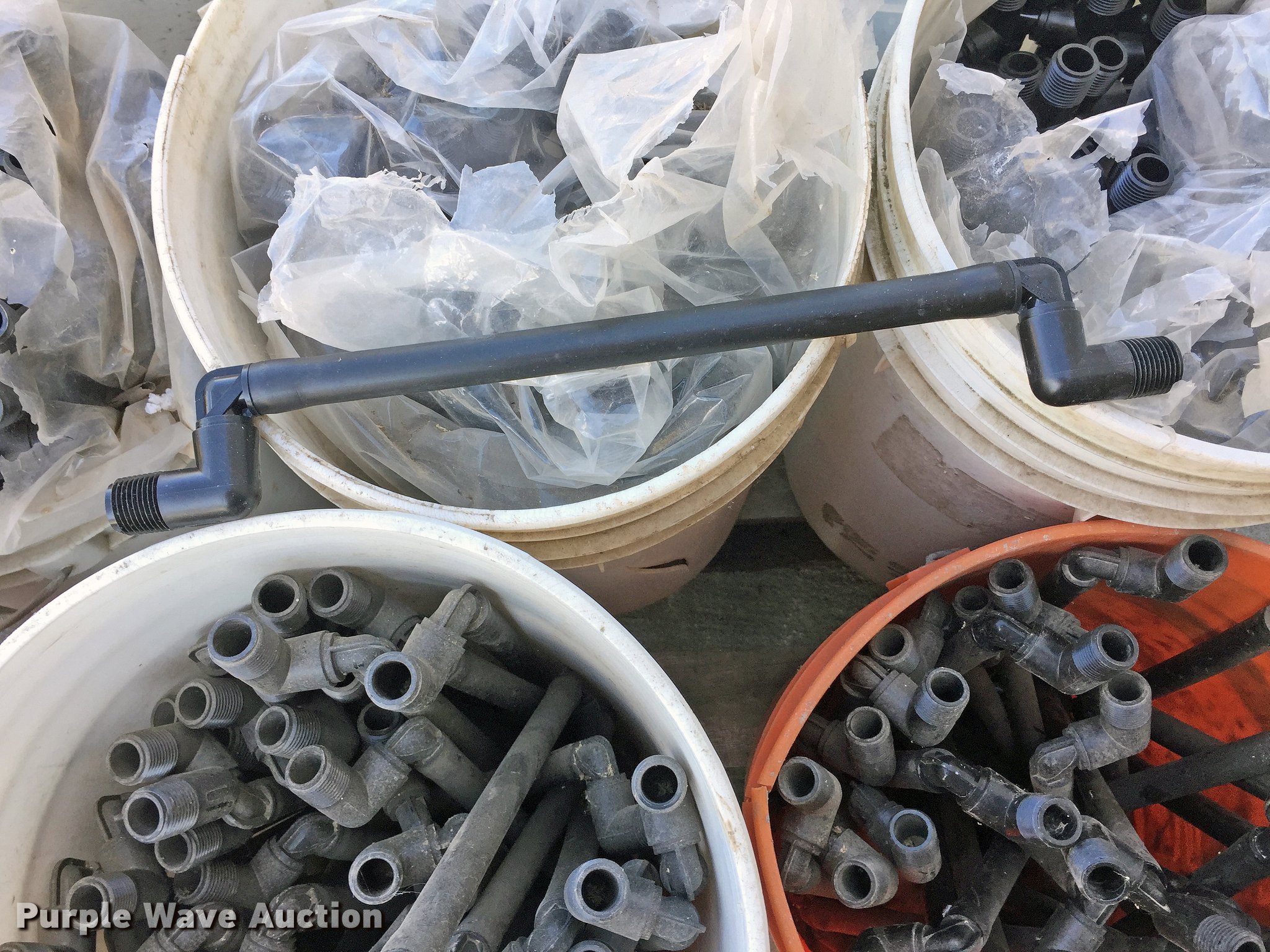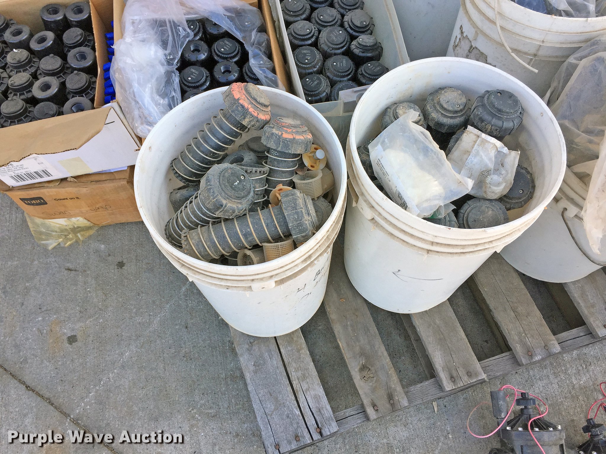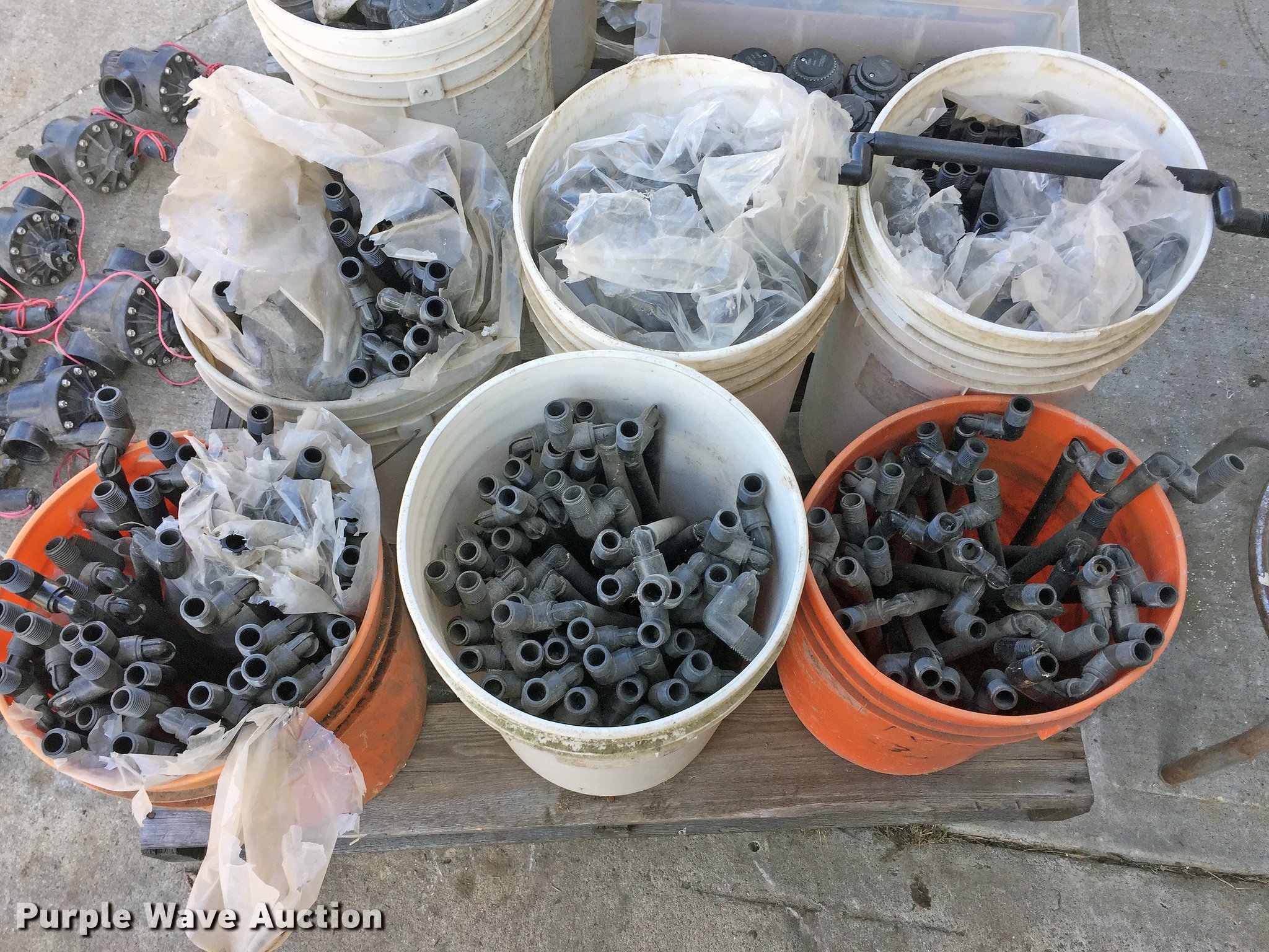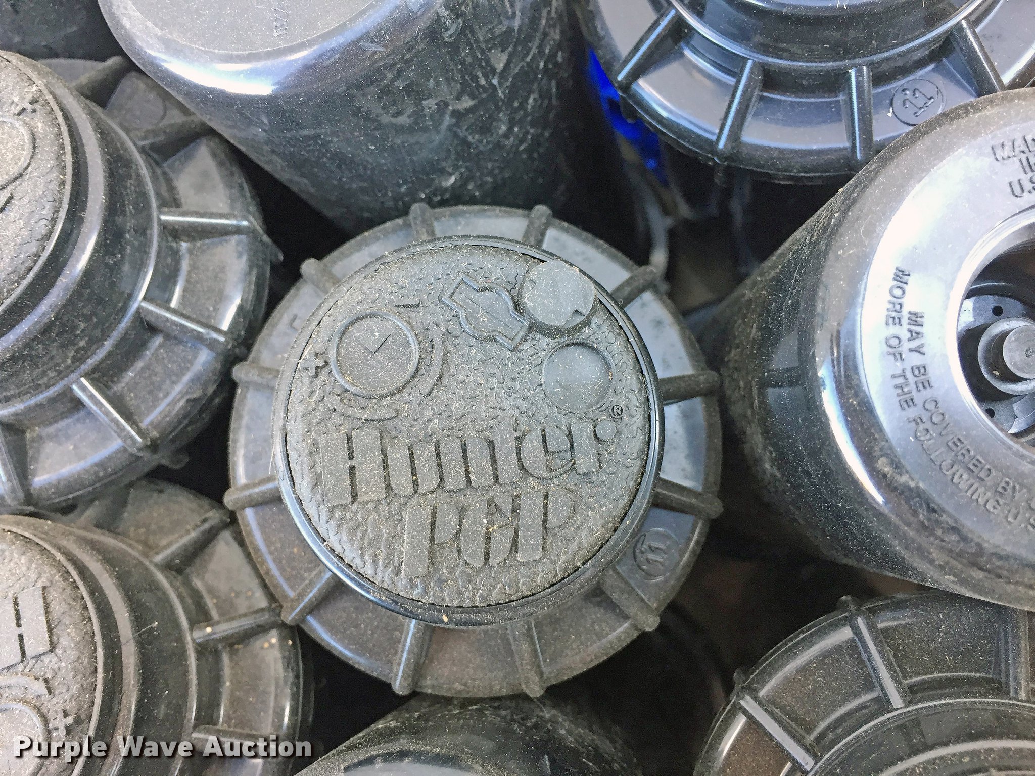 Purple Wave is selling a used Irrigation Equip. Attach. in Missouri. This item is a Sprinkler heads and valves with the following: (56) sprinkler heads, Unused, (6) 1.5" Hunter valves, Unused, 2" Hunter valve, Unused, (6) 5-gallon buckets of 1/2" flex adapters, (2) 5-gallon buckets sprinkler heads, (9) valve boxes, Drain inlet box