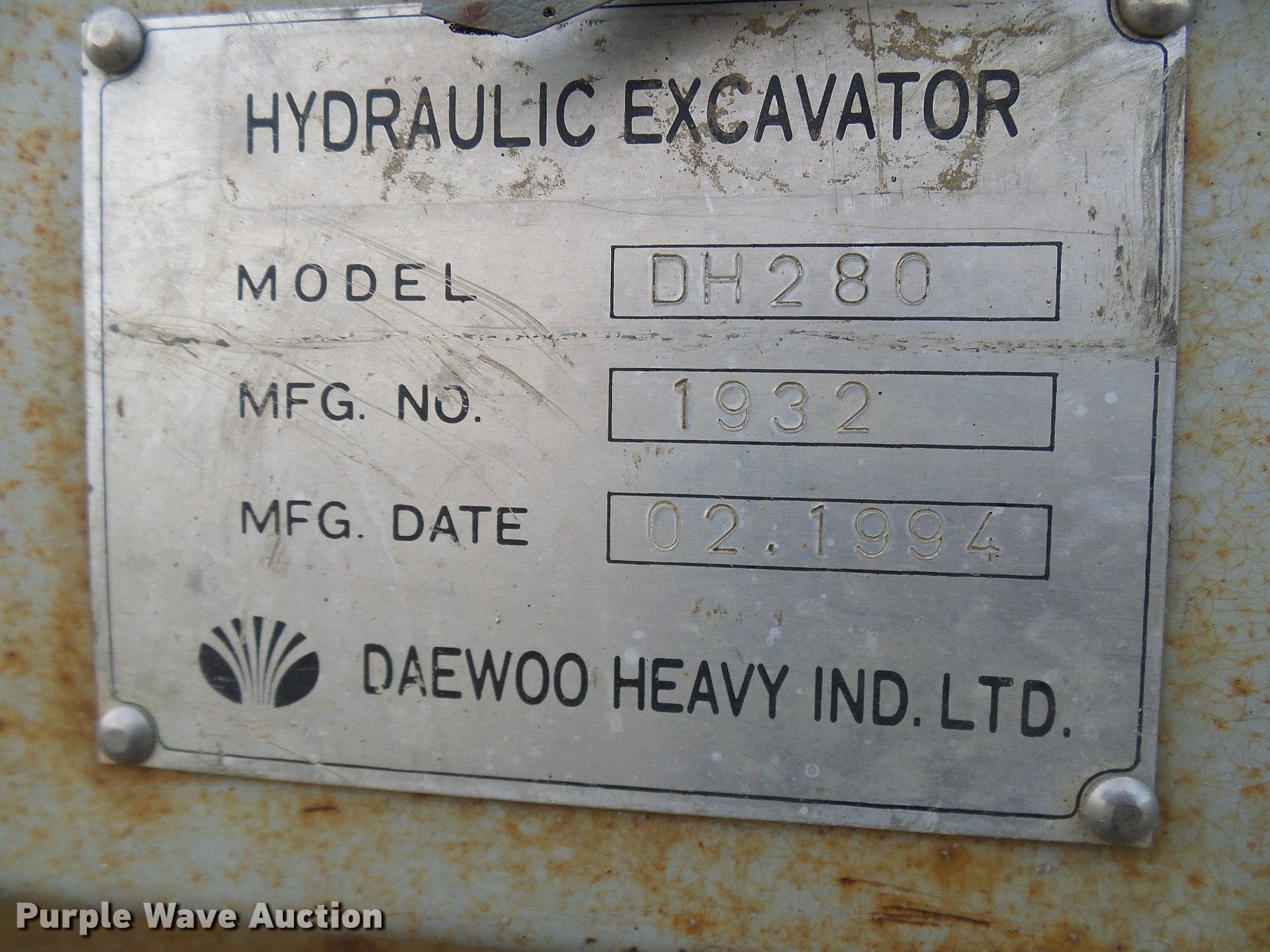 Purple Wave is selling a used Hydraulic Excavator in Missouri. This item is a 1994 Daewoo DH280 excavator with the following: 2,815 hours on meter, Daewoo D2366 six cylinder turbo diesel engine, Hydrostatic transmission, EROPS, AM/FM, Suspension seat, Standard boom, 24"W bucket, Weld-on cutting edge, (3) bolt-on teeth, Auxiliary hydraulics, 33"W steel triple grouser track pads, Key switch inoperable, Fuel pump issue, leaks and will not start, Serial 1932