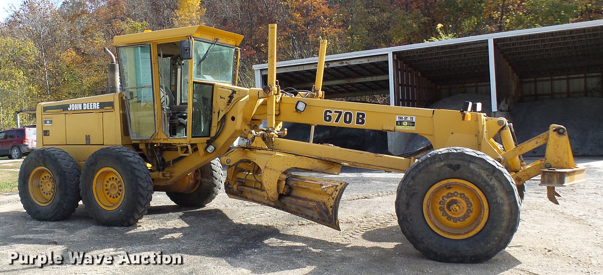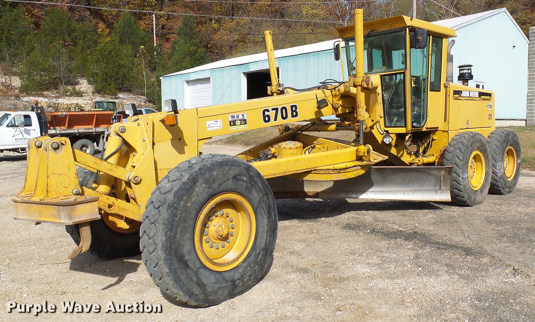 Purple Wave is selling a used Motor Grader in Missouri. This item is a 1995 John Deere 670B motor grader with the following: 13,364 hours on meter, John Deere six cylinder diesel engine, Serial T06068T490193, Powershift transmission, 8F-4R gears, Differential lock, AC and heat, AM/FM, Suspension seat, Front and rear work lights, 14'W moldboard, Tip control, Side shift, Front mounted lift group, Front mounted scarifier, (2) teeth, 14.00-24 tires, Serial DW670BX550482