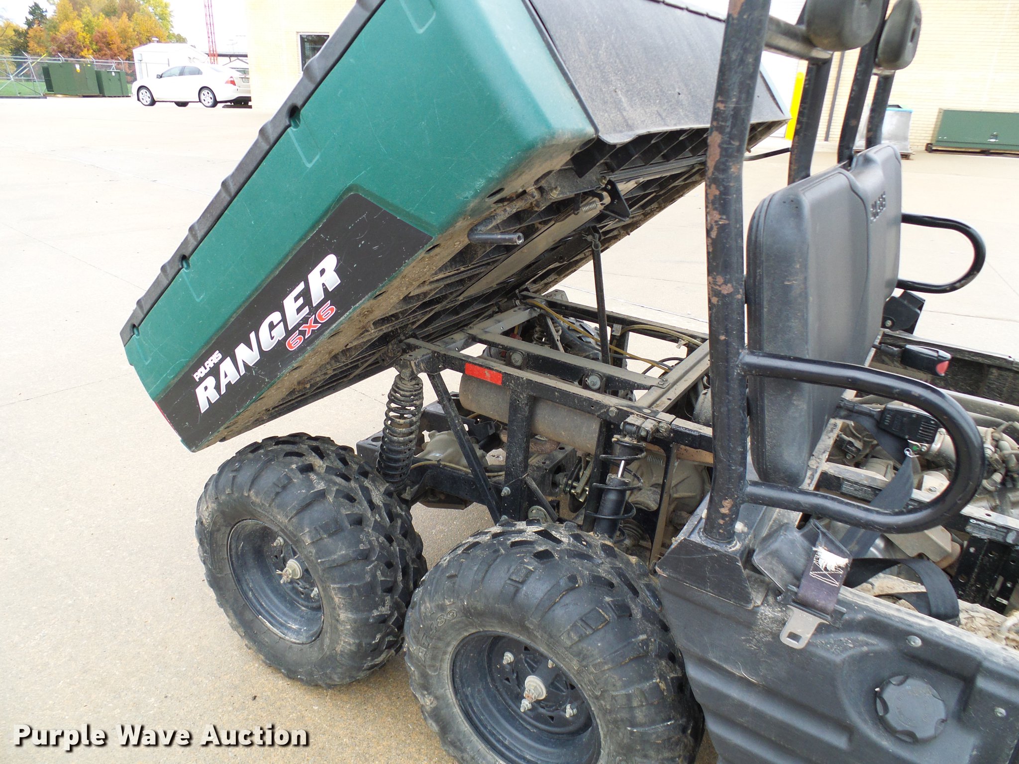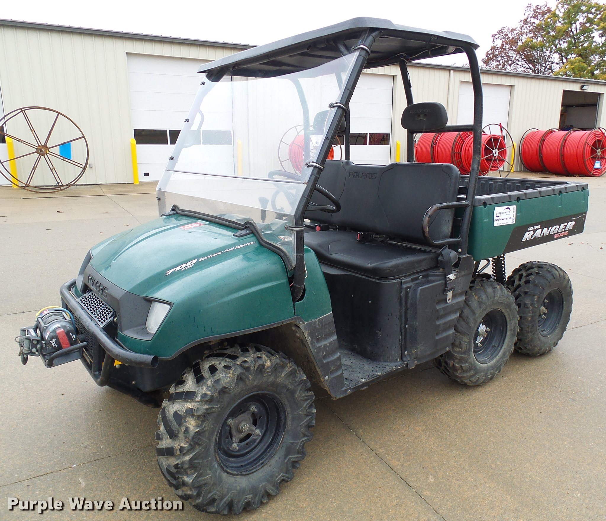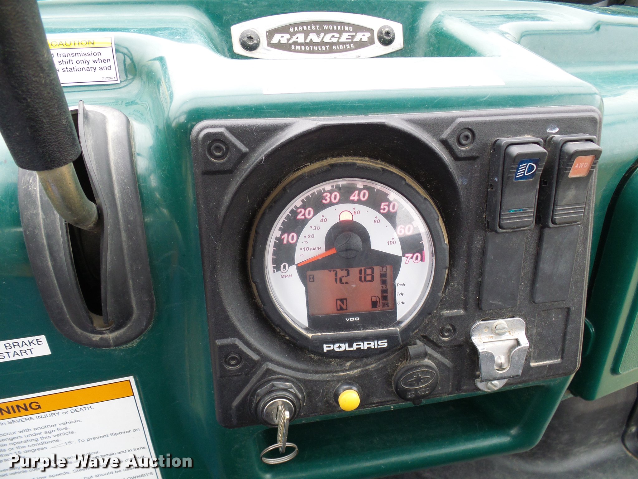 Purple Wave is selling a used Utility Vehicle in Missouri. This item is a 2009 Polaris Ranger utility vehicle with the following: 721 hours on meter, 700 EFI two cylinder gas engine, CVT transmission, H/L-R gears, Manual dump bed, Winch, Remote control, 25 x 10R12 front tires, 25 x 11-12 rear tires