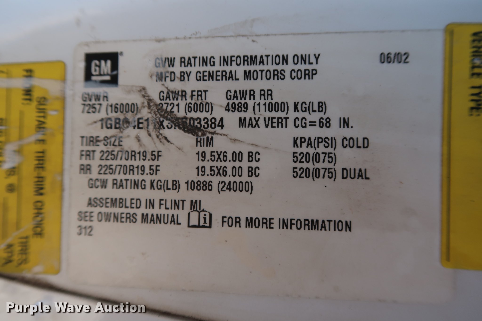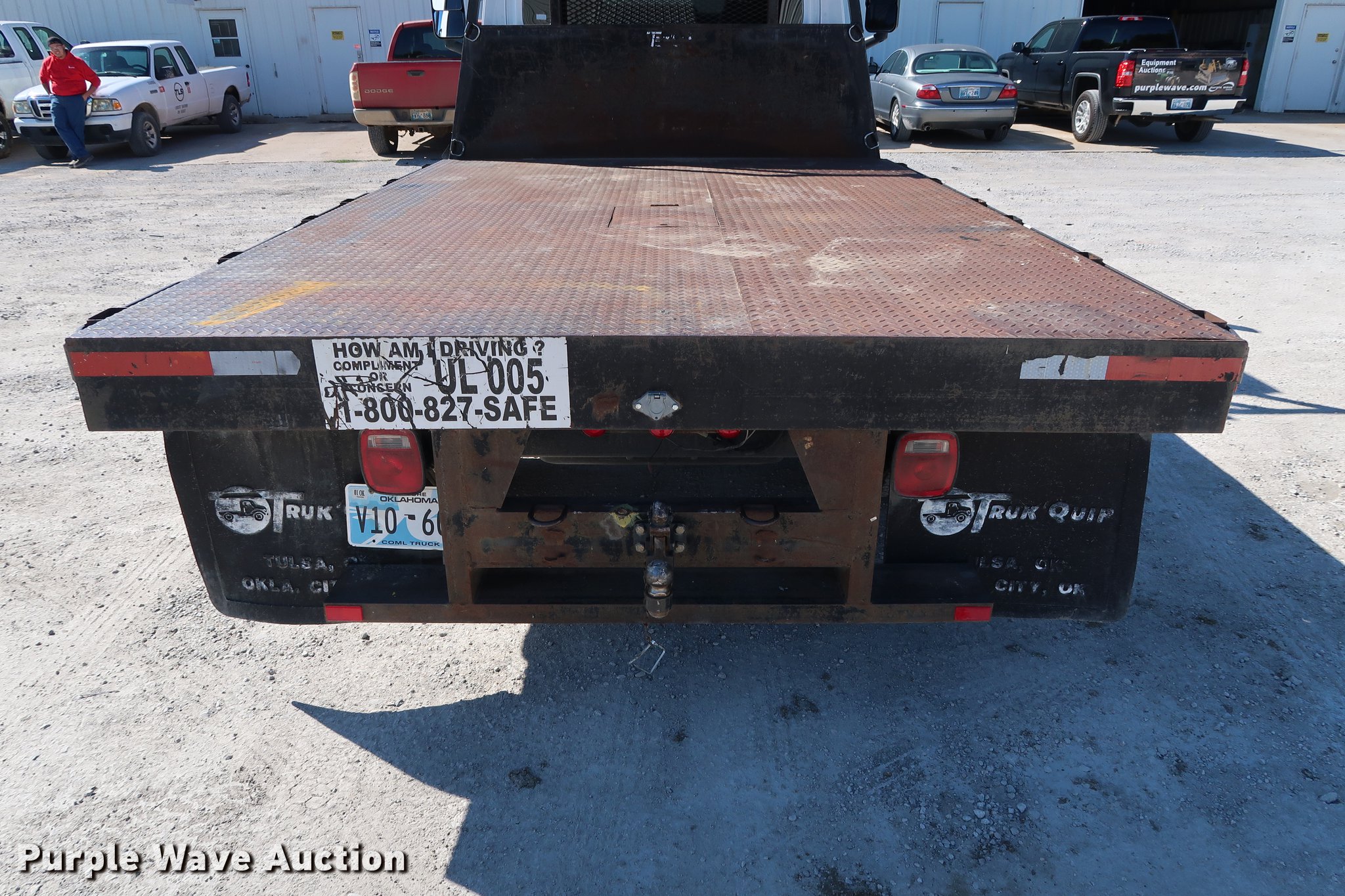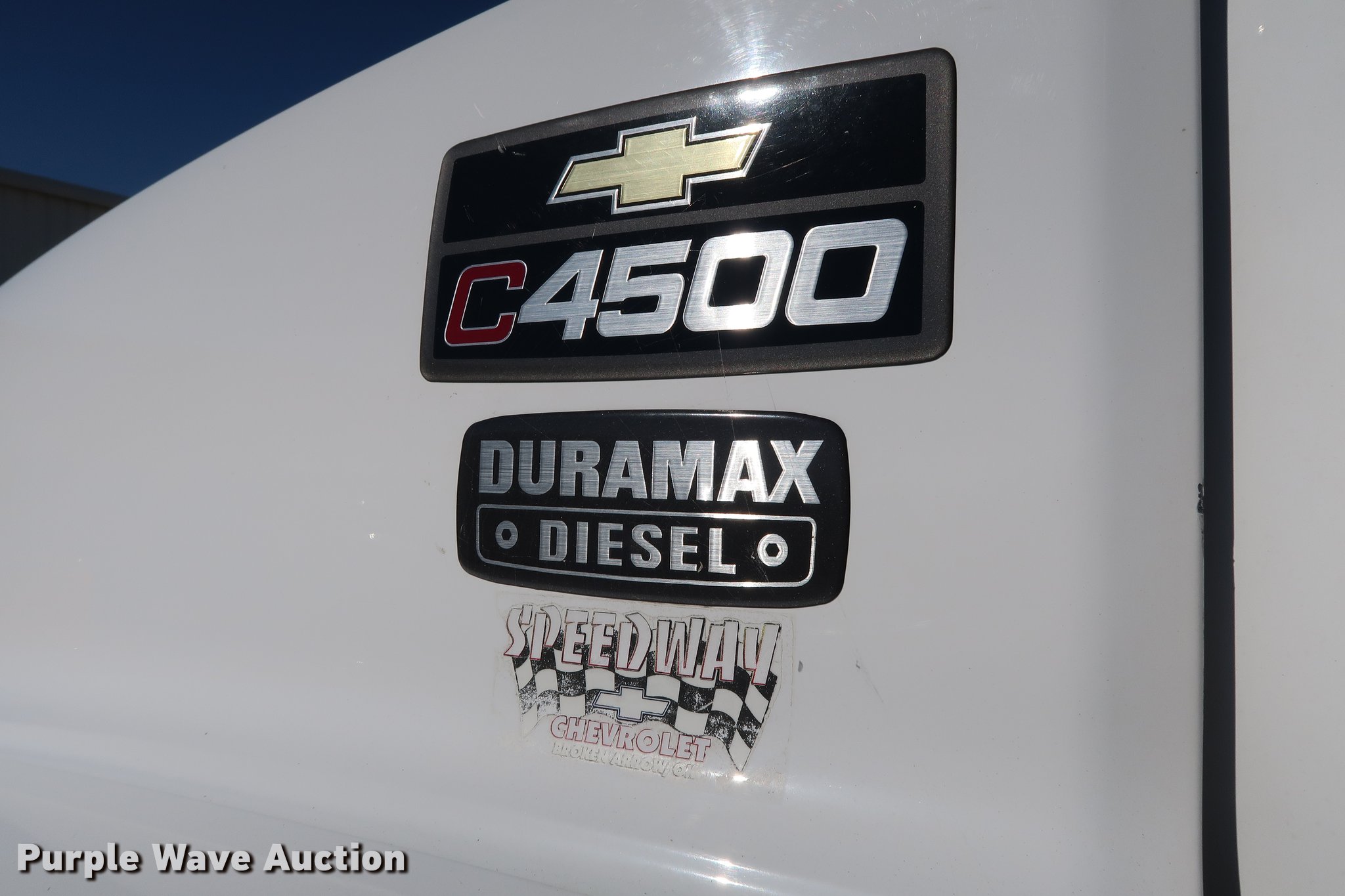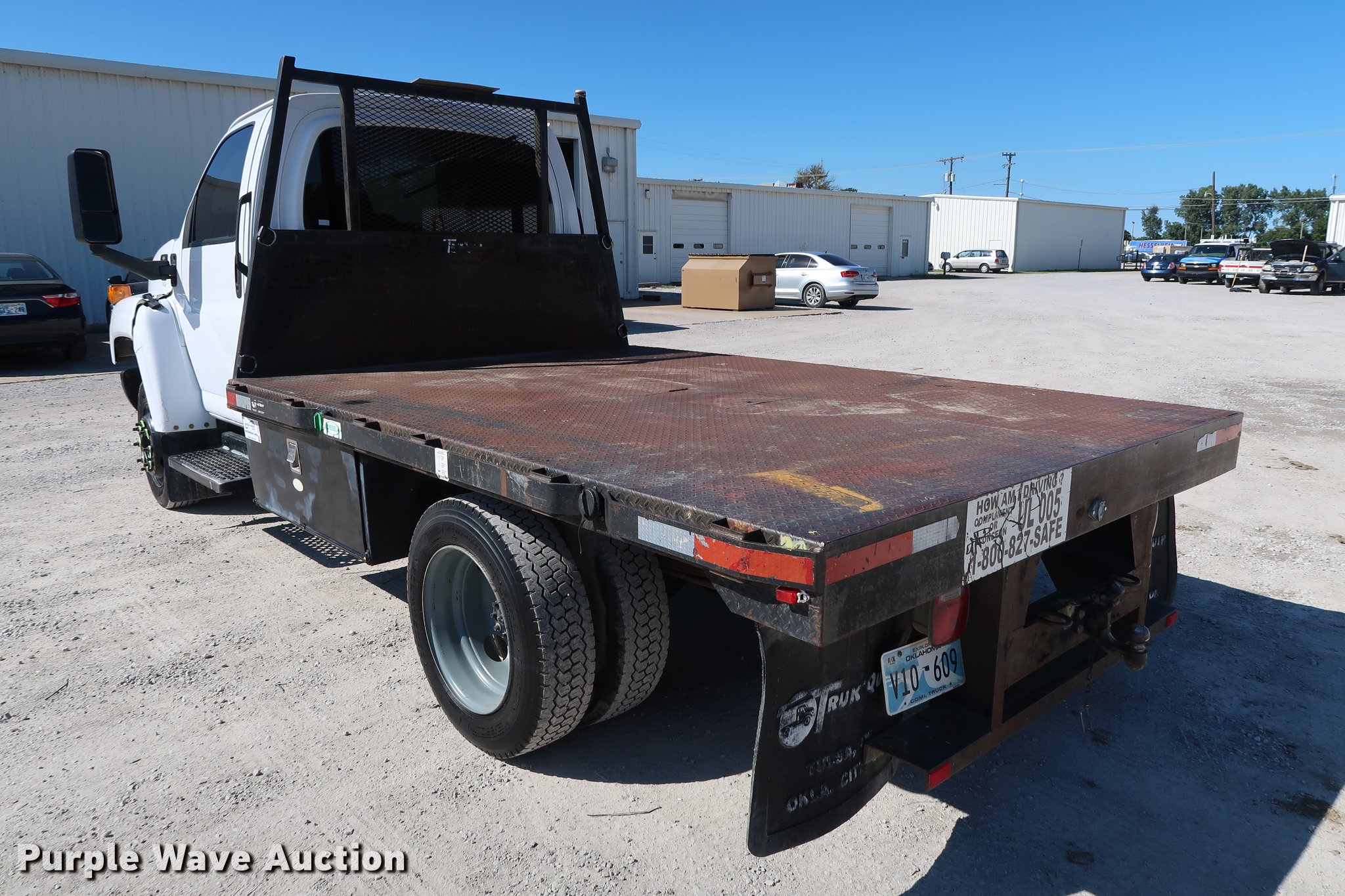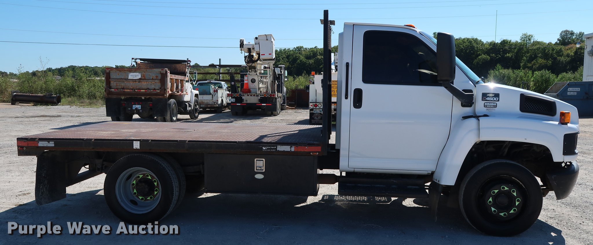 Purple Wave is selling a used Flat Bed Truck in Oklahoma. This item is a 2003 Chevrolet C4500 flatbed truck with the following: 80,698 miles on odometer, 3,003 hours on meter, 6.6L V8 diesel engine, 210 HP, Automatic transmission, Single axle, AC and heat, AM/FM, Trailer brake controller, Backup alarm, Truck Quip flatbed, 11'L x 98"W, Steel floor, Stake side pockets, Toolbox, Single fuel tank, Gooseneck hitch, Pintle hitch, Trailer wiring, 152" wheelbase, Spring suspension, Hydraulic brakes, 225/70R19.5 tires, GVWR 16,000 lbs