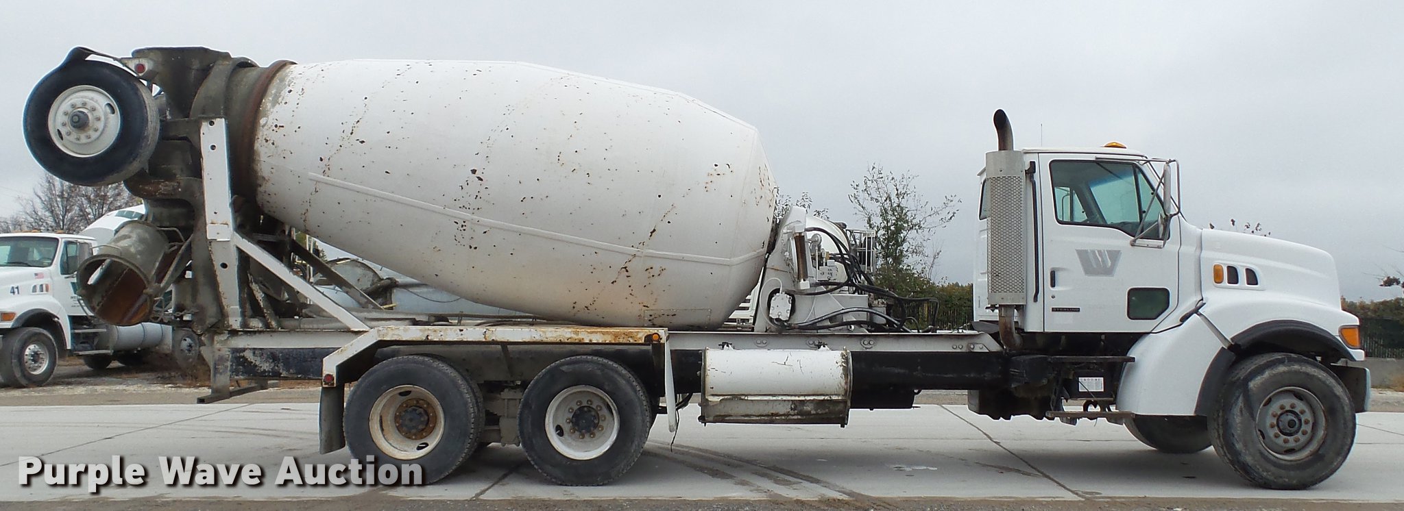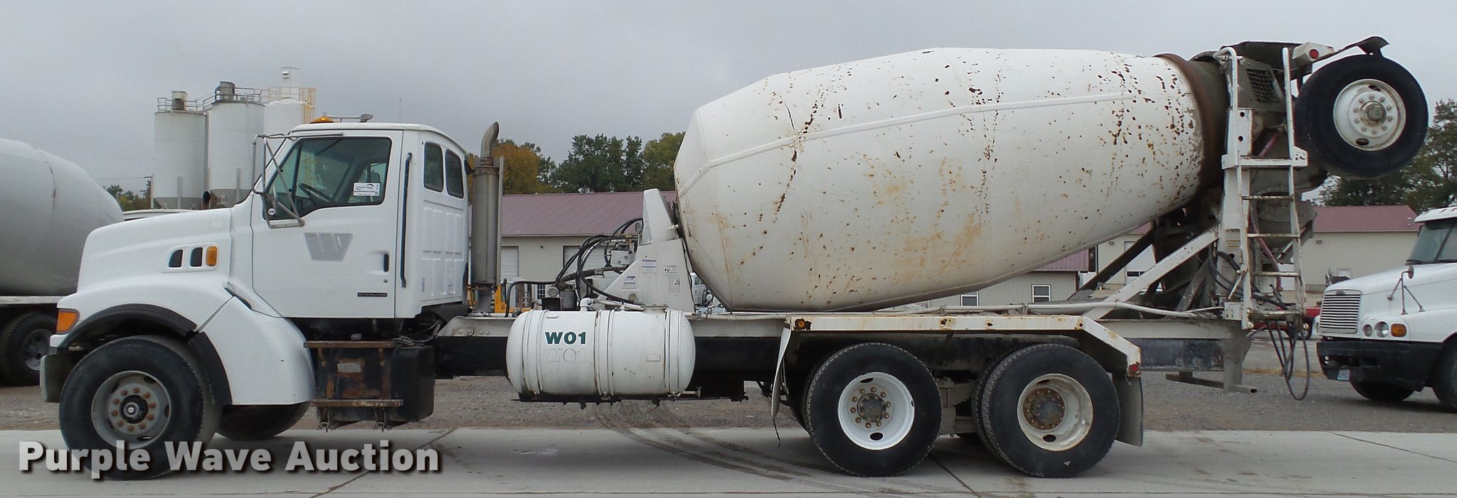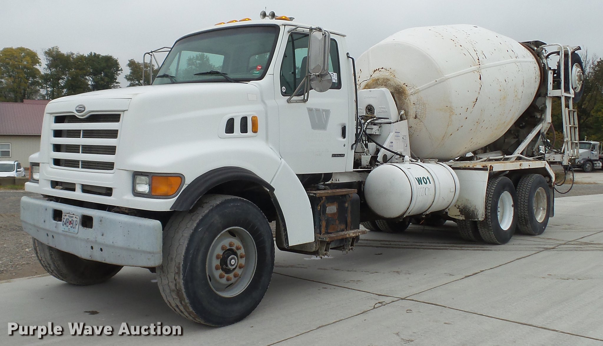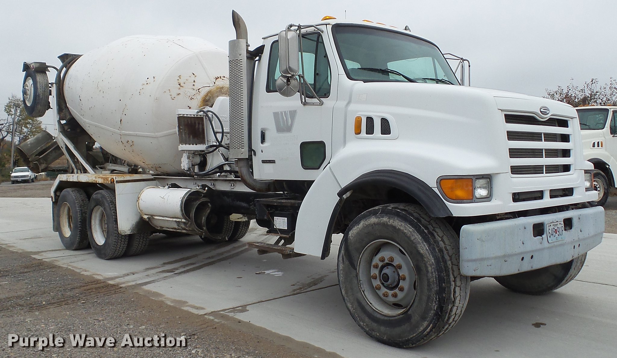 Purple Wave is selling a used Ready Mix or Pump Truck in Missouri. This item is a 2000 Sterling ready mix truck with the following: 151,647 miles on odometer, Caterpillar C10 10.3L L6 turbo diesel engine, 320 HP, Eaton Fuller RTO-8LL eight speed manual transmission, Lo and Lo-Lo gears, Tandem axle, Tag lift axle, Inter-axle differential lock, Heat, Air suspension seat, Drum/axle controls, Front tow hook, PTO, Rexworks 770 Ultra mixer bed, Rear drum controls, Rear discharge, (3) steel chute extensions, Approx. 150 gallon water tank, Ladder, Single fuel tank, Spring over walking beam suspension, Air brakes, 252" wheelbase, 425/65R22.5 front tires, 11R22.5 rear tires, GVWR 66,000 lbs, FAWR 20,000 lbs, IAWR 23,000 lbs, RAWR 23,000 lbs, Fuel gauge inoperable, ABS light on, Hydraulic pump leaks, Unit# W01