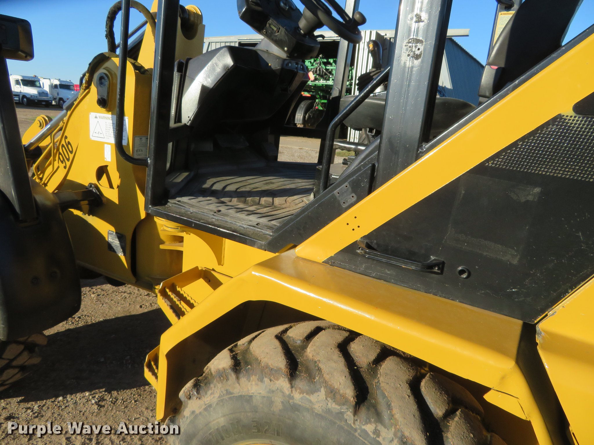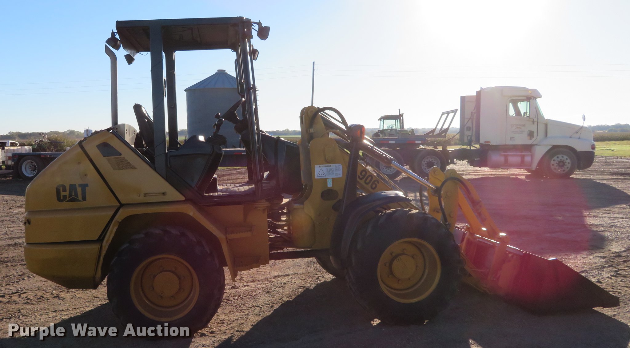 Purple Wave is selling a used Wheel Loader in Kansas. This item is a 2002 Caterpillar 906 wheel loader with the following: Unknown hours on meter, Four cylinder diesel engine, Two speed hydrostatic transmission, Joystick bucket controls, Front work lights, Front hydraulic remote, Skid steer quick attach, 6'W bucket, 12.5-20 tires, Serial CAT00906V6ZS02290