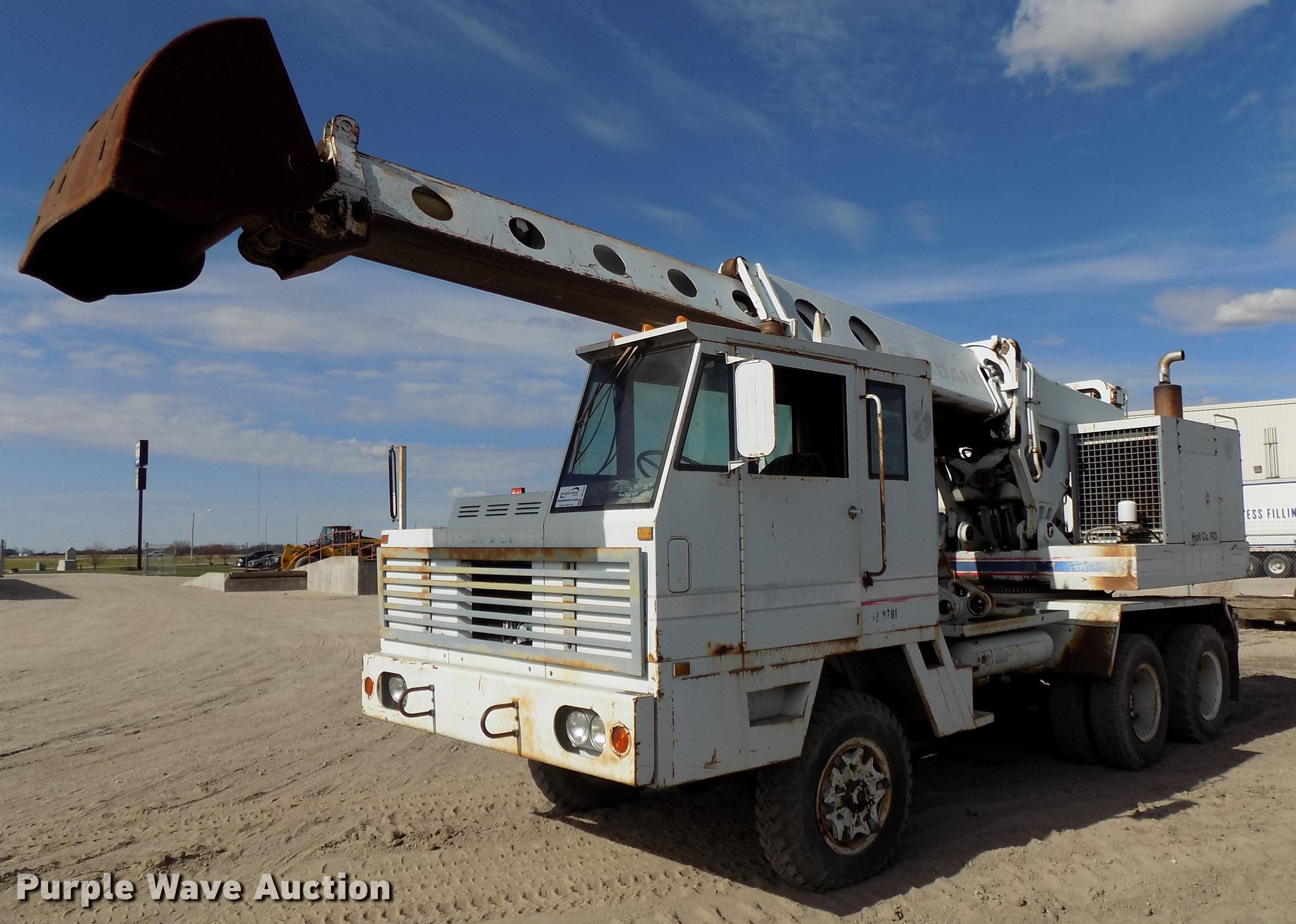 Purple Wave is selling a used Rubber Tired Excavator in Nebraska. This item is a Gradall G440 excavator with the following: 47,678 miles on odometer, 3,370 hours on meter, 7,935 hours on top cab meter, Ford 391GF-6003-D 391 C.I.D. V8 gas lower engine, Serial 39817F-21-HH, Detroit Diesel six cylinder rear engine, Manual transmission, 5F-1R gears, Suspension seat, Backup alarm, Telescopic boom, Rotating turret, 54"W bucket, Weld-on cutting edge, Digging brake, Walking beam suspension, Air brakes, 9.00-20 tires, Manuals, Additional filters and parts, Glass cracked, Unit# 12.8781