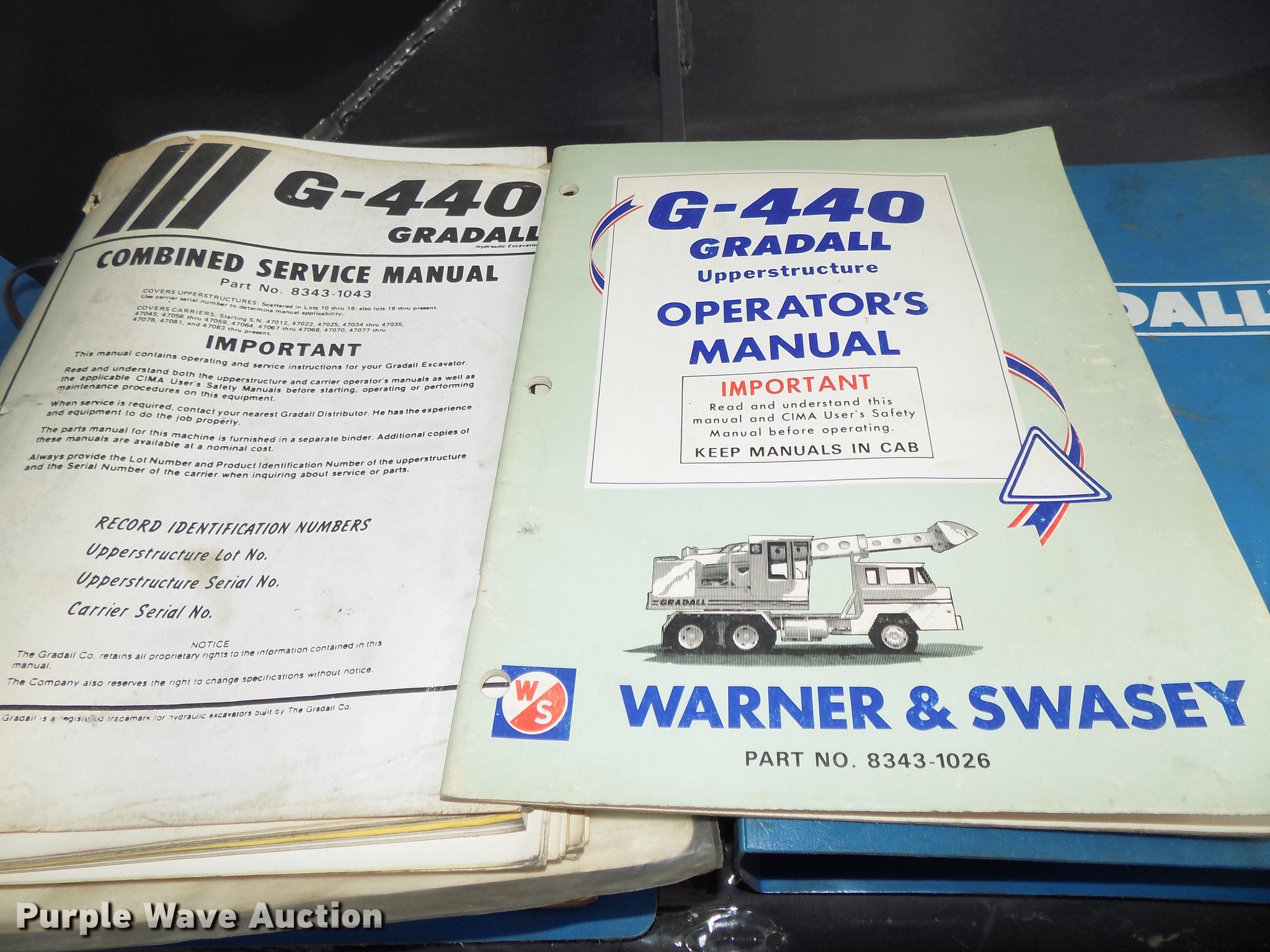 Gradall G440 excavator. 47,678 miles on odometer, 3,370 hours on meter, 7,935 hours on top cab meter, Ford 391GF-6003-D 391 C.I.D. V8 gas lower engine Serial 39817F-21-HH, Detroit Diesel six cylinder rear engine, Manual transmission 5F-1R gears, Suspension seat, Backup alarm, Telescopic boom, Rotating turret, 54"W bucket Weld-on cutting edge, Digging brake, Walking beam suspension, Air brakes, 9.00-20 tires, Manuals, Additional filters and parts, Glass cracked, Unit# 12.8781. Road Builders Machinery & Supply. 4949 Juergen Road. Grand Island, NE 68801