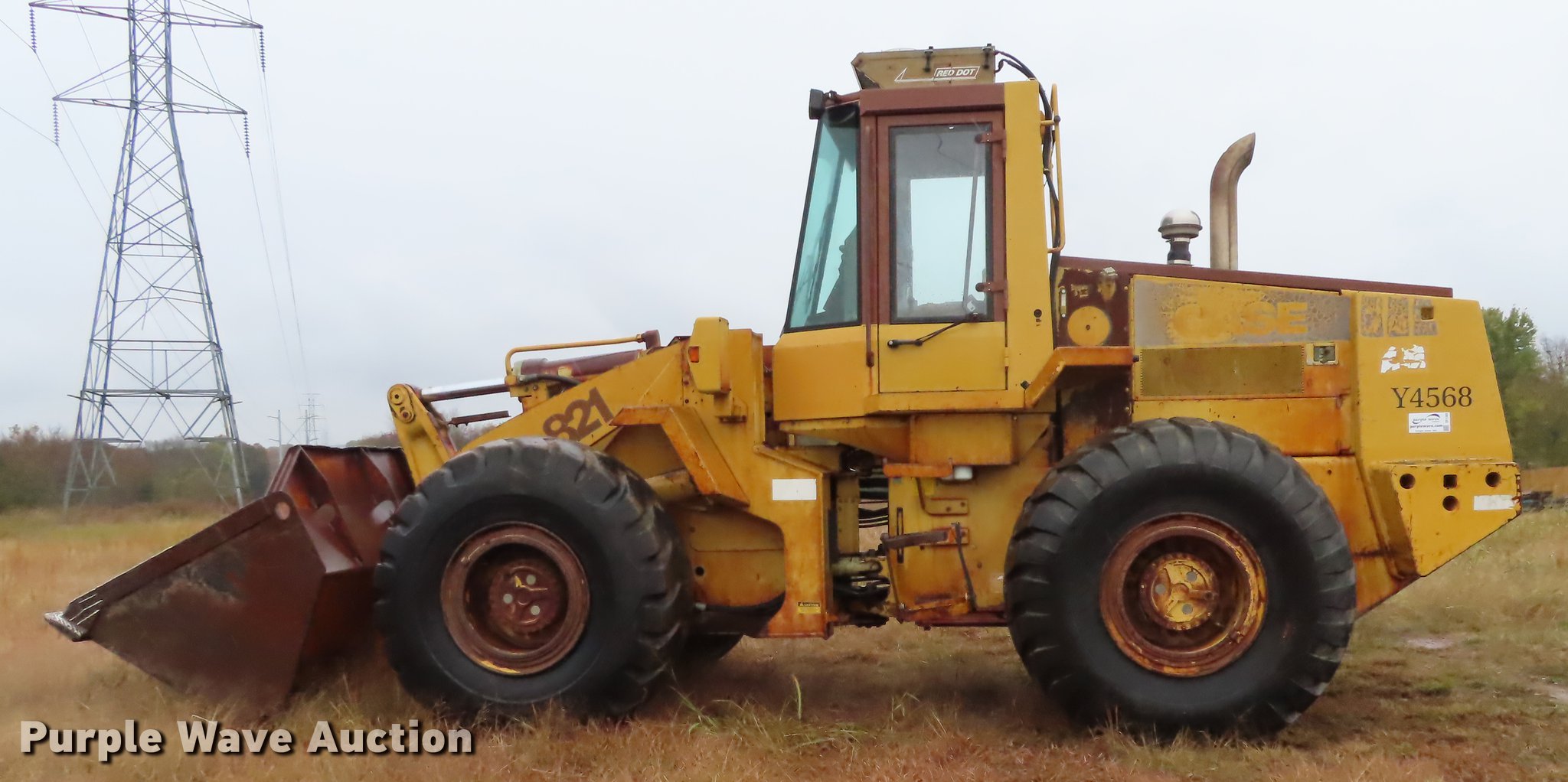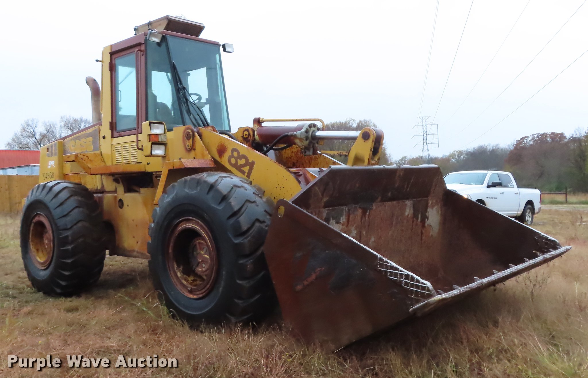 Purple Wave is selling a used Wheel Loader in Oklahoma. This item is a 1991 Case 821 wheel loader with the following: 4,019 hours on meter, Case 6CT six cylinder turbo diesel engine, Powershift transmission, 4F-2R gears, EROPS, AC and heat, Suspension seat, Two-lever bucket controls, Wipers, 108"W general purpose bucket, 23.5-25 tires, Serial JAK0023982
