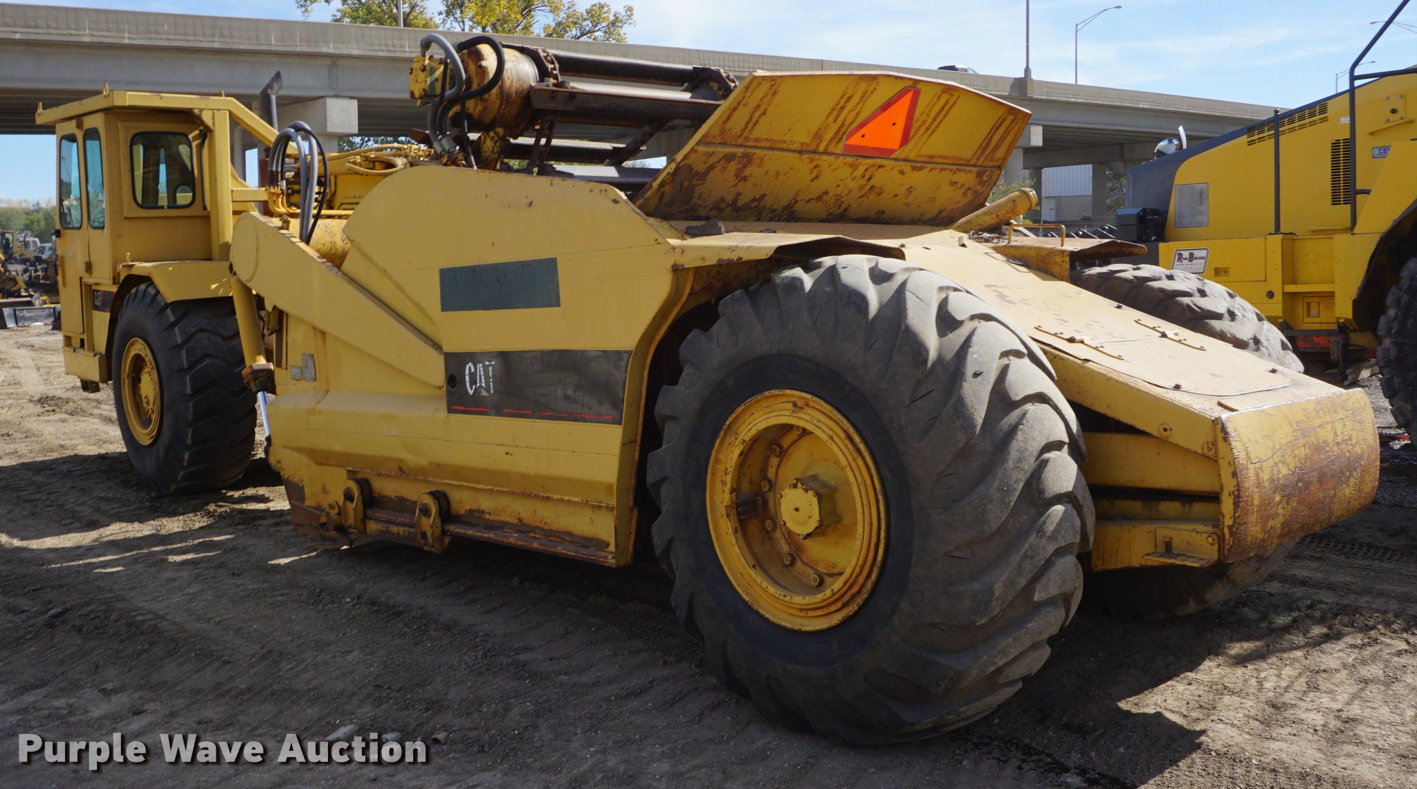 1971 Caterpillar 613 elevating scraper. Unknown hours on meter, Caterpillar 3208 V-8 diesel engine, Powershift transmission 4F-2R gears, Enclosed cab, Suspension seat, 11 cu.yd. bowl capacity, Hydrualic lift, Three lever controls, Lift cylinder leaks, Serial 71M973. Road Builders Machinery & Supply. 1001 S 7th St. Kansas City, KS 66105