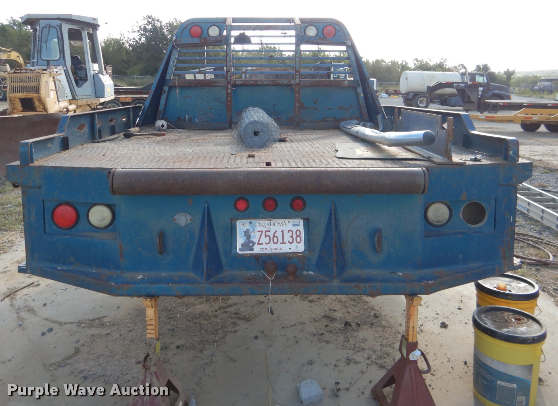 Purple Wave is selling a used Truck Part and Attach. in Oklahoma. This item is a Steel flatbed with the following: 9'L x 102"W, Toolboxes, Gin poles, Steel headache rack, Rolling tailboard, Gooseneck ball