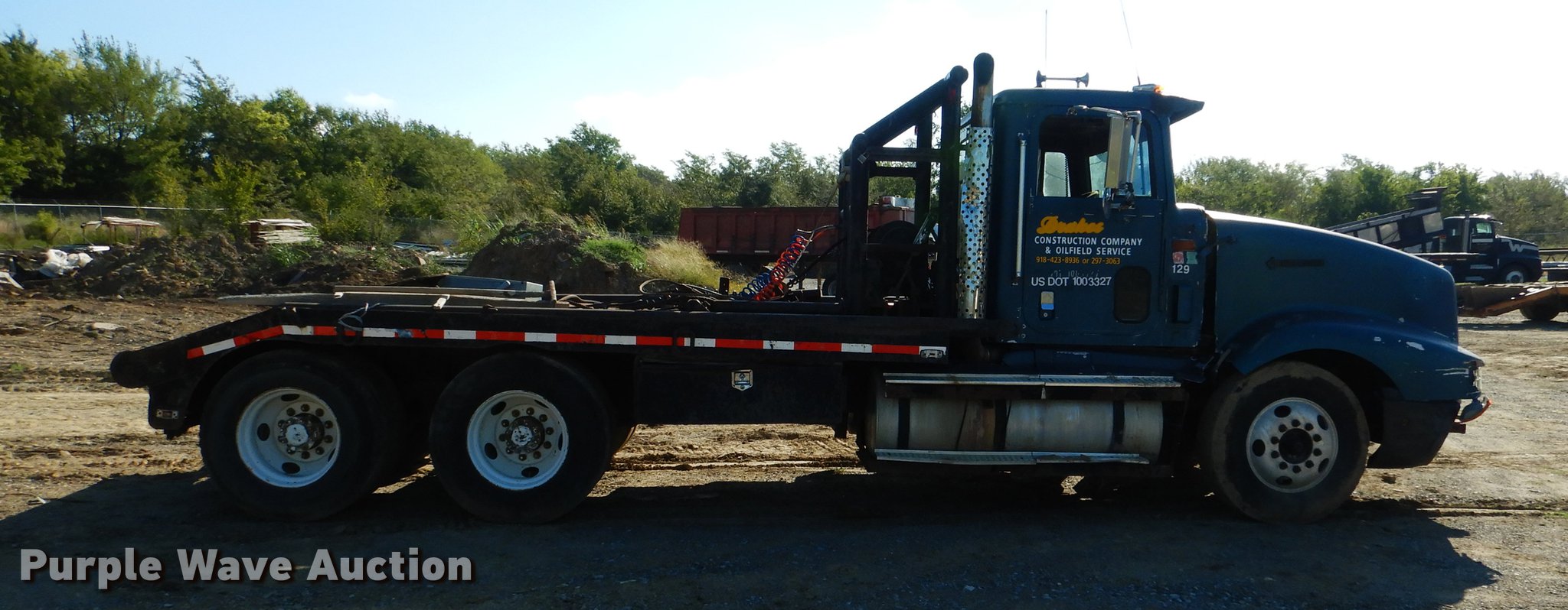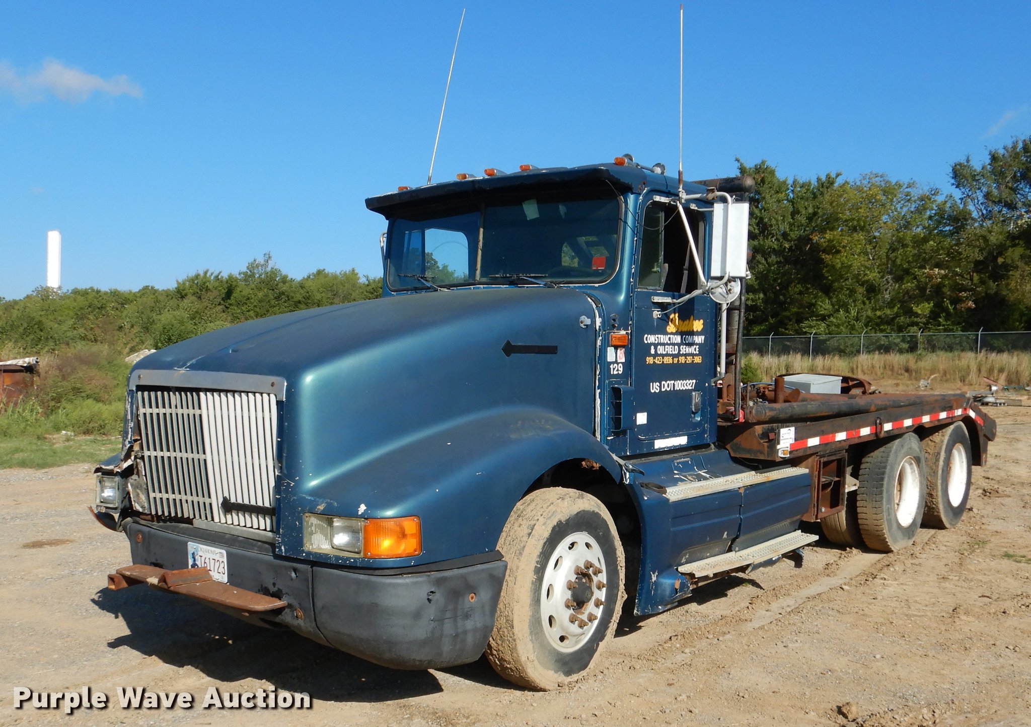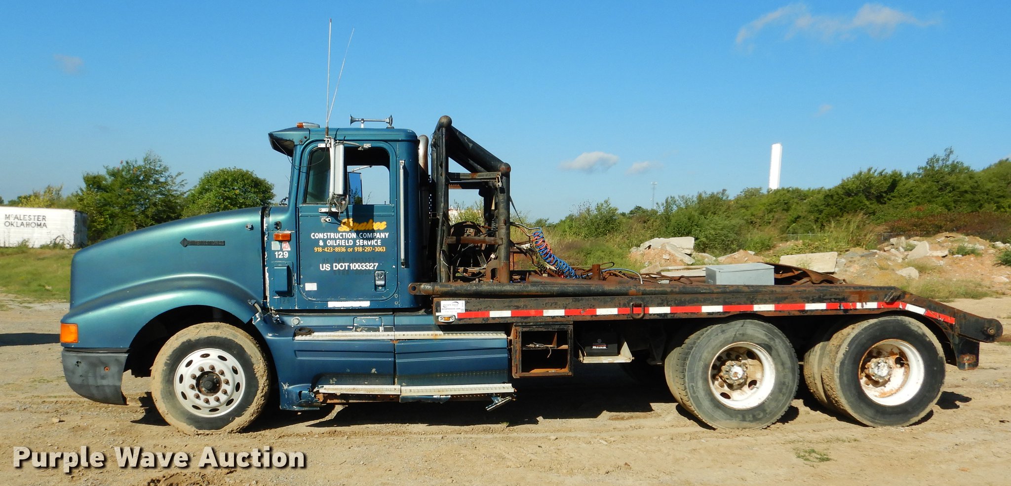 Purple Wave is selling a used Rollback or Tow Truck in Oklahoma. This item is a 1995 International 9400 flatbed truck with the following: 960,888 miles on odometer, Cummins N14 14.0L L6 turbo diesel engine, Eaton Fuller eight speed manual transmission, Tandem axle, AC and heat, Power and heated mirrors, Air suspension seat, Single exhaust stack, Toolbox, PTO, 197"L x 102"W flatbed, Fifth wheel plate, 14' gin poles, Winch, 20,000 lbs capacity, Rolling tailboard, Dual fuel tanks, Air brakes, 11R22.5 tires, Chipped windshield, Rear view mirror missing, Unit# 129