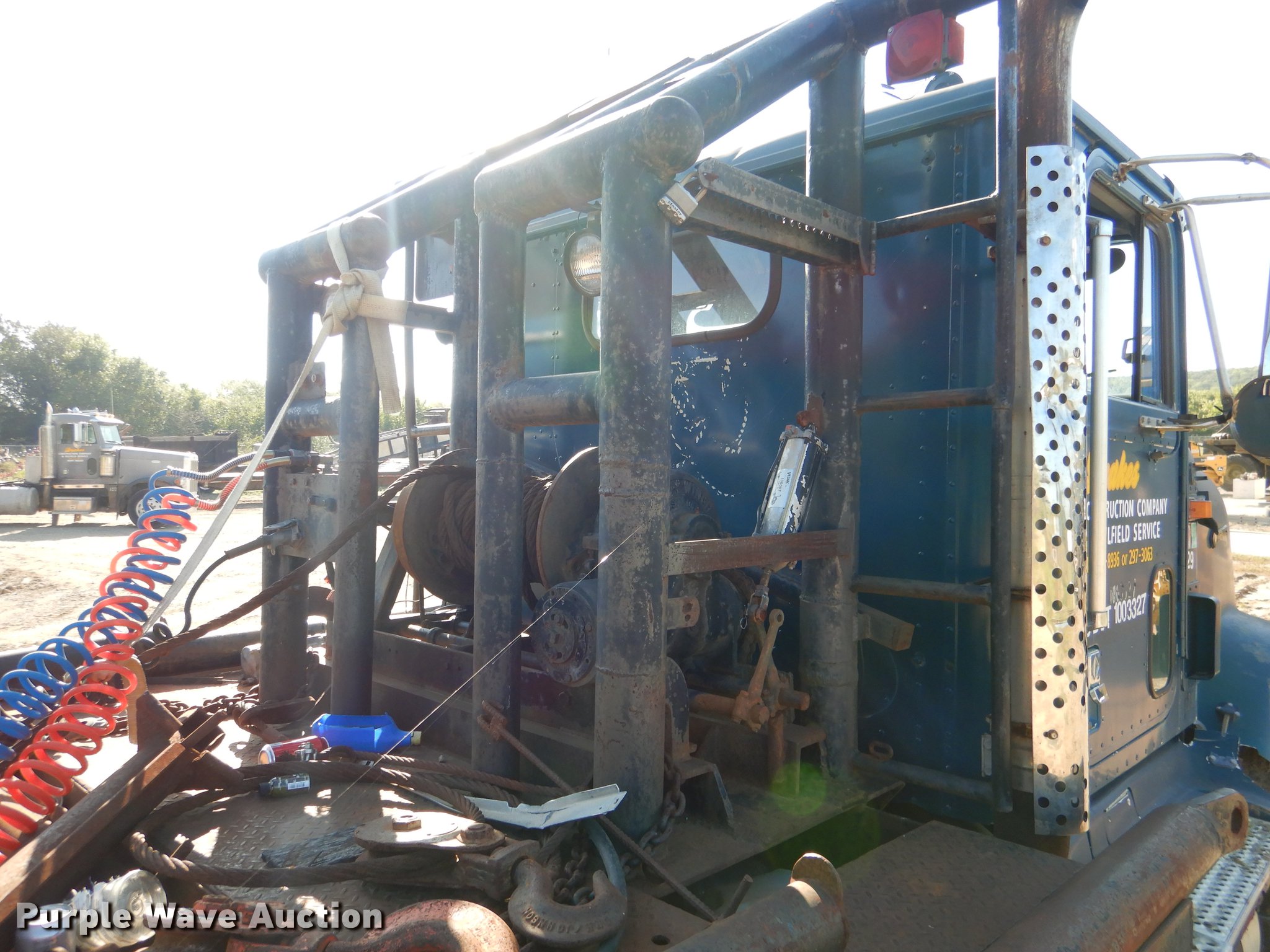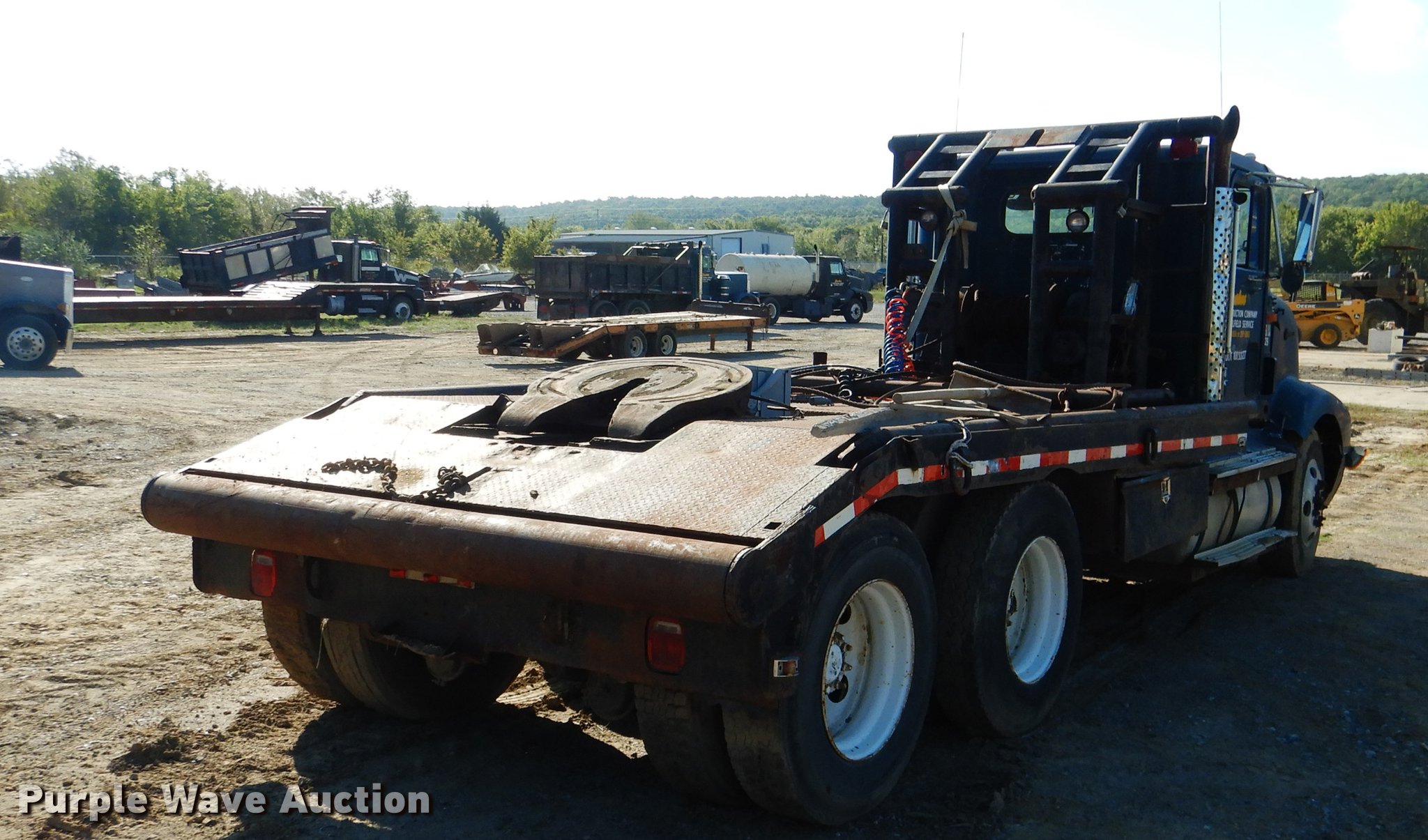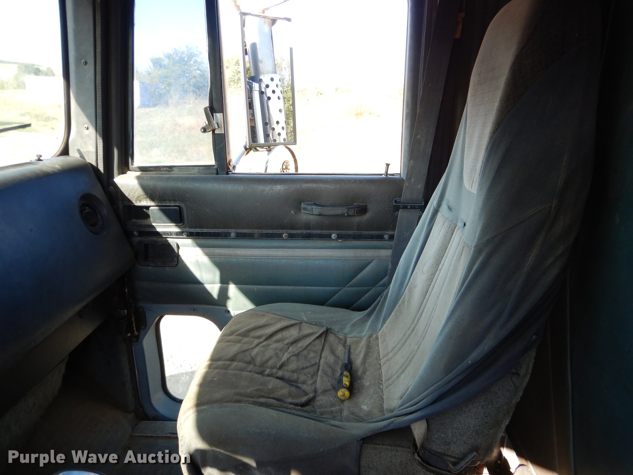 Purple Wave is selling a used Rollback or Tow Truck in Oklahoma. This item is a 1995 International 9400 flatbed truck with the following: 960,888 miles on odometer, Cummins N14 14.0L L6 turbo diesel engine, Eaton Fuller eight speed manual transmission, Tandem axle, AC and heat, Power and heated mirrors, Air suspension seat, Single exhaust stack, Toolbox, PTO, 197"L x 102"W flatbed, Fifth wheel plate, 14' gin poles, Winch, 20,000 lbs capacity, Rolling tailboard, Dual fuel tanks, Air brakes, 11R22.5 tires, Chipped windshield, Rear view mirror missing, Unit# 129