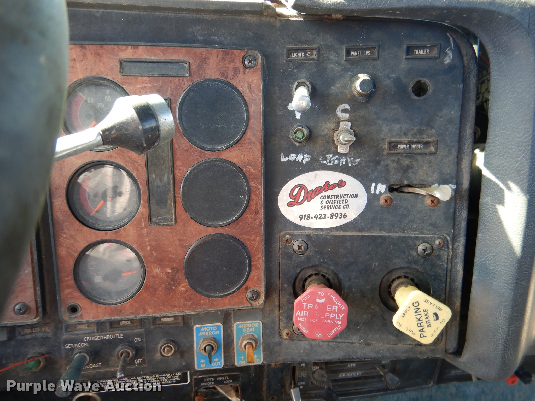 1995 International 9400 flatbed truck. 960,888 miles on odometer, Cummins N14 14.0L L6 turbo diesel engine, Eaton Fuller eight speed manual transmission, Tandem axle, AC and heat, Power and heated mirrors, Air suspension seat, Single exhaust stack, Toolbox, PTO, 197"L x 102"W flatbed Fifth wheel plate, 14' gin poles, Winch 20,000 lbs capacity, Rolling tailboard, Dual fuel tanks, Air brakes, 11R22.5 tires, Chipped windshield, Rear view mirror missing, Unit# 129. Oklahoma title. Title has a lien that will be released following the close of the auction. Title distribution may be delayed up to 30 days from verification of funds. 2HSFHAER9SC014420. Drake Oilfield Construction - Open inspection November 28. 41 US-270. Alderson, OK 74522