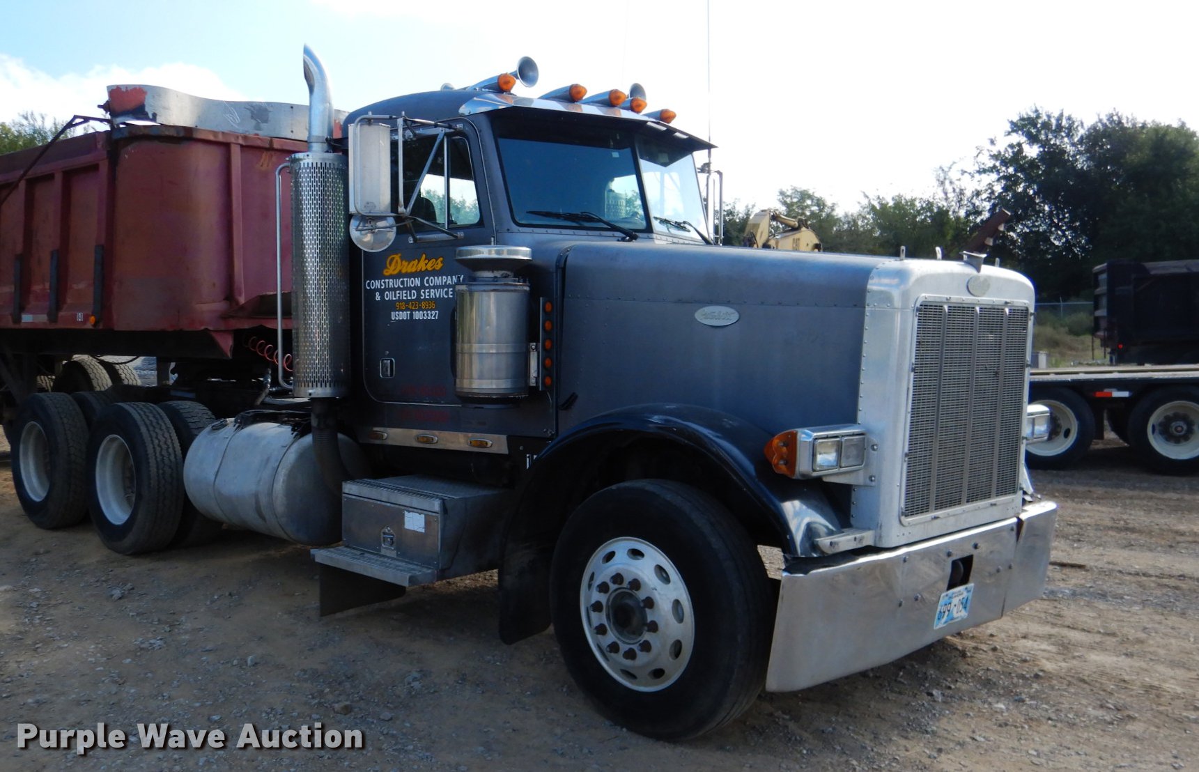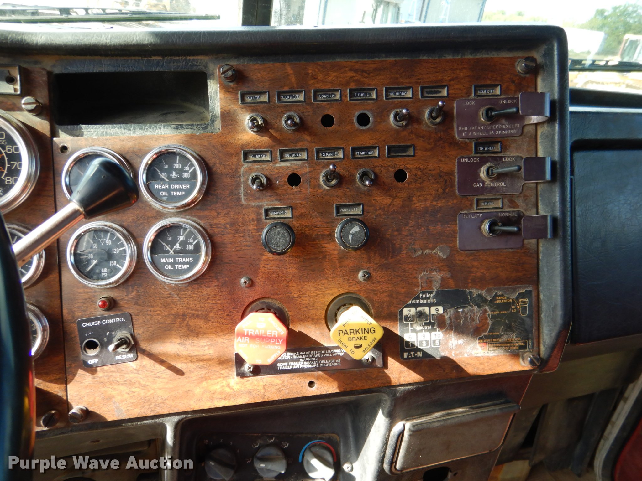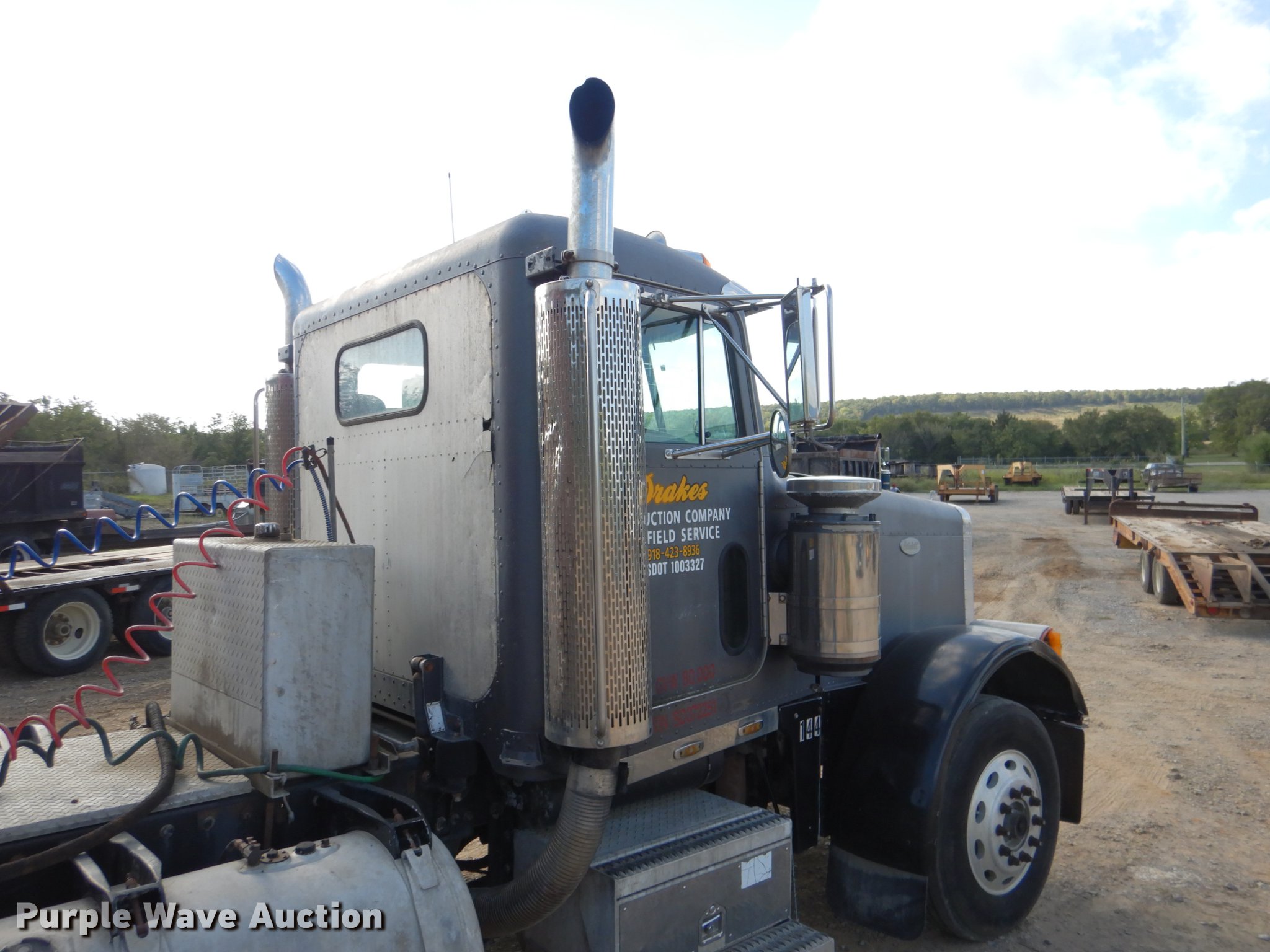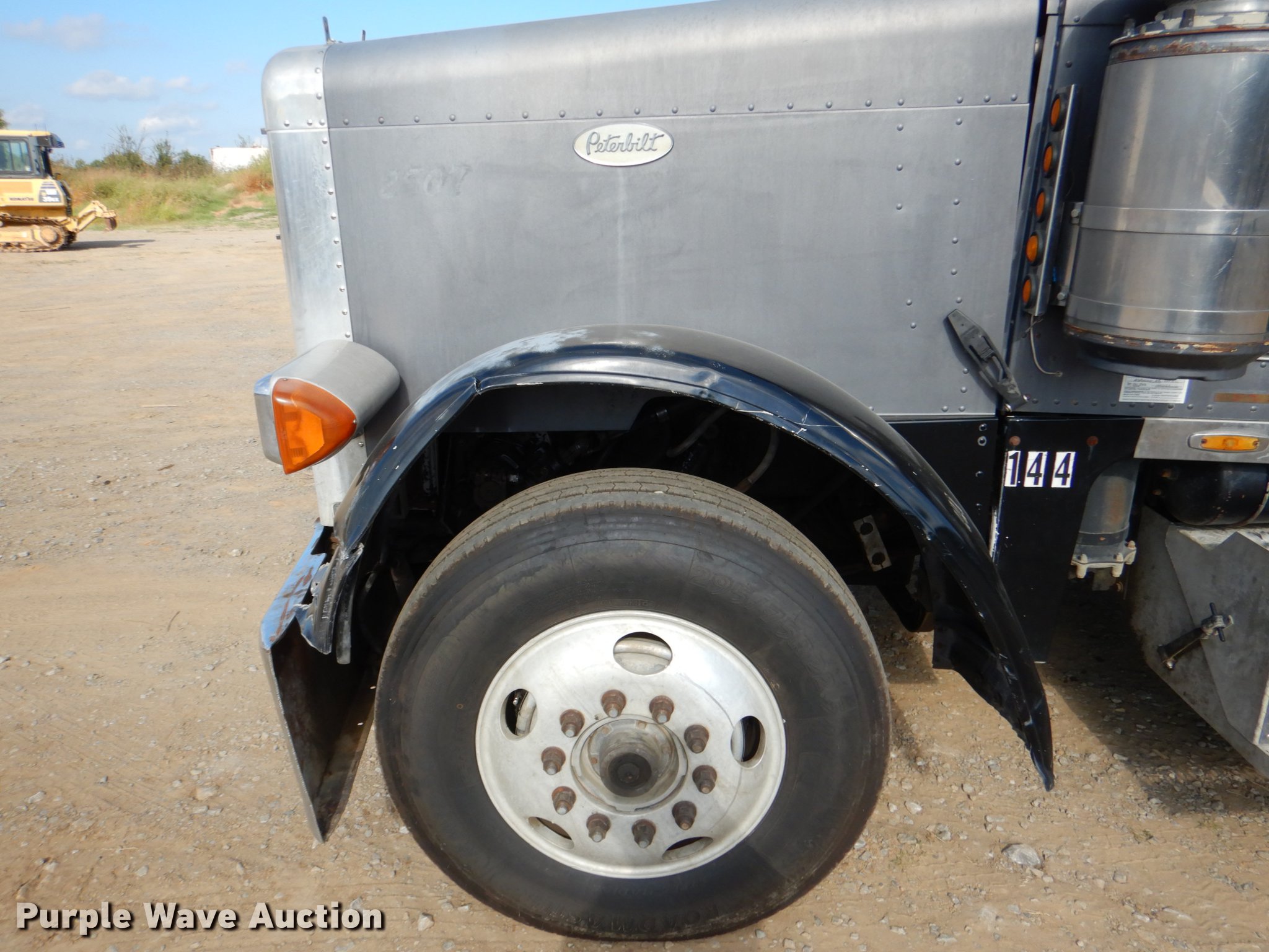 Purple Wave is selling a used Truck Tractor in Oklahoma. This item is a 1995 Peterbilt 379 semi truck with the following: 1,346,401 miles on odometer, Caterpillar 3406 14.6L L6 turbo diesel engine, Eaton Fuller 10 speed manual transmission, Tandem axle, Full differential lock, AC and heat, Tilt, Cruise, Power and heated mirrors, Air suspension seat, Dump valves, Wet kit, Exterior visor, Front tow hooks, Dual rear exhaust stacks, Aluminum deck plate, Sliding fifth wheel plate, Dual fuel tanks, Air suspension, Air brakes, Engine brake, 295/75R22.5 tires, Broken windshield, Unit# 144