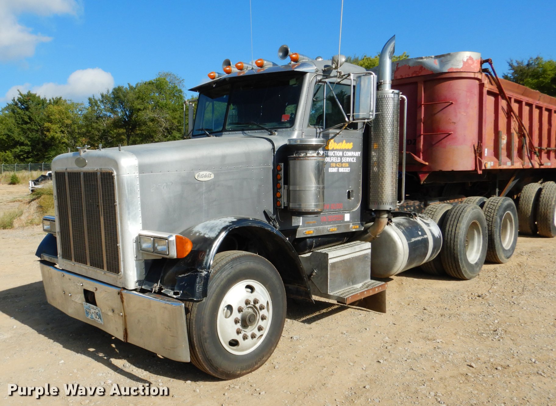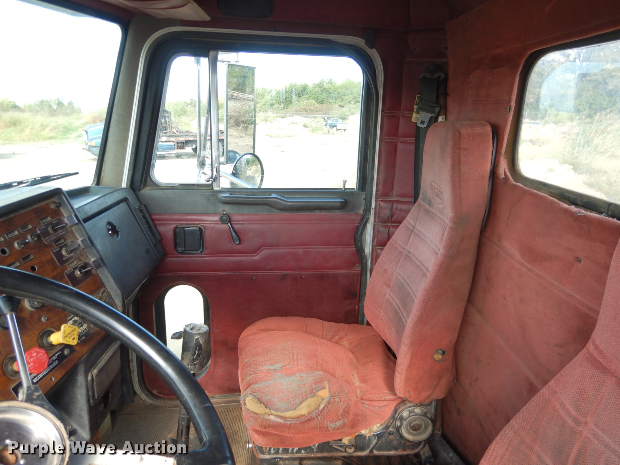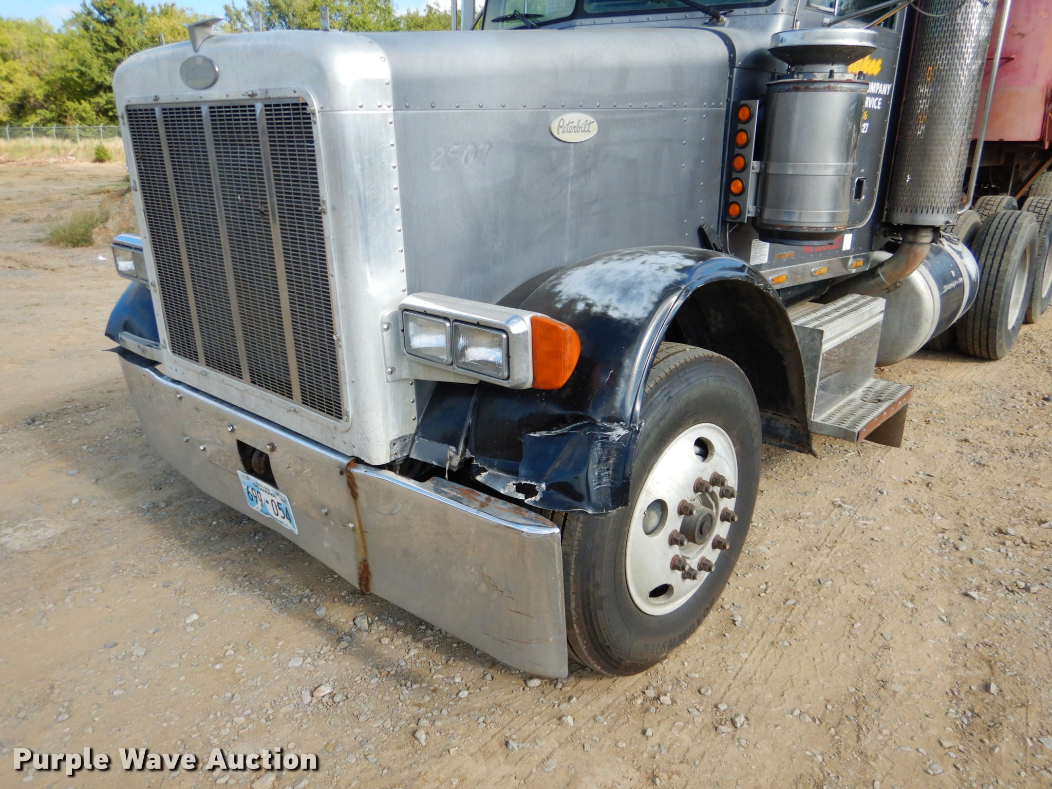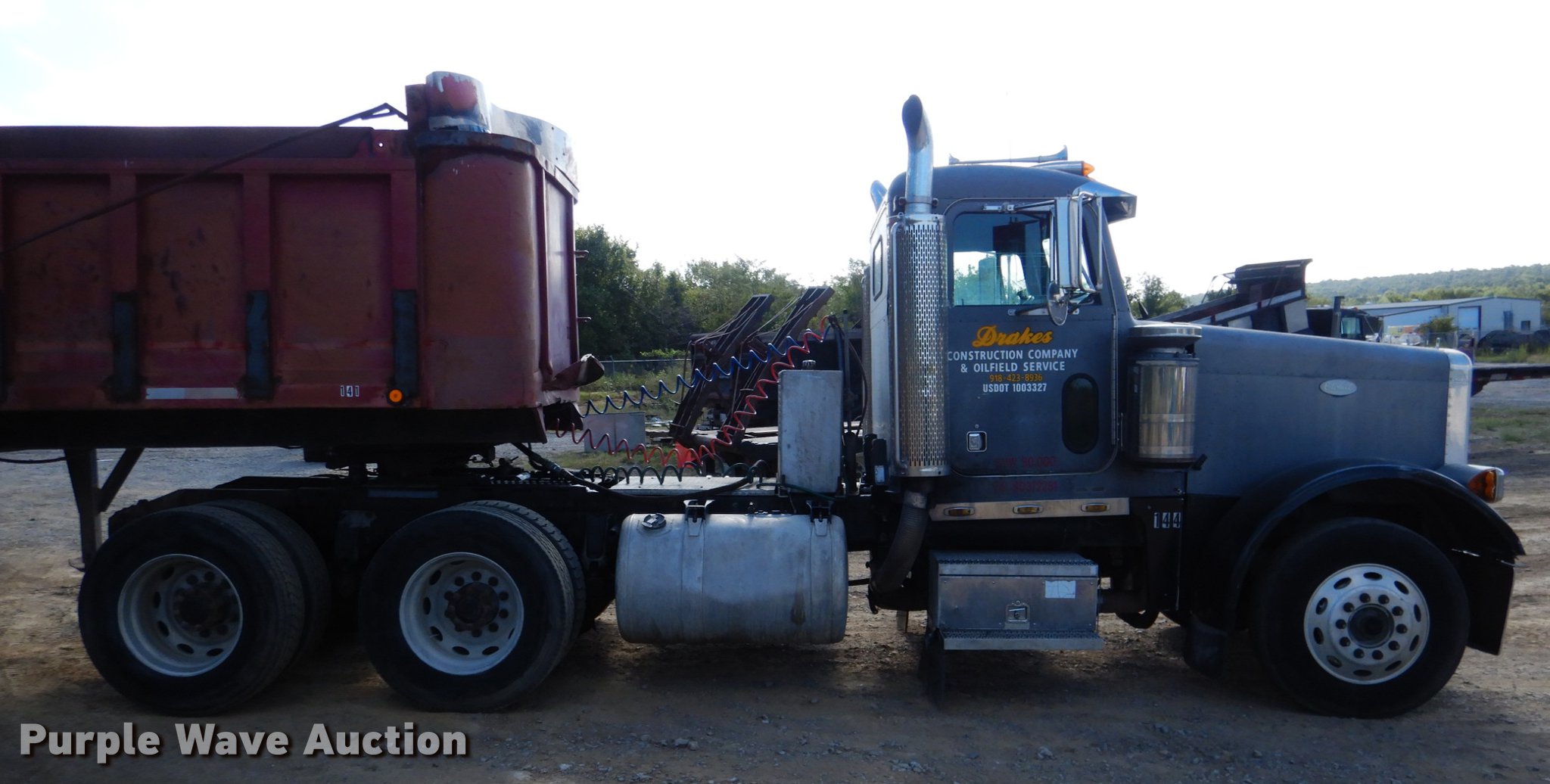 Purple Wave is selling a used Truck Tractor in Oklahoma. This item is a 1995 Peterbilt 379 semi truck with the following: 1,346,401 miles on odometer, Caterpillar 3406 14.6L L6 turbo diesel engine, Eaton Fuller 10 speed manual transmission, Tandem axle, Full differential lock, AC and heat, Tilt, Cruise, Power and heated mirrors, Air suspension seat, Dump valves, Wet kit, Exterior visor, Front tow hooks, Dual rear exhaust stacks, Aluminum deck plate, Sliding fifth wheel plate, Dual fuel tanks, Air suspension, Air brakes, Engine brake, 295/75R22.5 tires, Broken windshield, Unit# 144