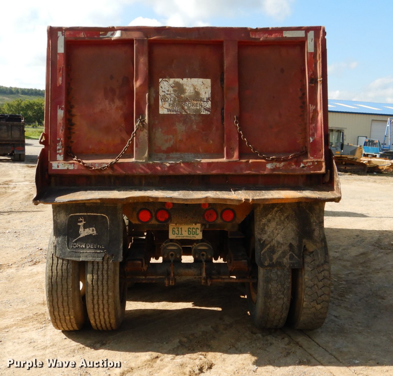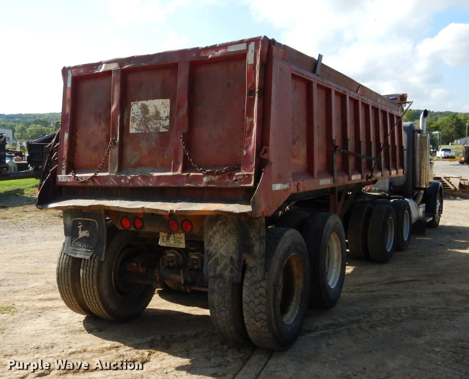 Purple Wave is selling a used End Dump Rock Trailer in Oklahoma. This item is a 1995 Palmer TA-22 end dump trailer with the following: 23'L x 96"W, 42" side height, 6" side board height, 56" floor height, Single hydraulic cylinder, End gate, Roll tarp, Fifth wheel plate, Dual leg landing gear, Spring suspension, Air brakes, Tandem axle, Steel wheels, 11R24.5 tires, GVWR 40,000 lbs, Unit# 141