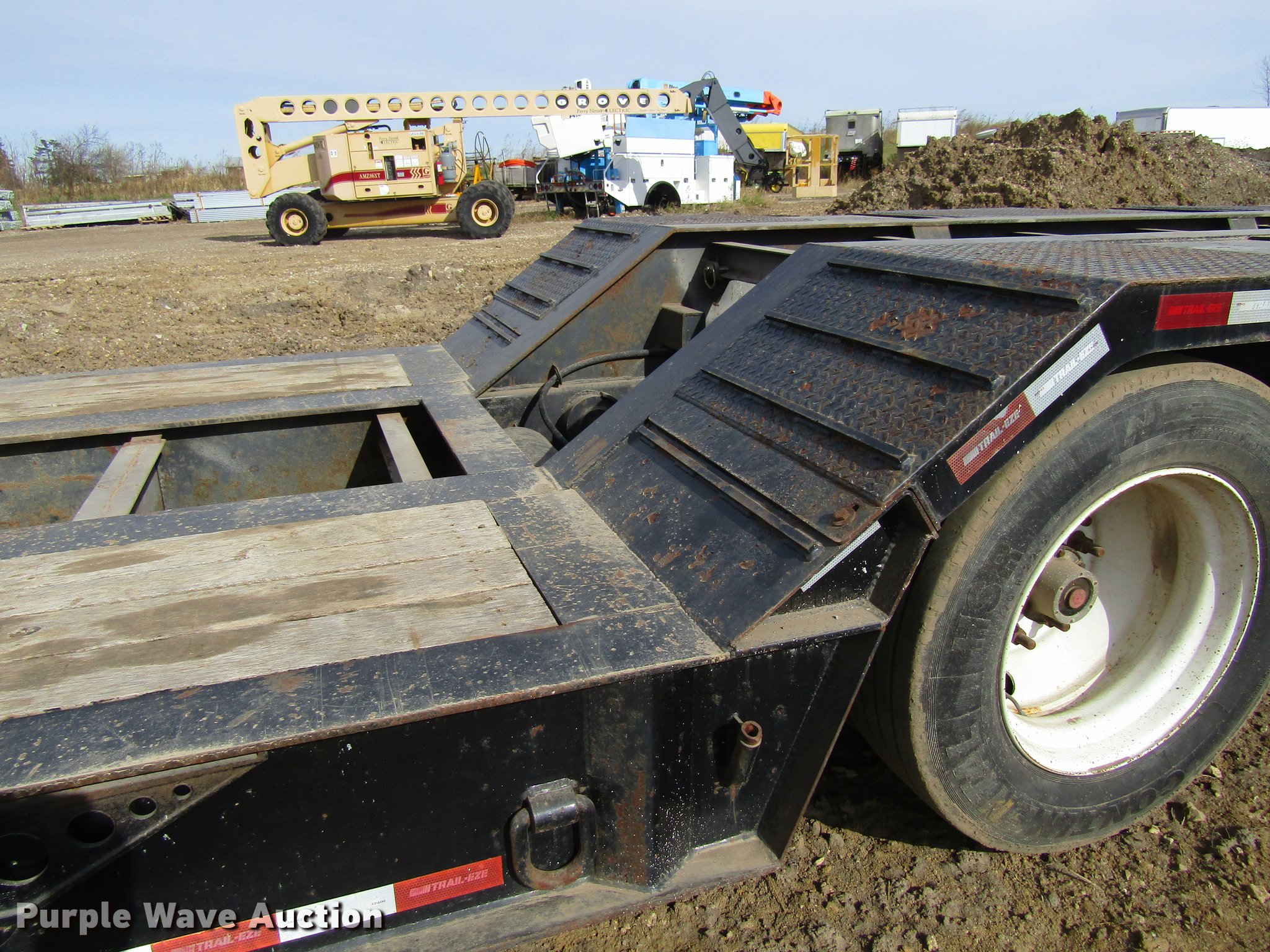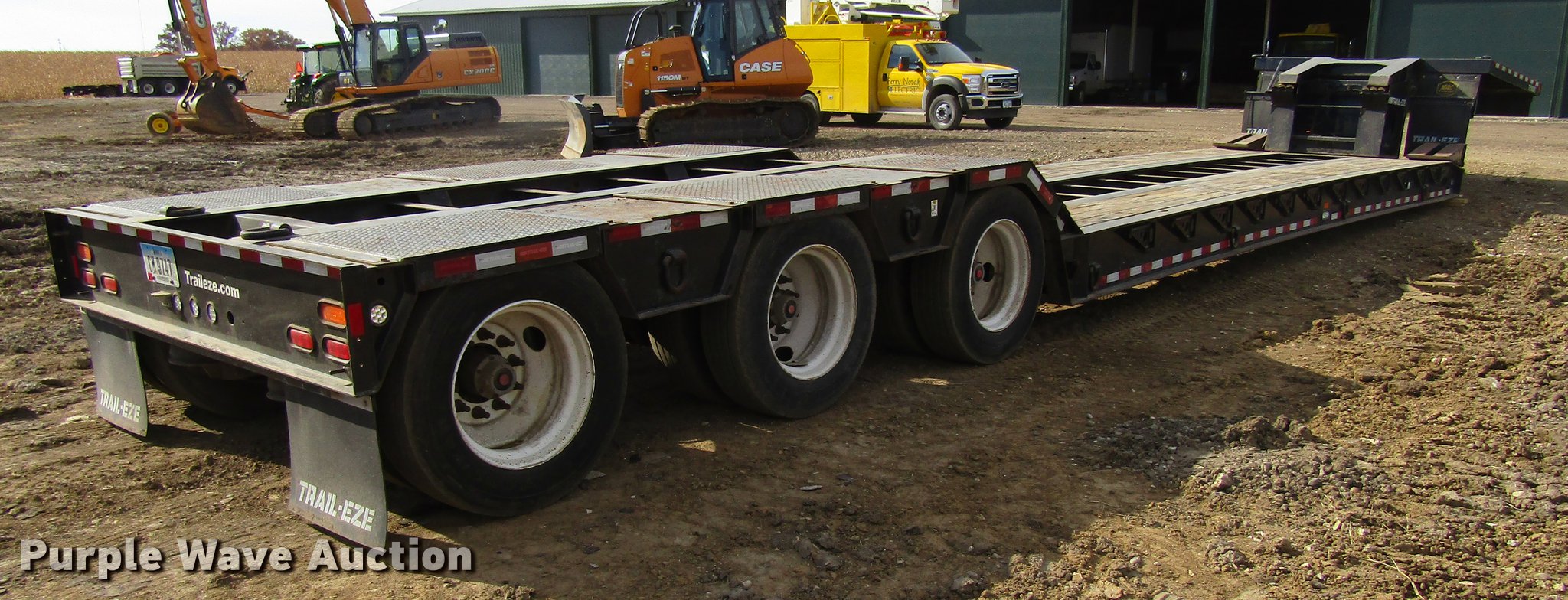 Purple Wave is selling a used Equip. Trailer in Iowa. This item is a 2012 Trail Eze TE110DG53 low boy equipment trailer with the following: 53' overall length, 24'L x 96"W steel and wood main deck, 9'L top deck, 13'L rear deck, 24" floor height, Pull-out steel outriggers, Recessed toolbox, Detachable neck, Fifth wheel plate, Air brakes, Air suspension, Triple axle, Air lift rear axle, 275/70R22.5 tires, GVWR 132,040 lbs, FAWR 25,000 lbs
