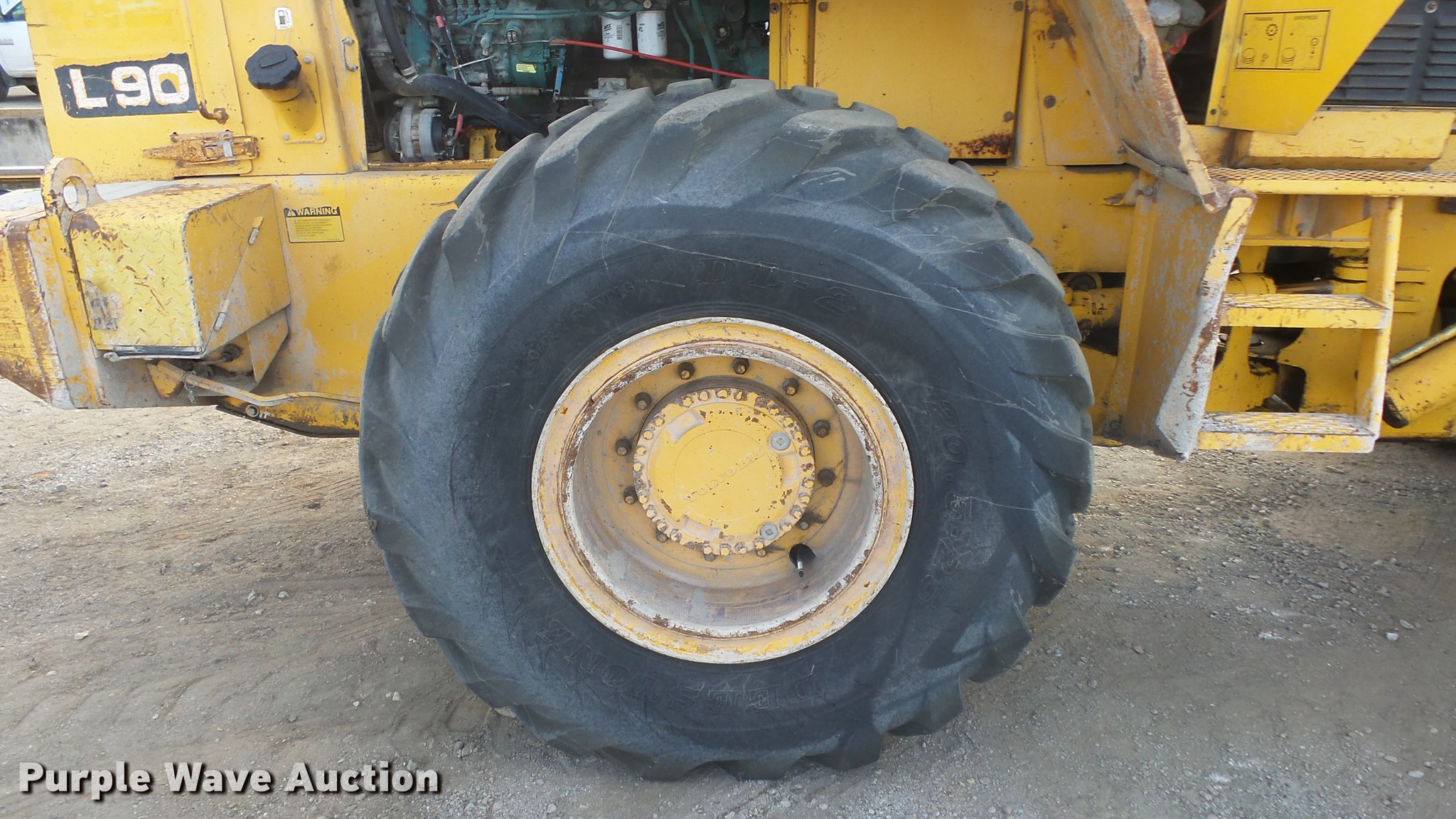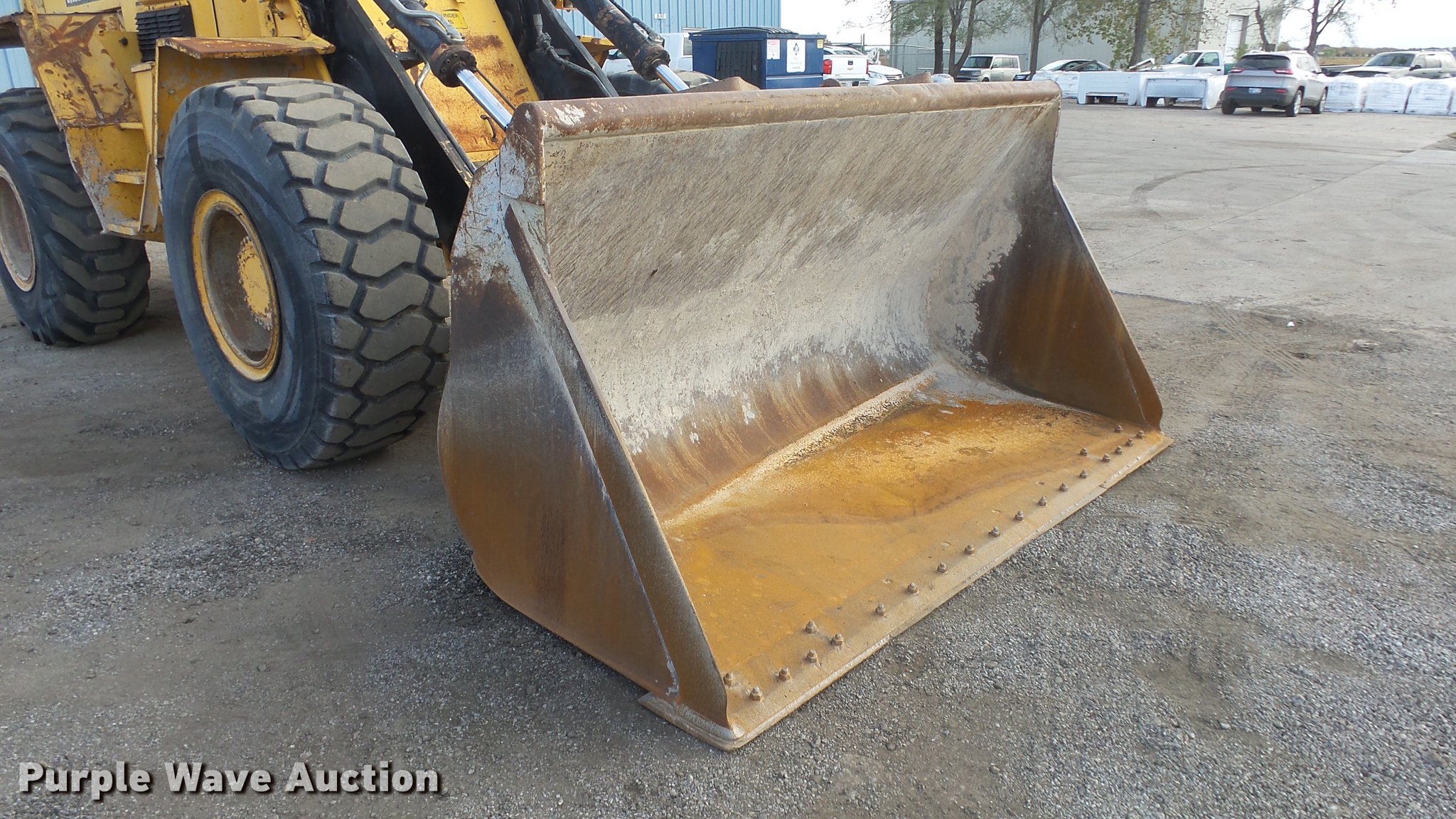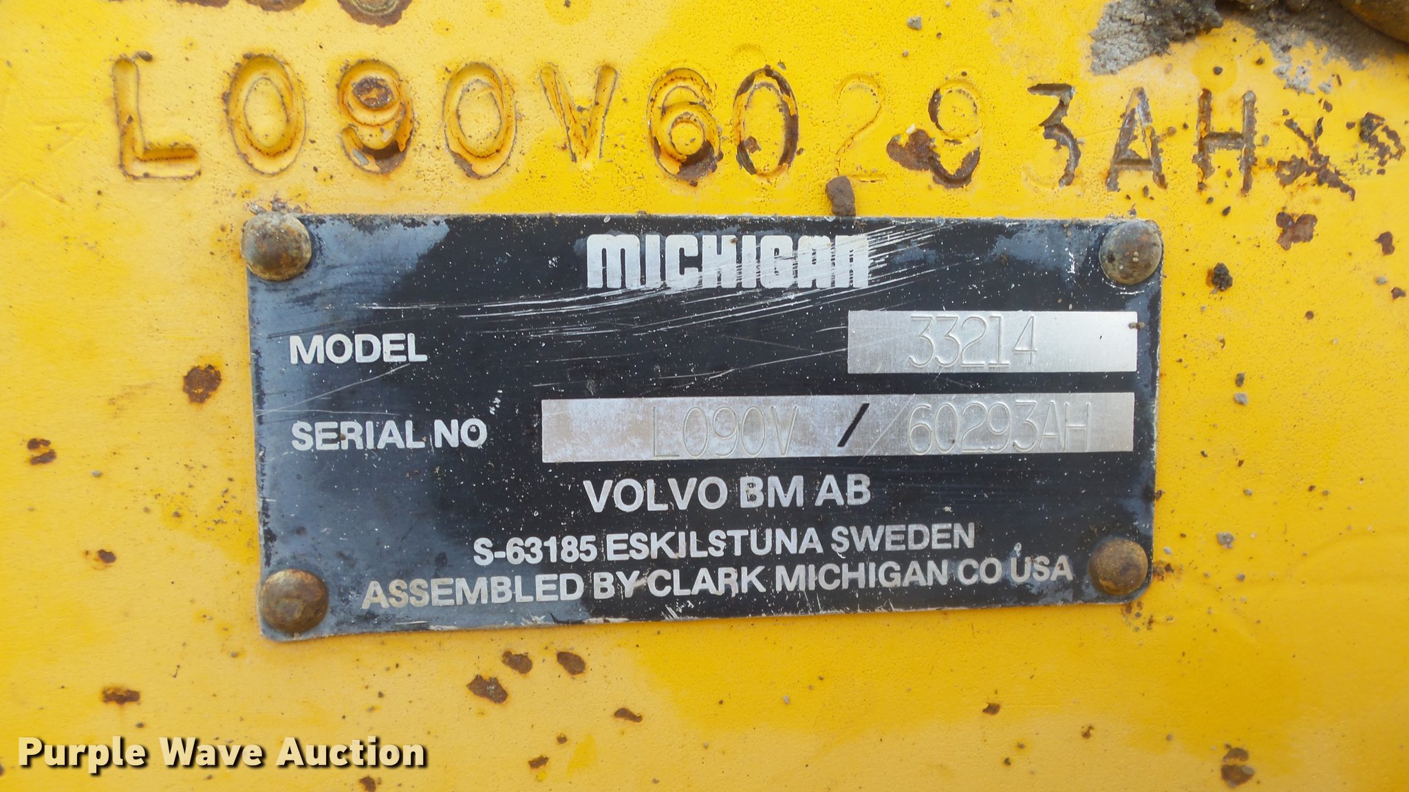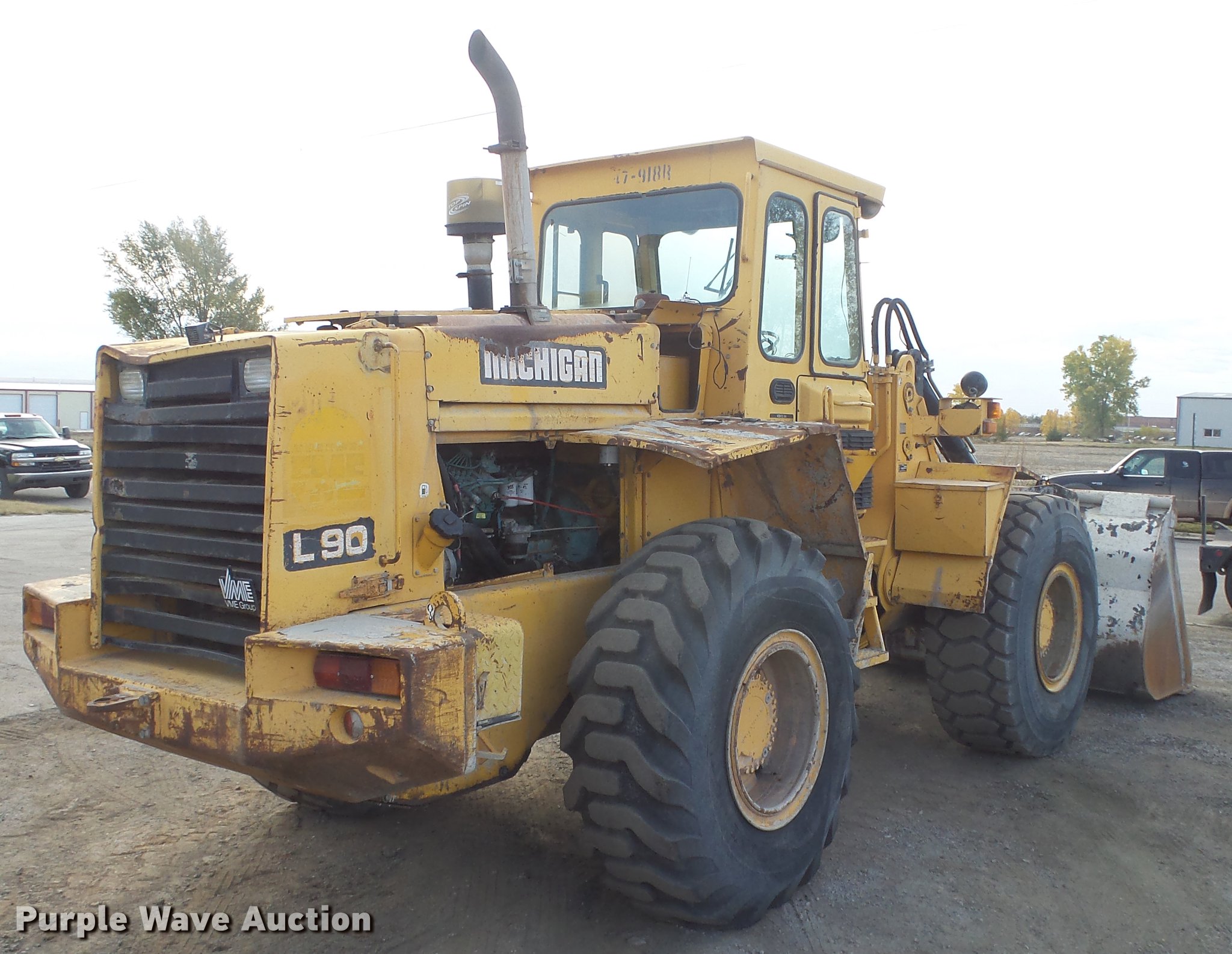 Purple Wave is selling a used Wheel Loader in Kansas. This item is a 1988 Michigan L90 wheel loader with the following: 23,827 hours on meter, Volvo TD616 six cylinder diesel engine, Powershift transmission, 4F-4R gears, Enclosed cab, EROPS, Heat, Three-lever bucket controls, Wipers, Front and rear work lights, 101"W bucket, Bolt-on cutting edge, Hydraulic quick coupler, 20.5R25 tires, Serial L090V60293AH