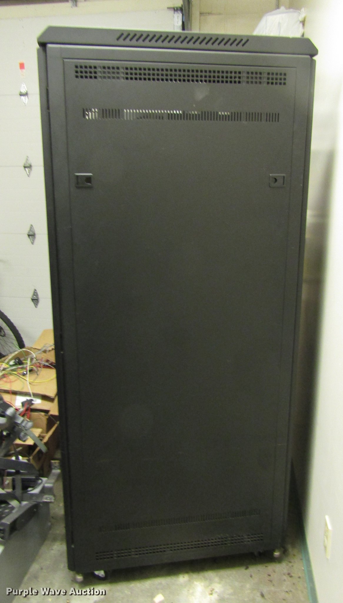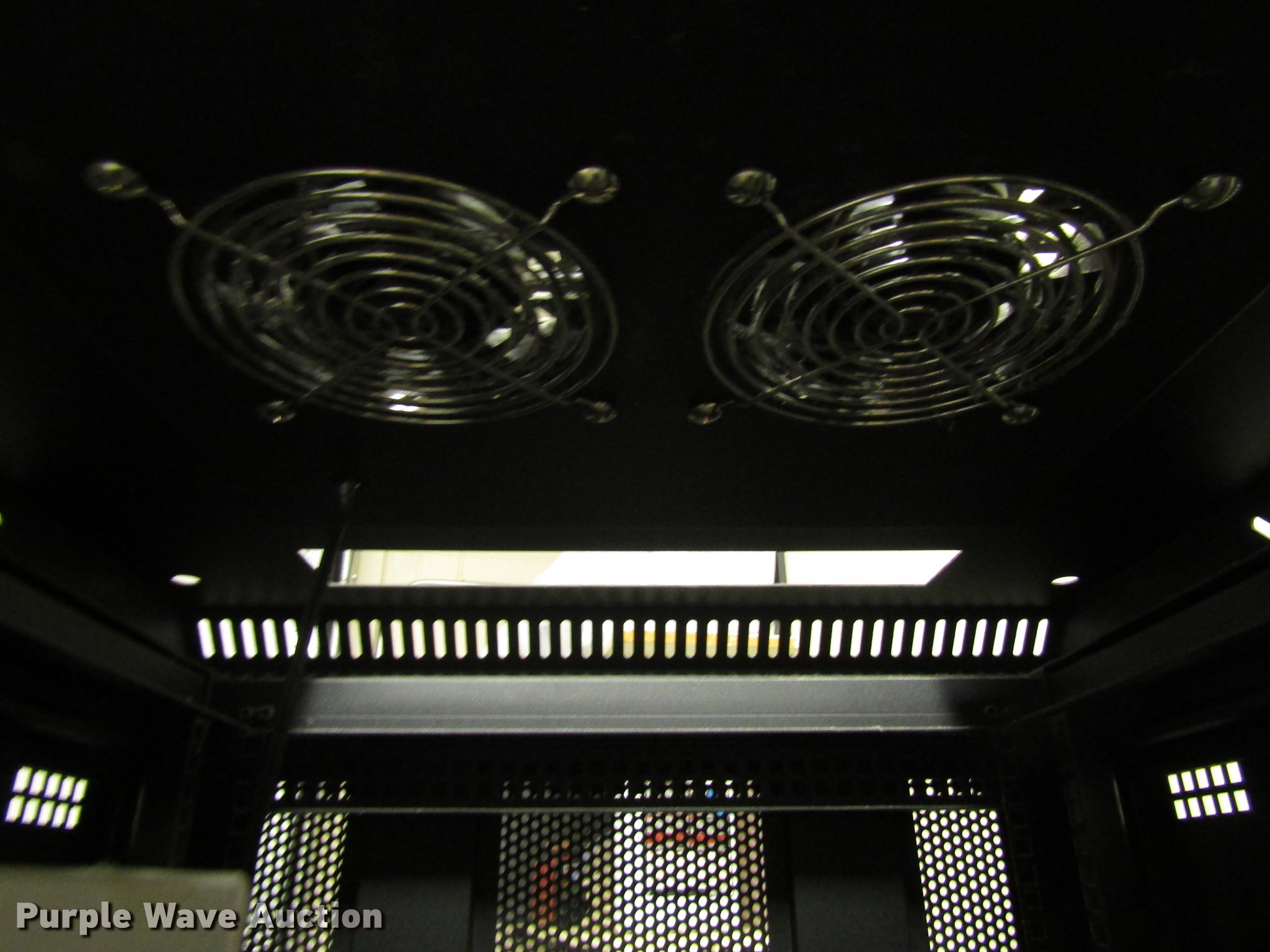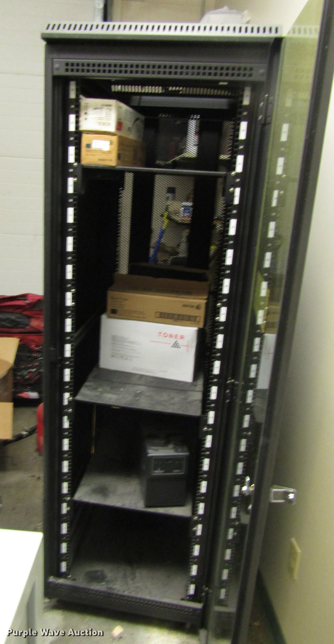 Purple Wave is selling a used Electronics in Kansas. This item is a Electronic cabinet with the following: 25"L x 36"W x 80.5"H, (3) shelves, Cooling fan, Server rack, 20 outlet power strip