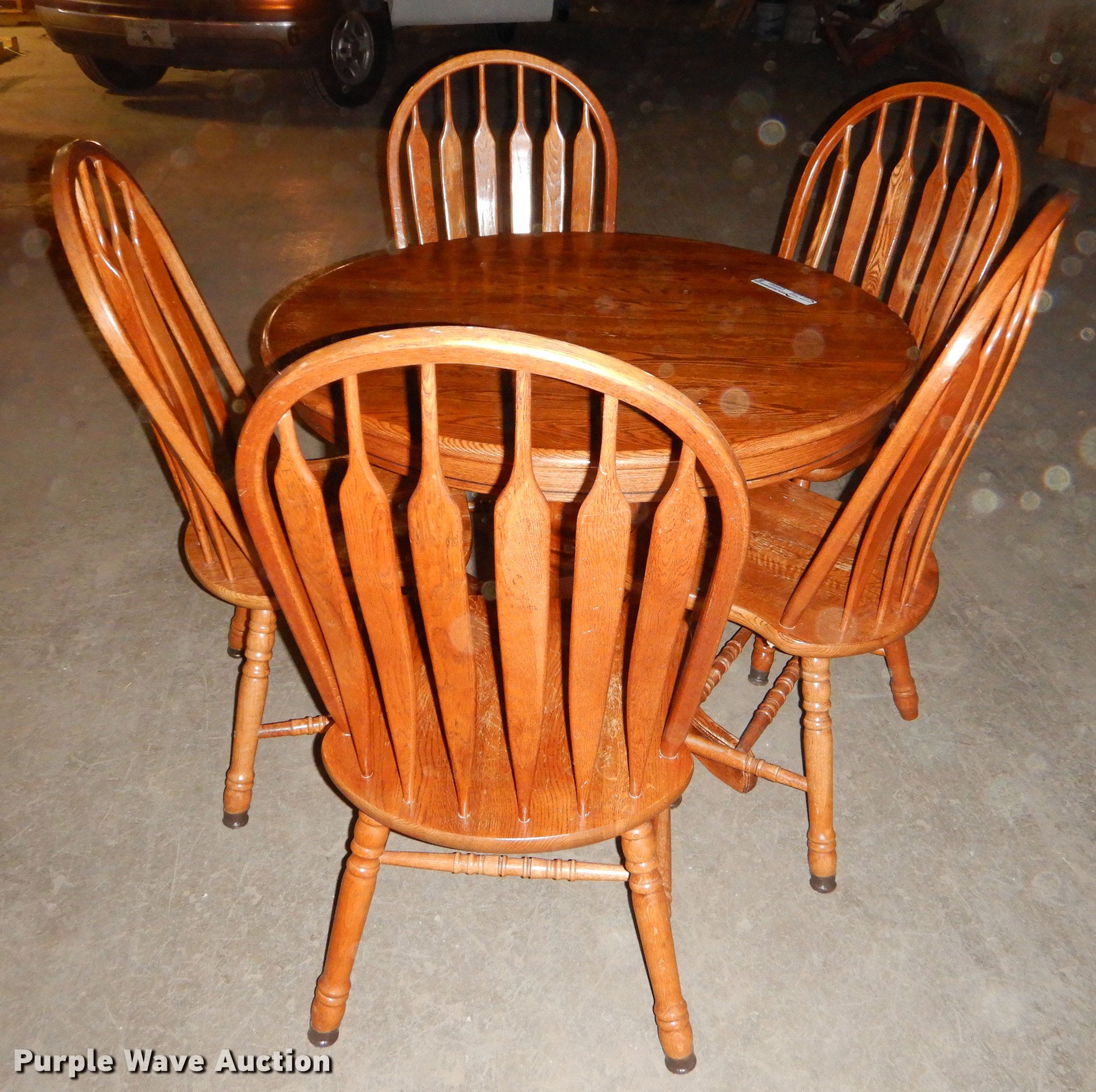 Purple Wave is selling a used Furniture in Kansas. This item is a Furniture with the following: Wood table, 42" diameter, (5) chairs