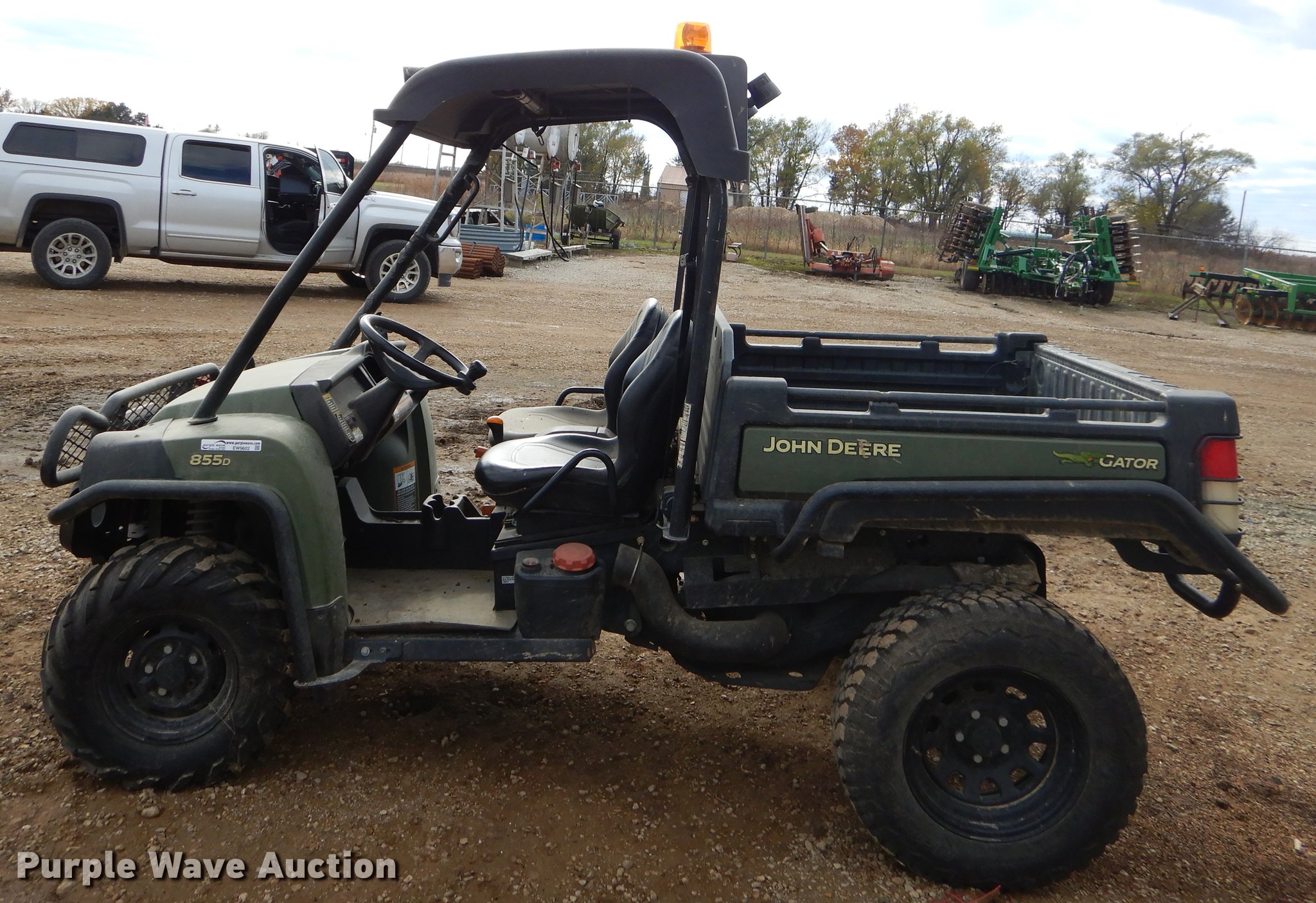 Purple Wave is selling a used Utility Vehicle in Kansas. This item is a 2012 John Deere Gator 855DSL utility vehicle with the following: 517 hours on meter, Hours may vary, still in use, John Deere diesel engine, Hydrostatic transmission, Four wheel drive, Differential lock, Canopy, 12V outlet, Headlights, Rear work lights, Warning lights, Grill guard, Warn Pro Vantage winch, 4,500 lbs capacity, 47" x 53" bed, Receiver hitch, 26x9.00-12 front tires, 215/75R15 rear tires, Electrical issues
