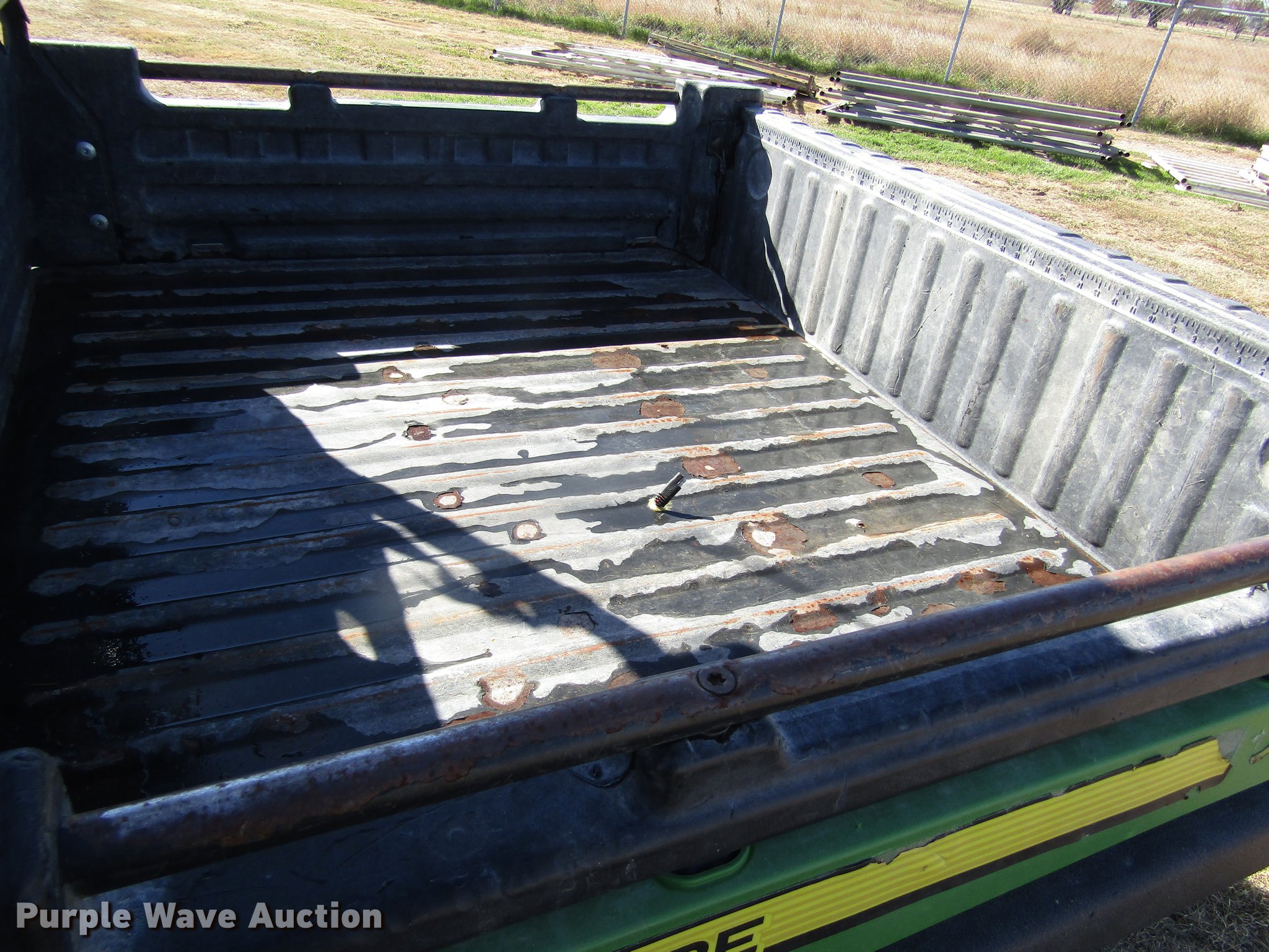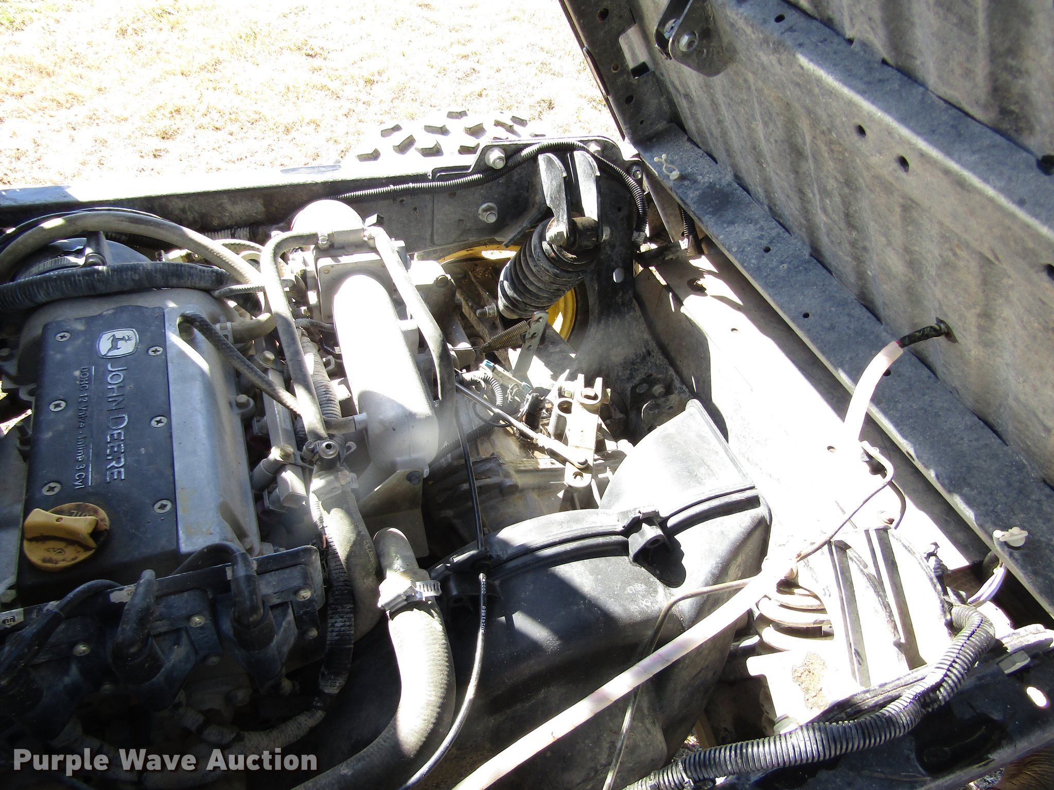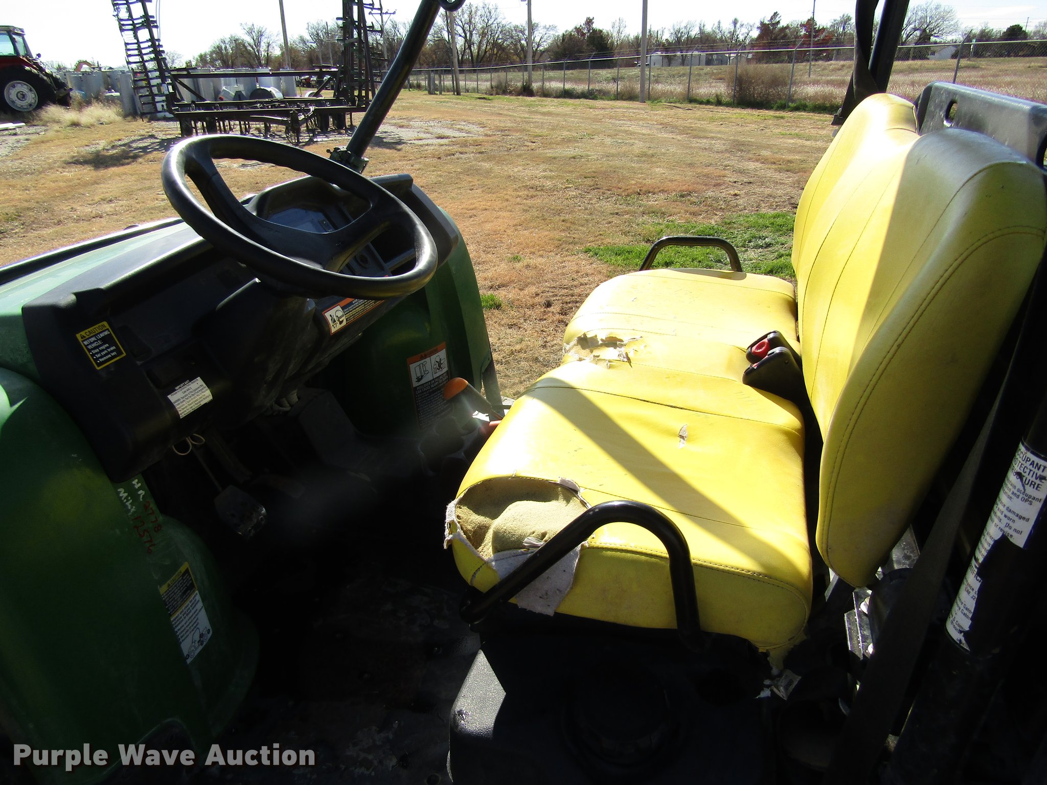 Purple Wave is selling a used Utility Vehicle in Kansas. This item is a 2013 John Deere HP Gator Ops utility vehicle with the following: 6,818 miles on odometer, Three cylinder gas engine, Automatic transmission, Single seat, Grill guard, 47"L x 55"W manual dump bed, 27 x 9.00R14 front tires, 27 x 11.00-14 rear tires