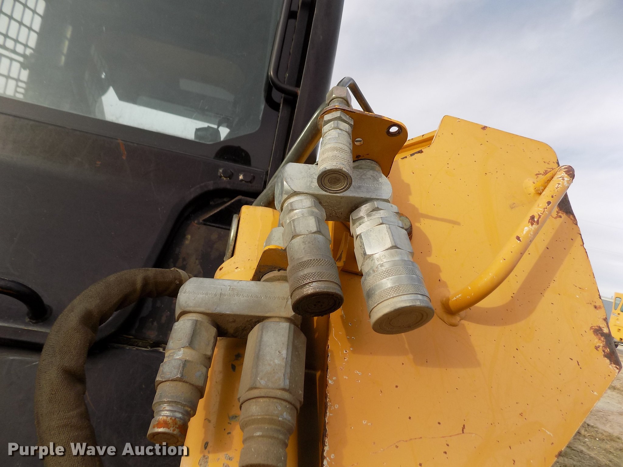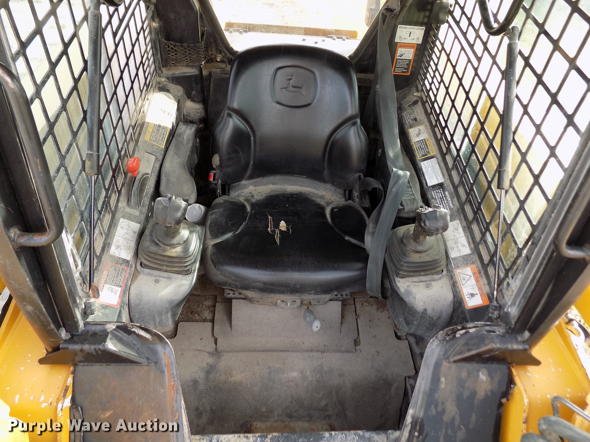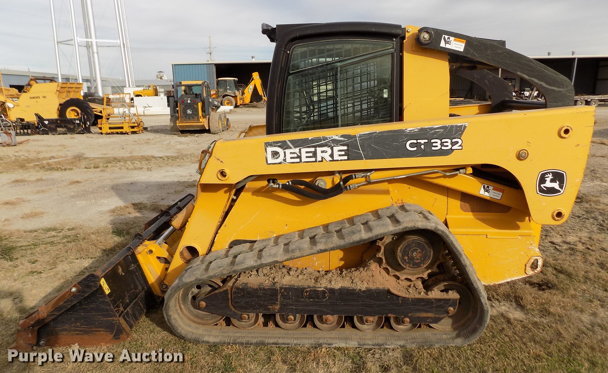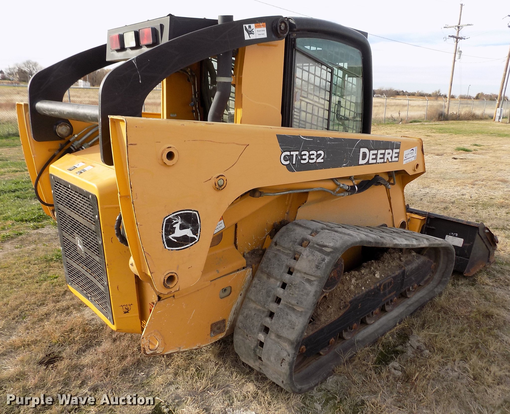 Purple Wave is selling a used Tracked Skid Steer Loader in Kansas. This item is a 2009 John Deere CT332 skid steer with the following: 2,442 hours on meter, John Deere 5030TW five cylinder turbo diesel engine, Two speed hydrostatic transmission, Enclosed cab, AC and heat, Joystick controls, Suspension seat, Front and rear work lights, Wipers, Block heater, High flow auxiliary hydraulics, Auxiliary electrical outlet, Hydraulic quick coupler, JCB low profile bucket, 84"W, Bolt-on cutting edge, 17.5"W tracks, Unit will not move at full speed, possible hydraulic issues, Serial T0332TM178151