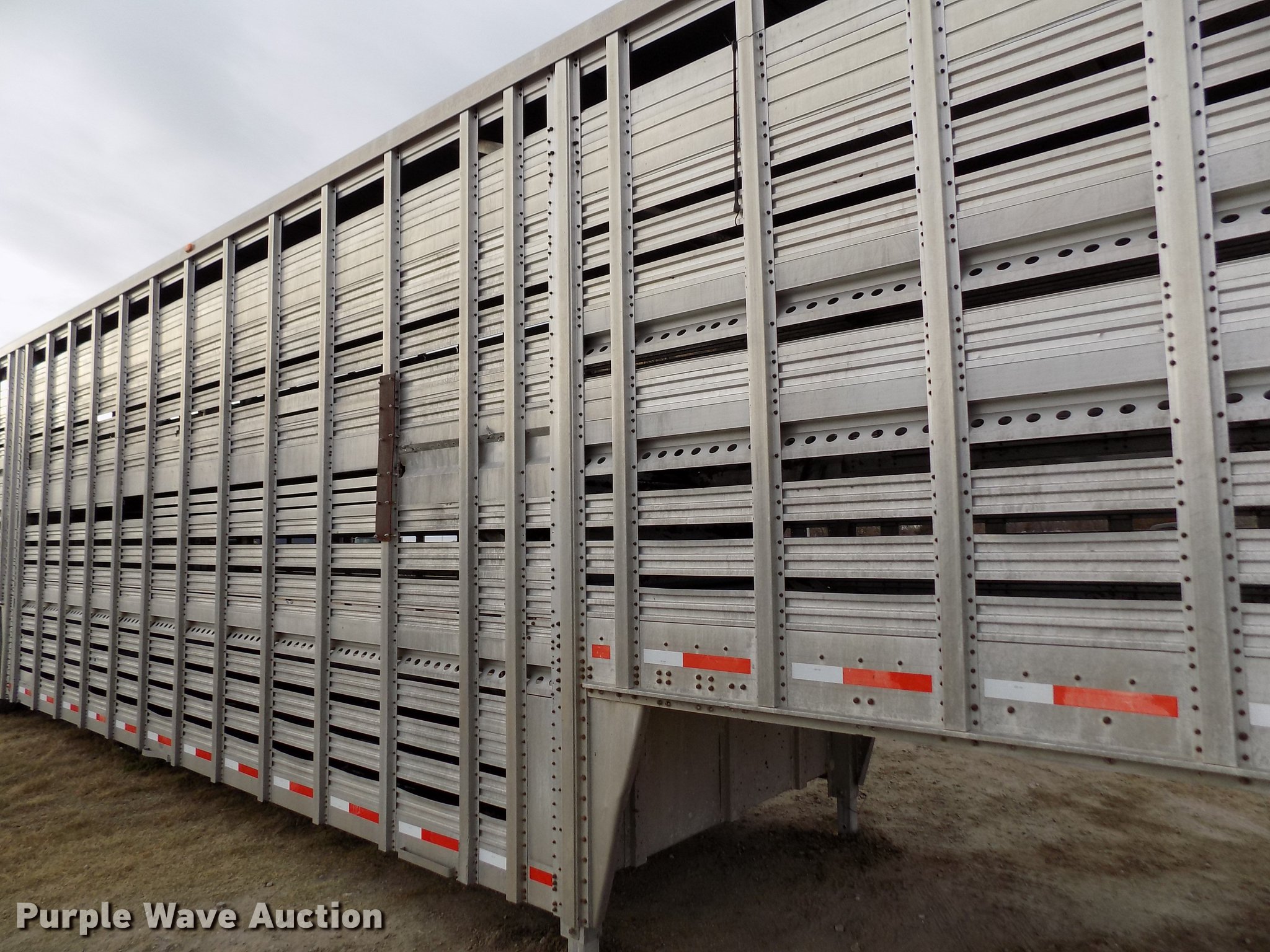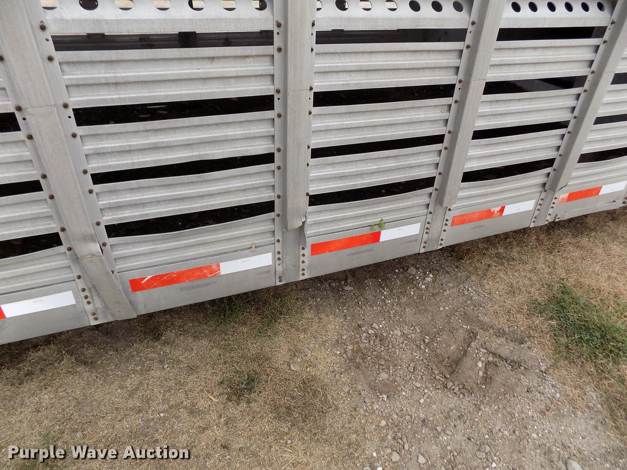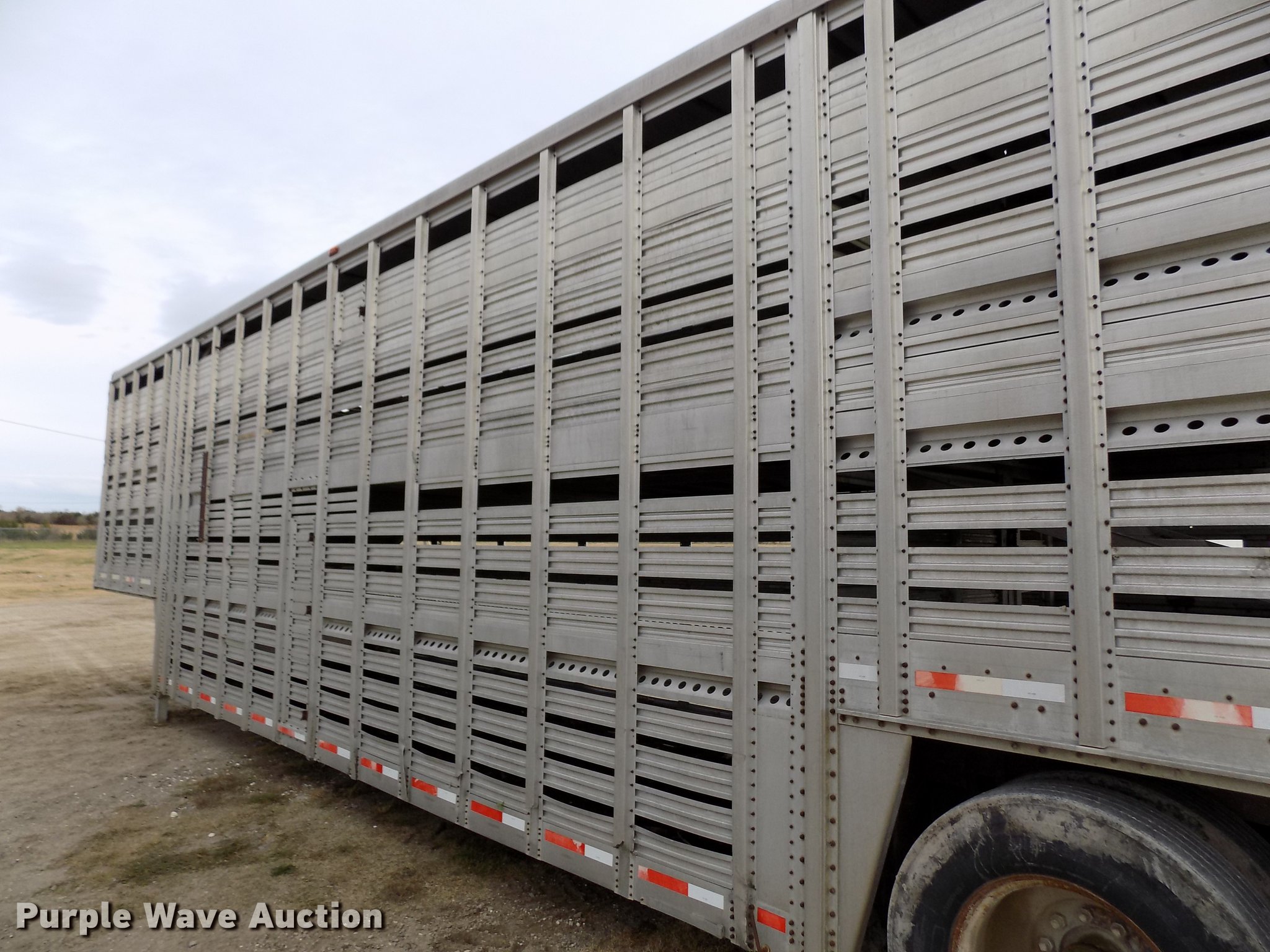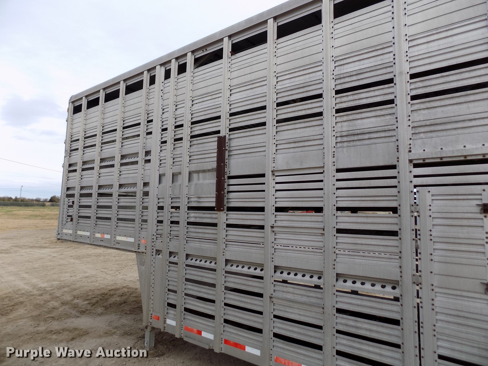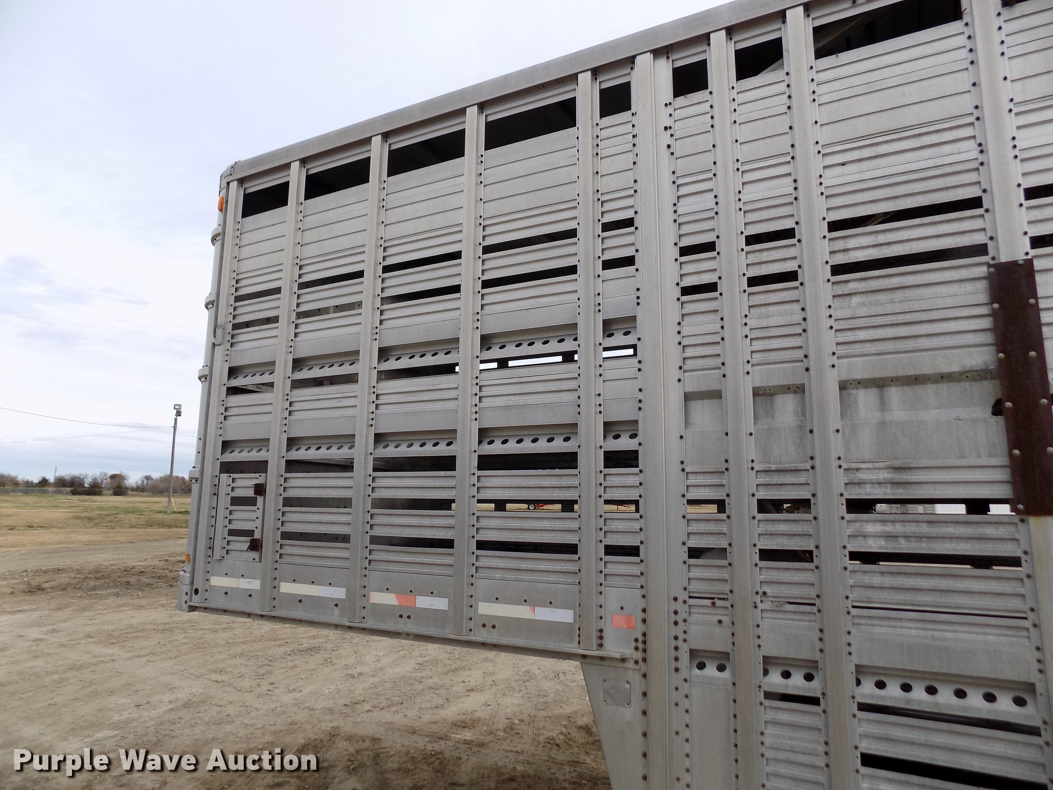 Purple Wave is selling a used Livestock Trailer in Kansas. This item is a 1974 Wilson Cattle Pot livestock trailer with the following: 44'L x 96"W, Two decks, Roll up rear gate, Clean-out door, Dock bumper, Aluminum construction, Fifth wheel plate, Dual leg landing gear, Spring suspension, Air brakes, Steel wheels, 11R24.5 tires, GVWR 60,000 lbs