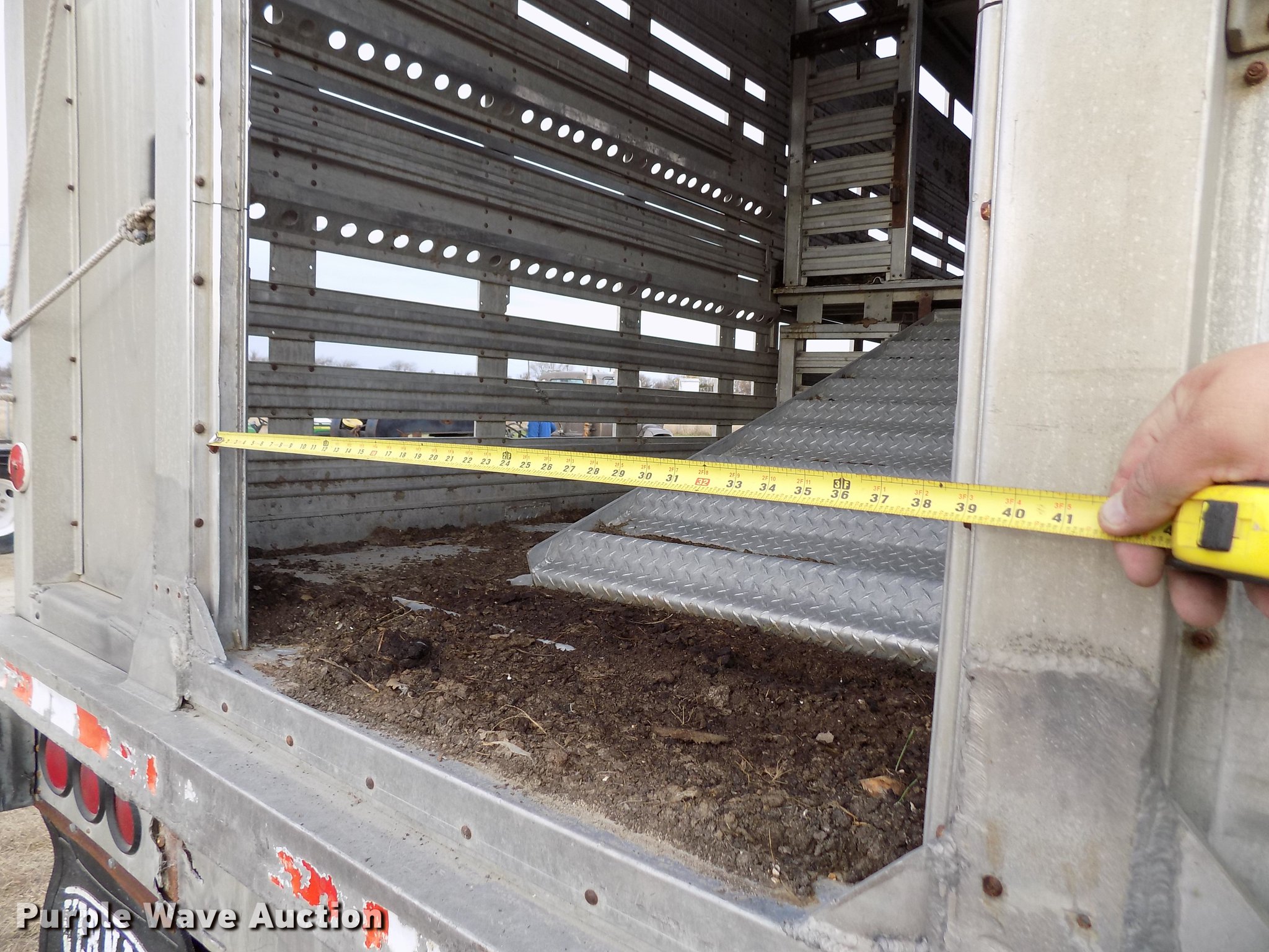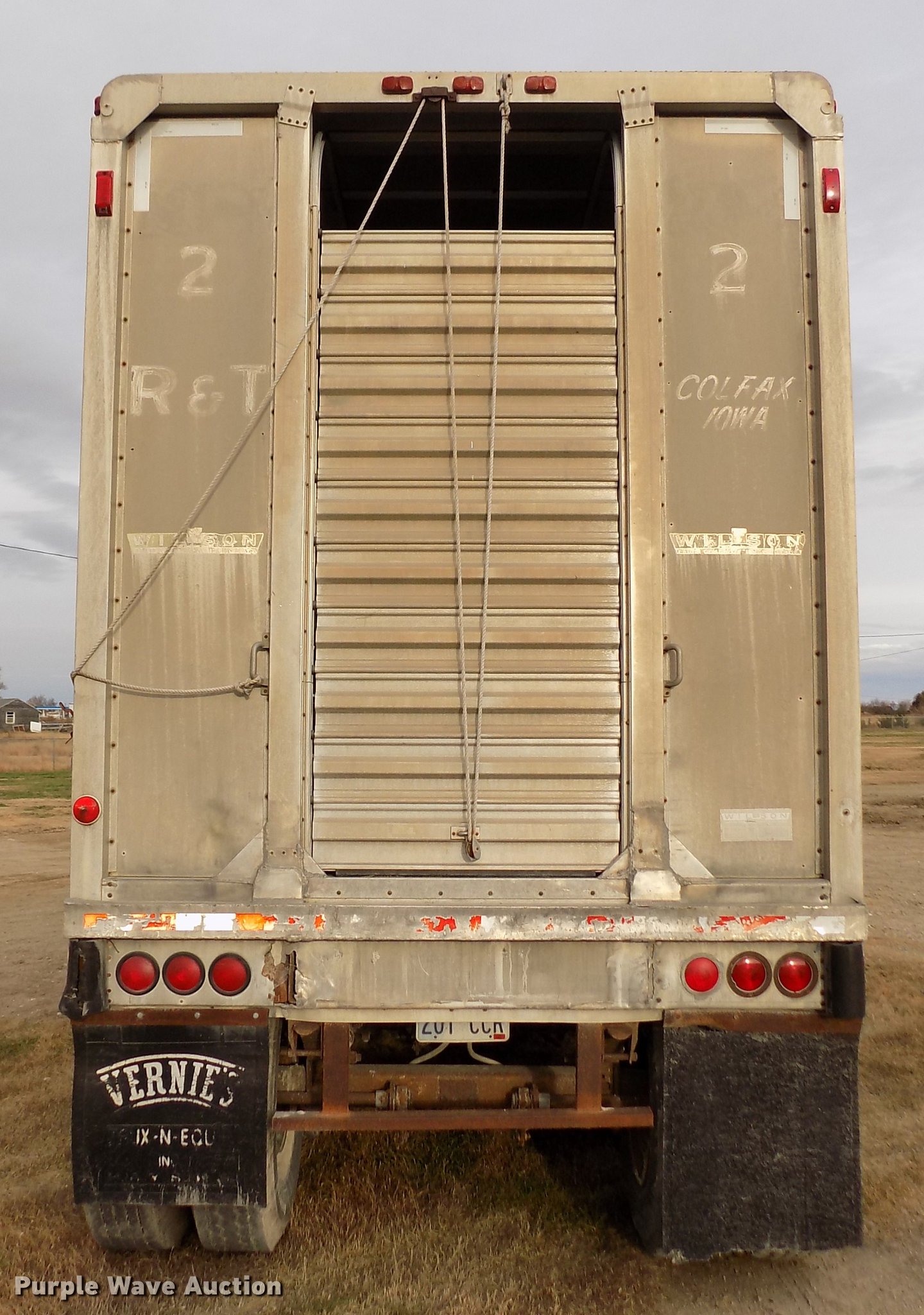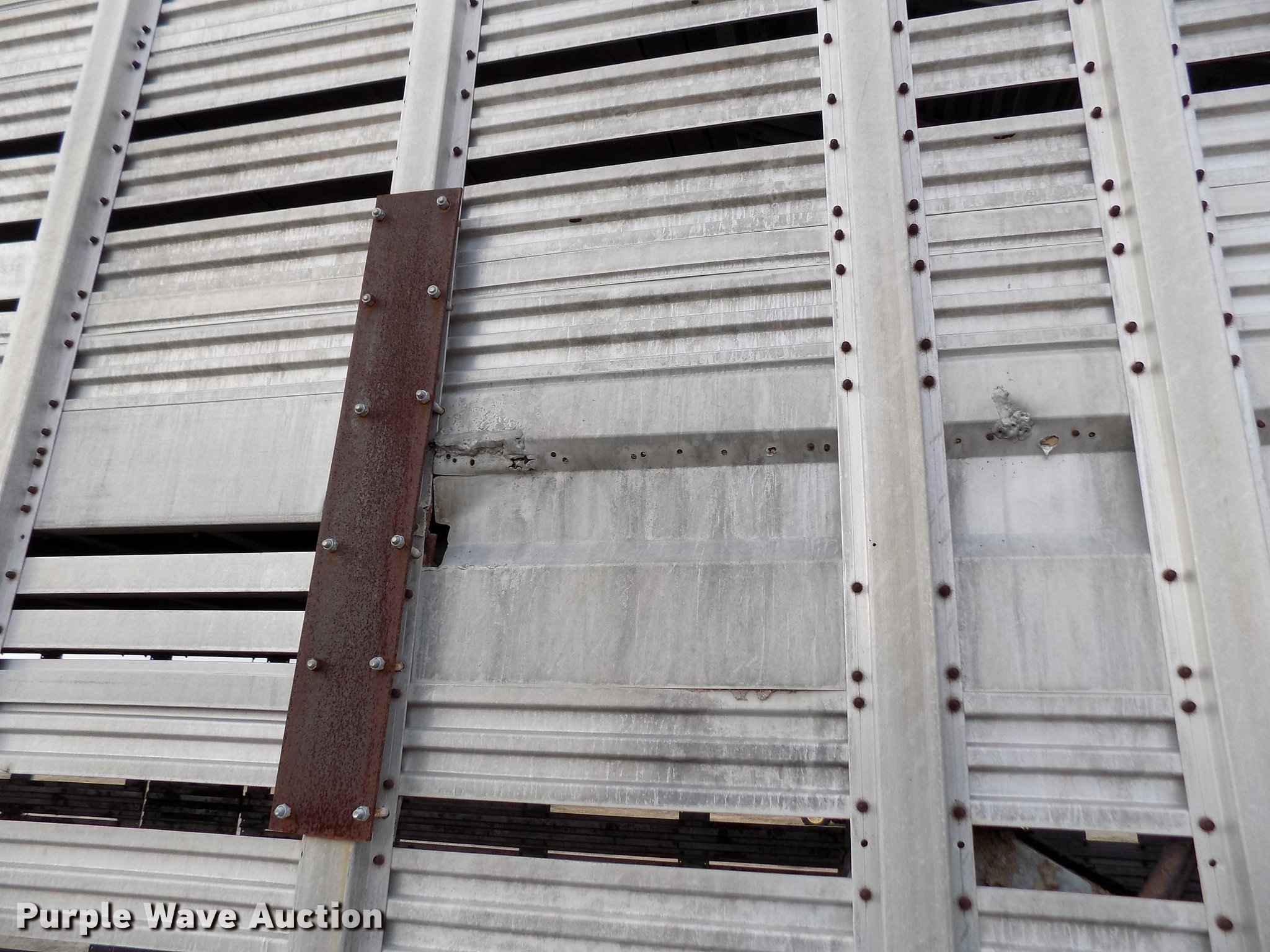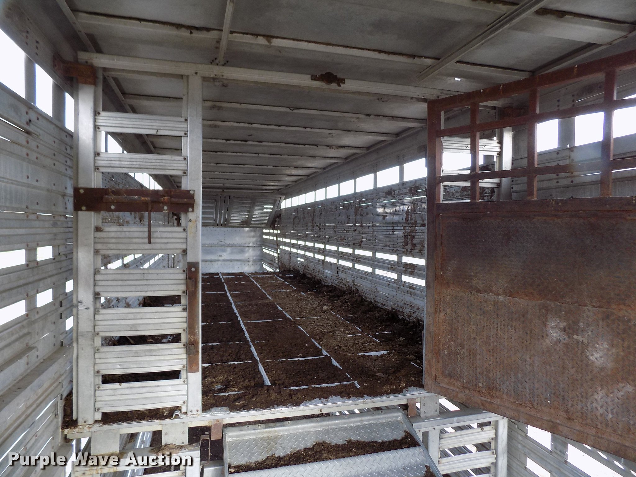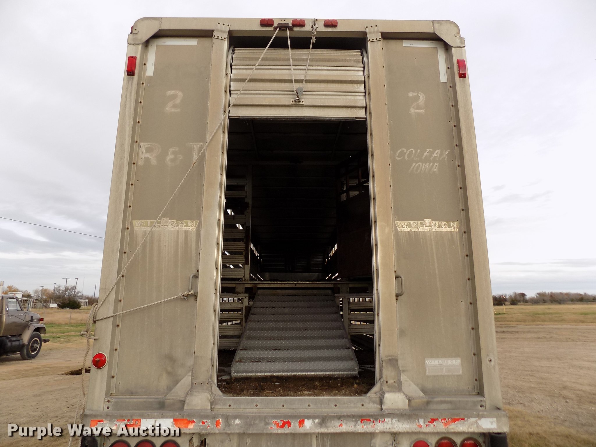Purple Wave is selling a used Livestock Trailer in Kansas. This item is a 1974 Wilson Cattle Pot livestock trailer with the following: 44'L x 96"W, Two decks, Roll up rear gate, Clean-out door, Dock bumper, Aluminum construction, Fifth wheel plate, Dual leg landing gear, Spring suspension, Air brakes, Steel wheels, 11R24.5 tires, GVWR 60,000 lbs