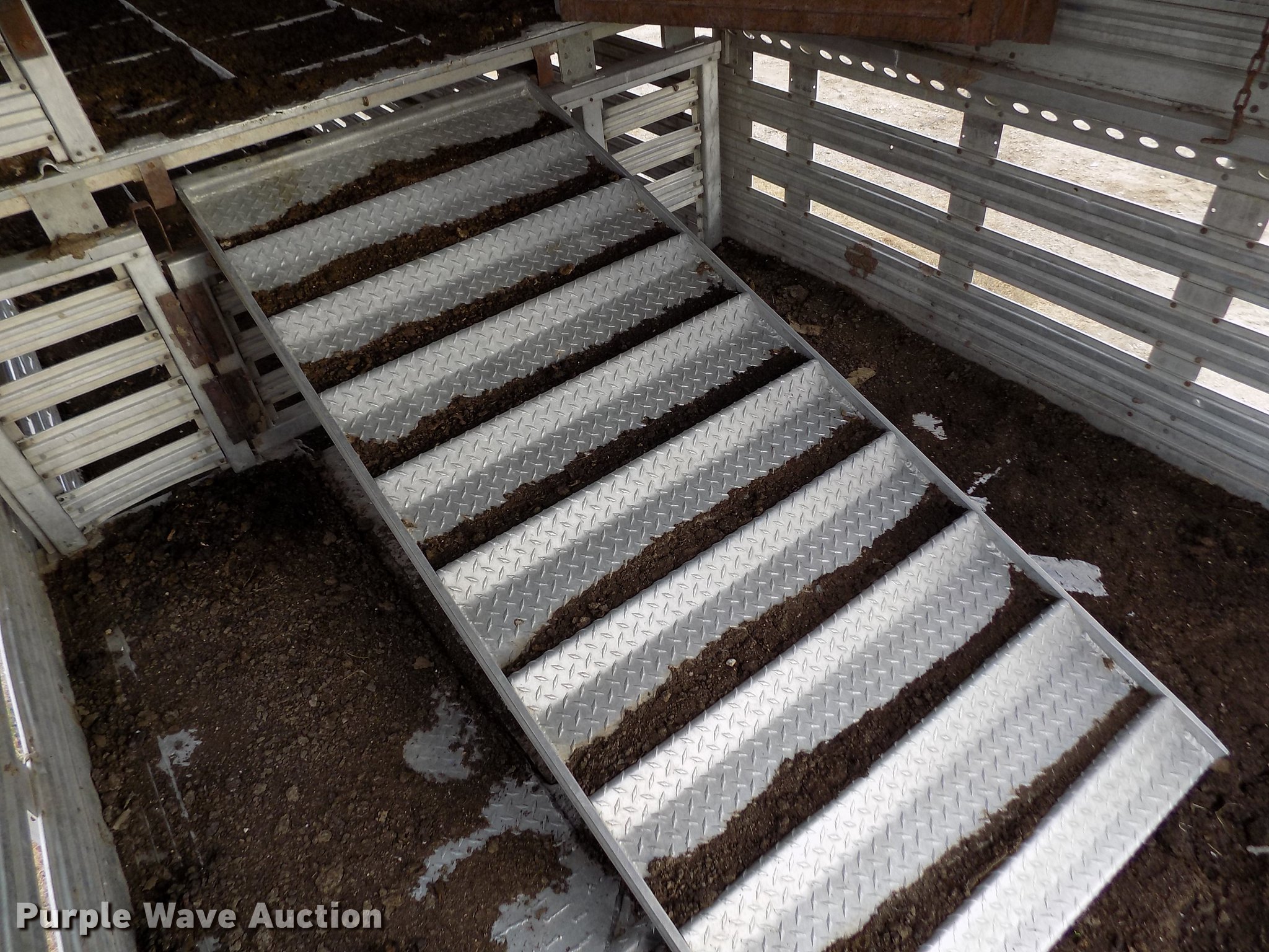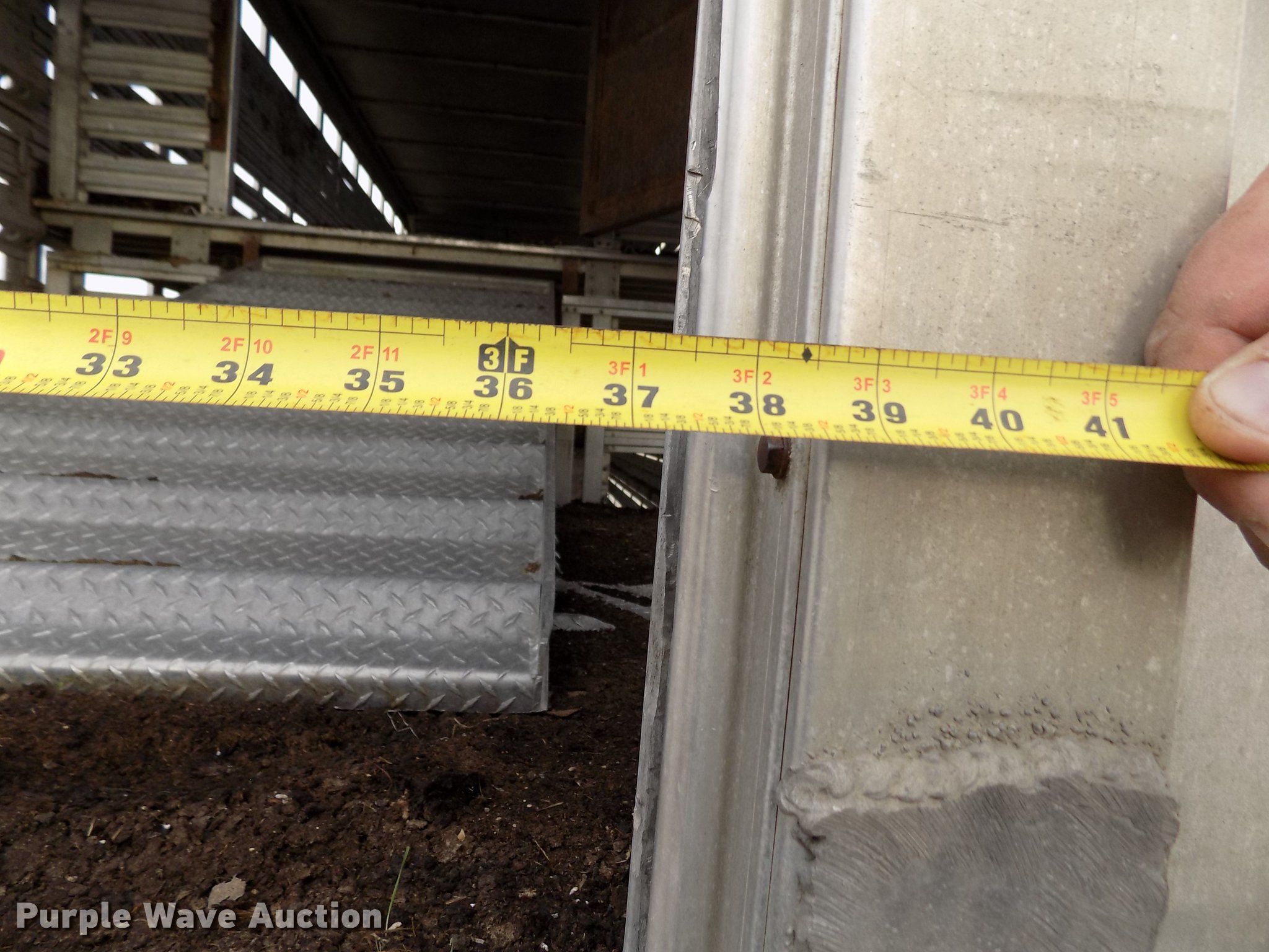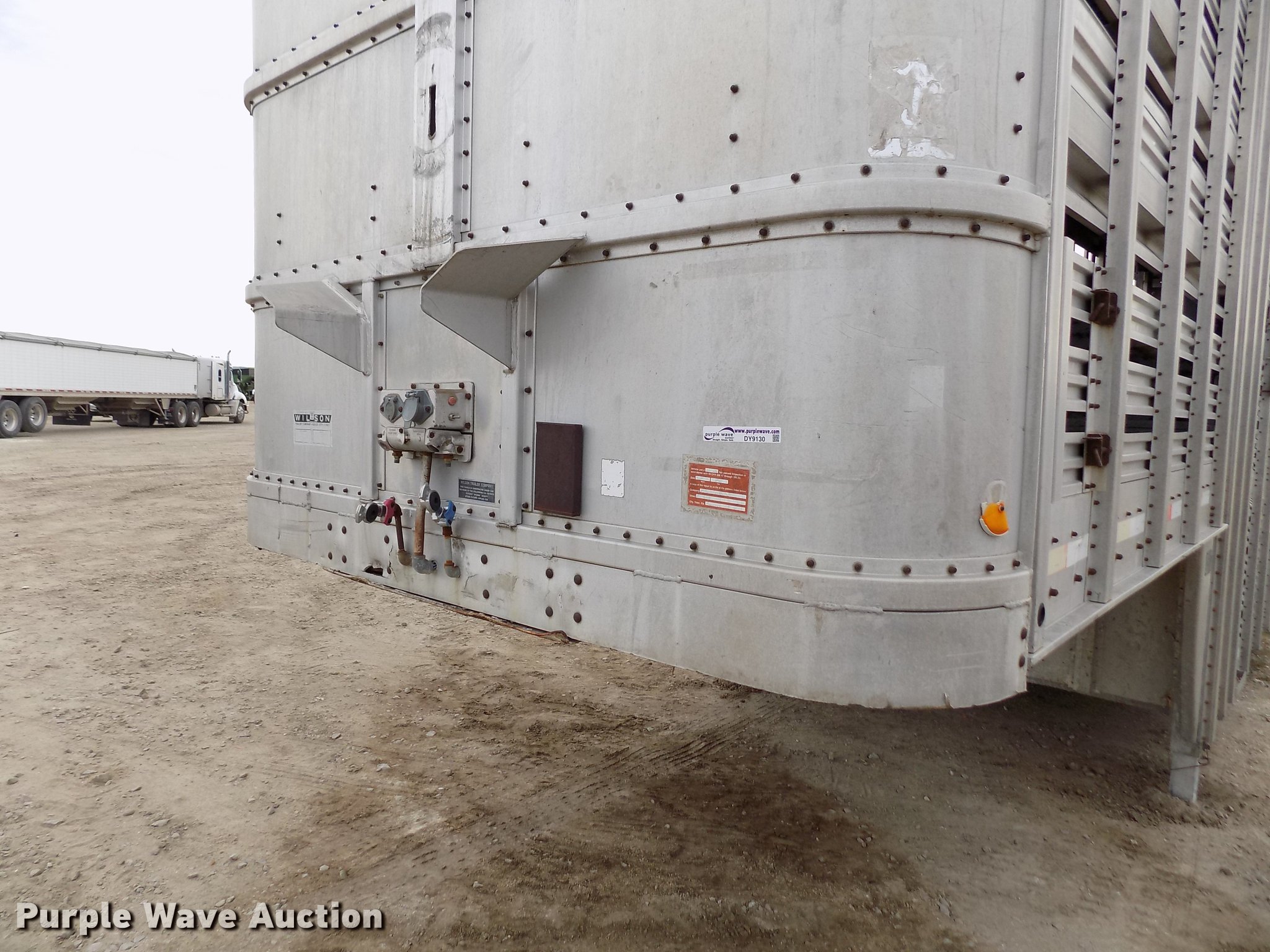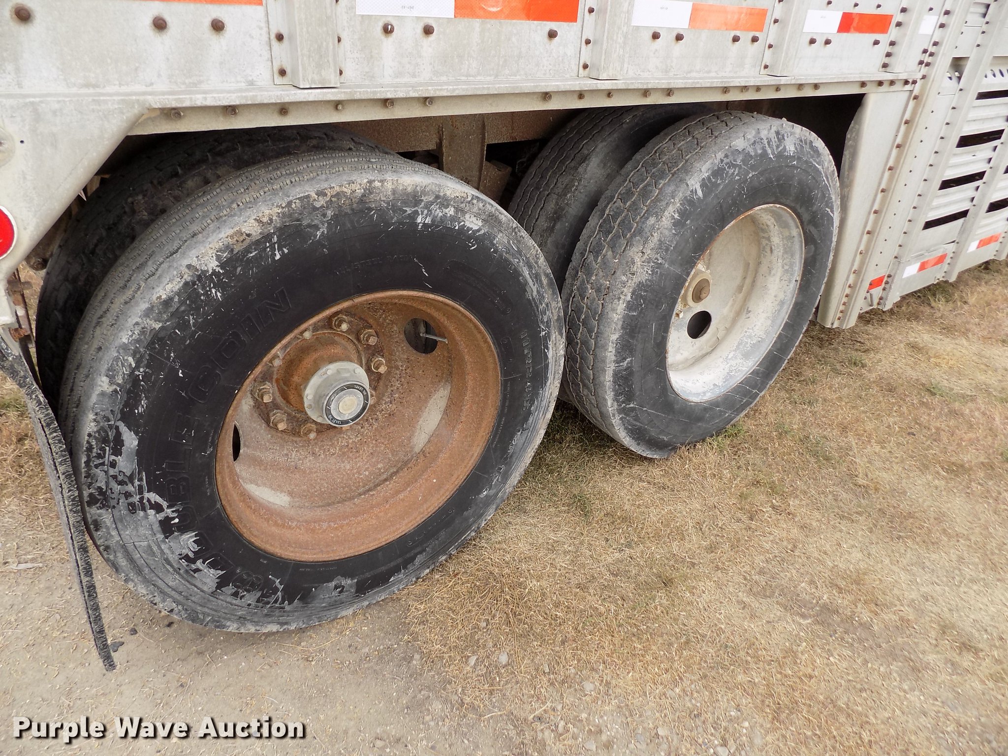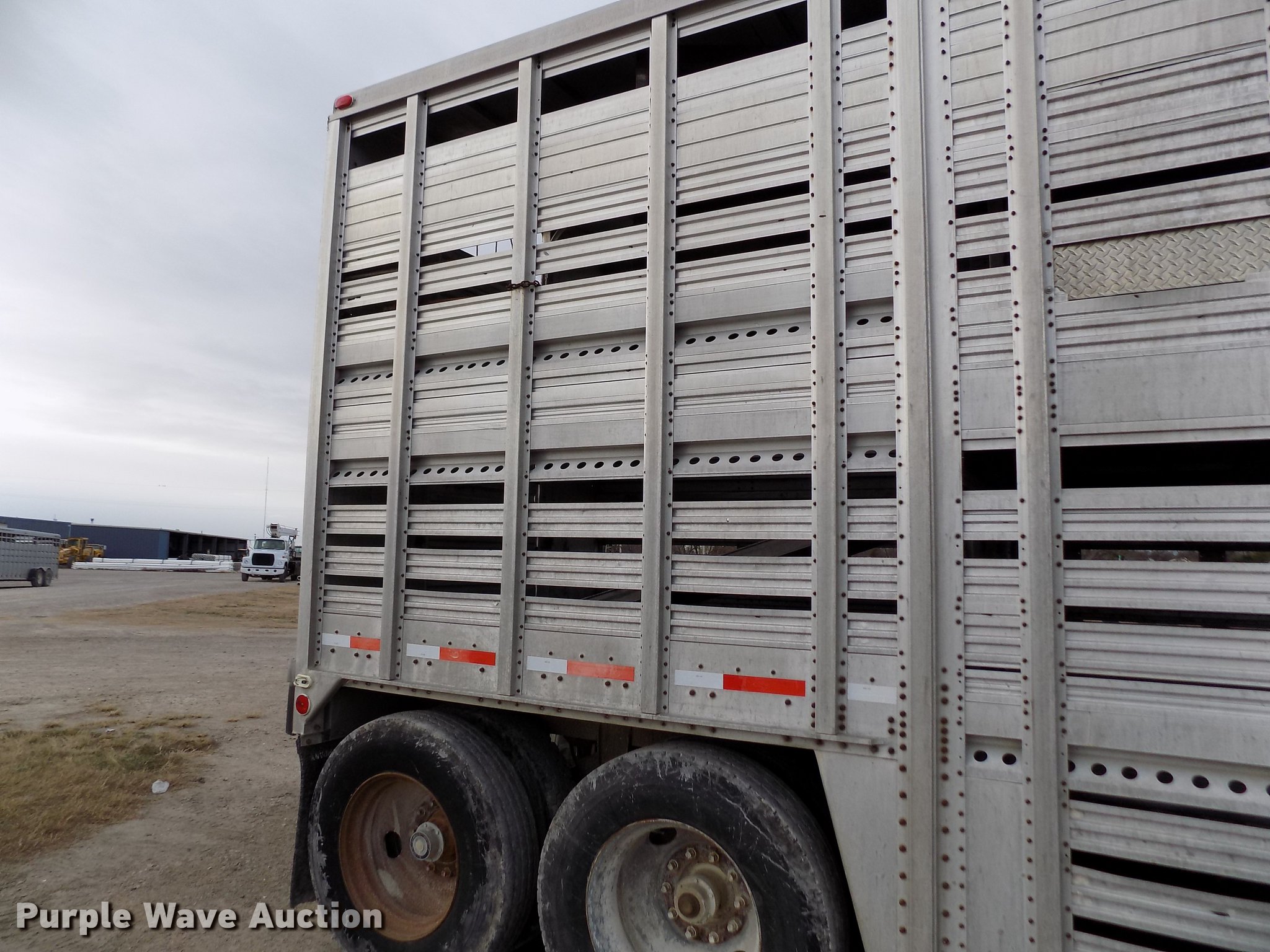 Purple Wave is selling a used Livestock Trailer in Kansas. This item is a 1974 Wilson Cattle Pot livestock trailer with the following: 44'L x 96"W, Two decks, Roll up rear gate, Clean-out door, Dock bumper, Aluminum construction, Fifth wheel plate, Dual leg landing gear, Spring suspension, Air brakes, Steel wheels, 11R24.5 tires, GVWR 60,000 lbs