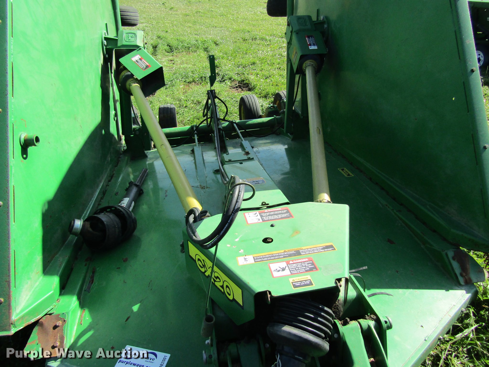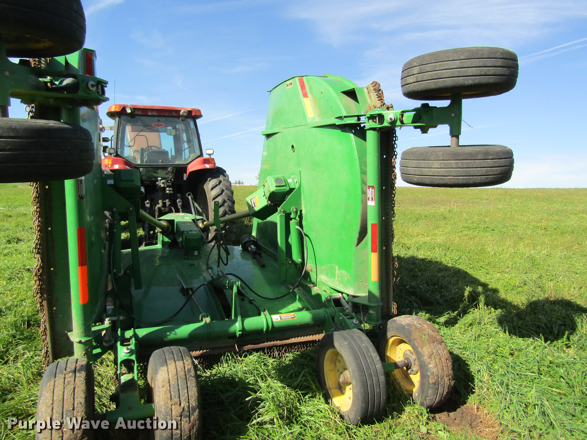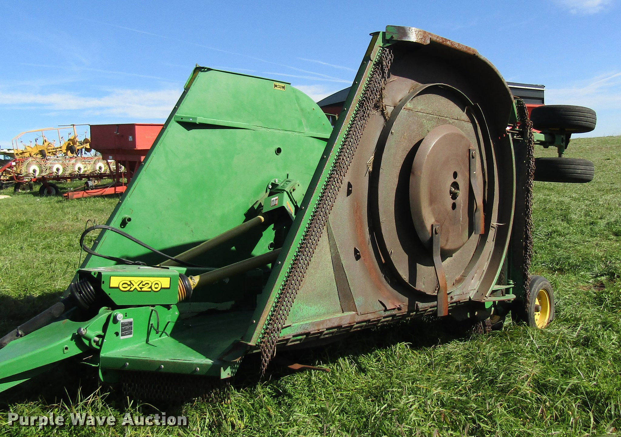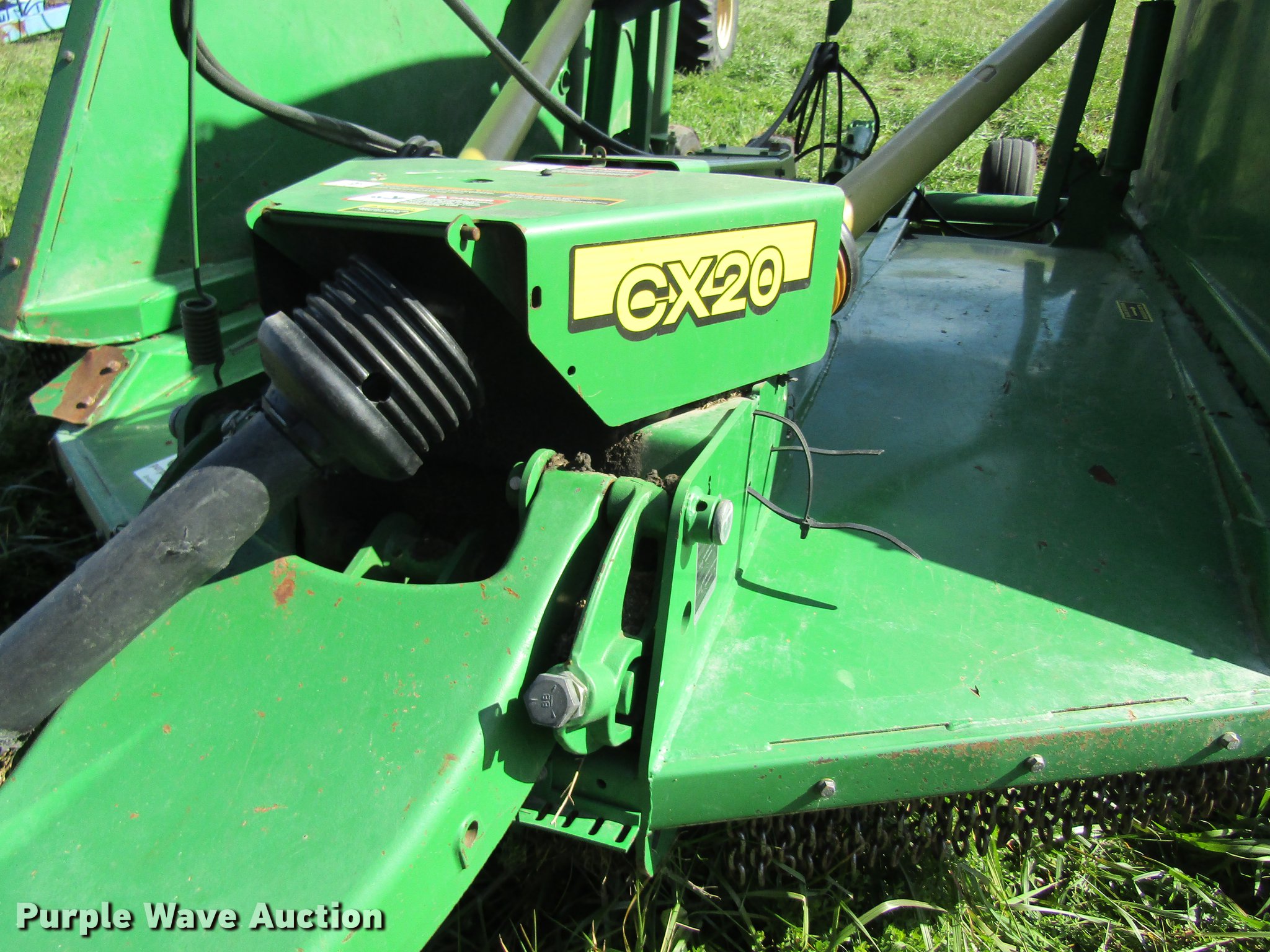 Purple Wave is selling a used Mower, Cutter, Shredder in Missouri. This item is a John Deere CX20 rotary mower with the following: 20'W, Hydraulic fold, 1000 PTO, Pin hitch, 26.9x14.5 tires, Serial 1P0CX20FJBP006685