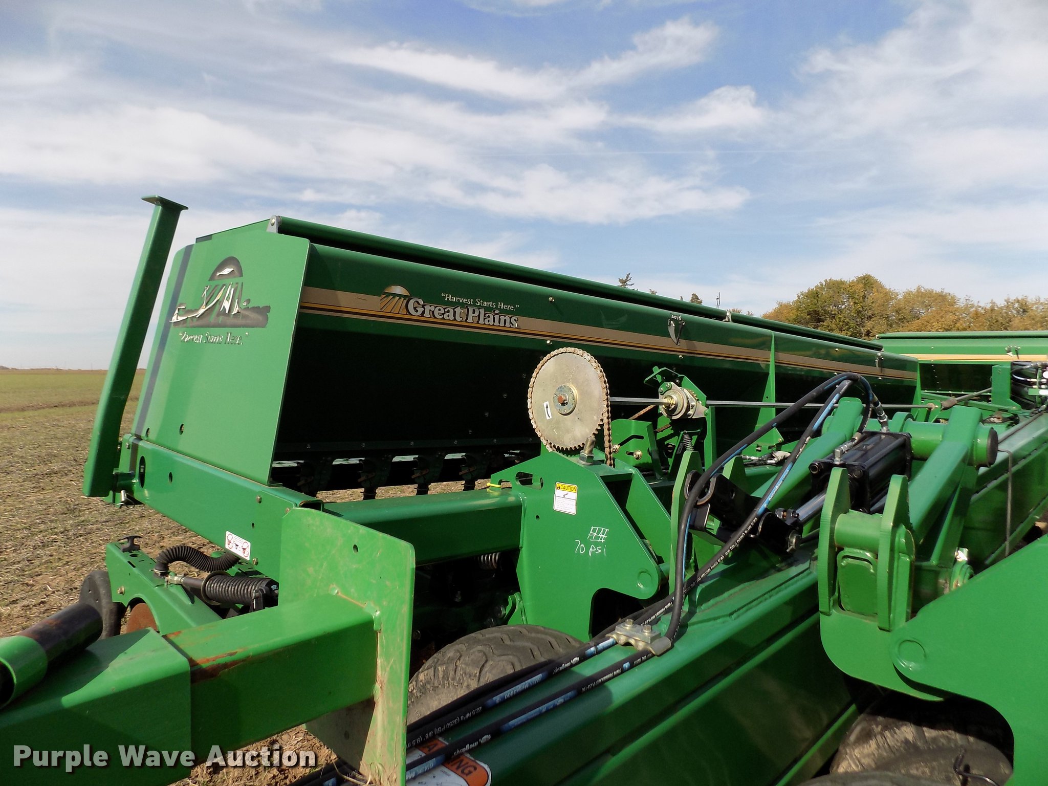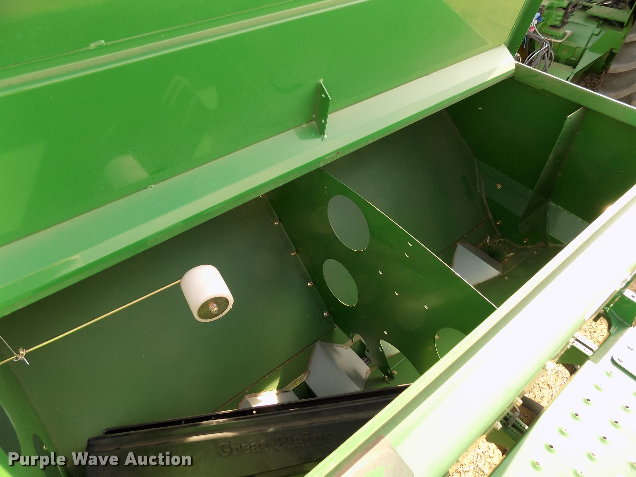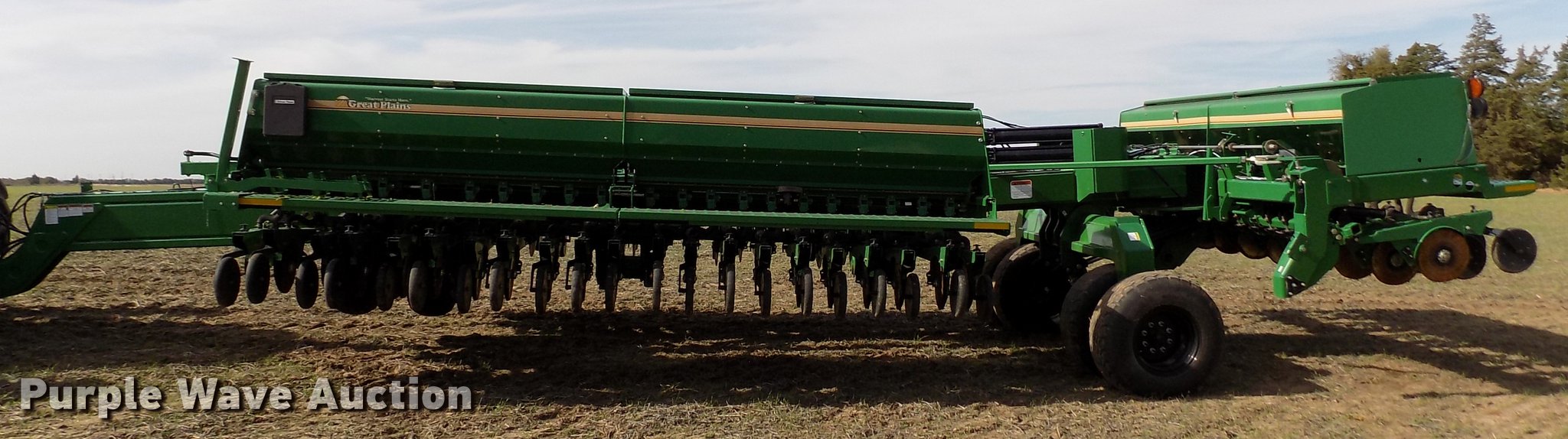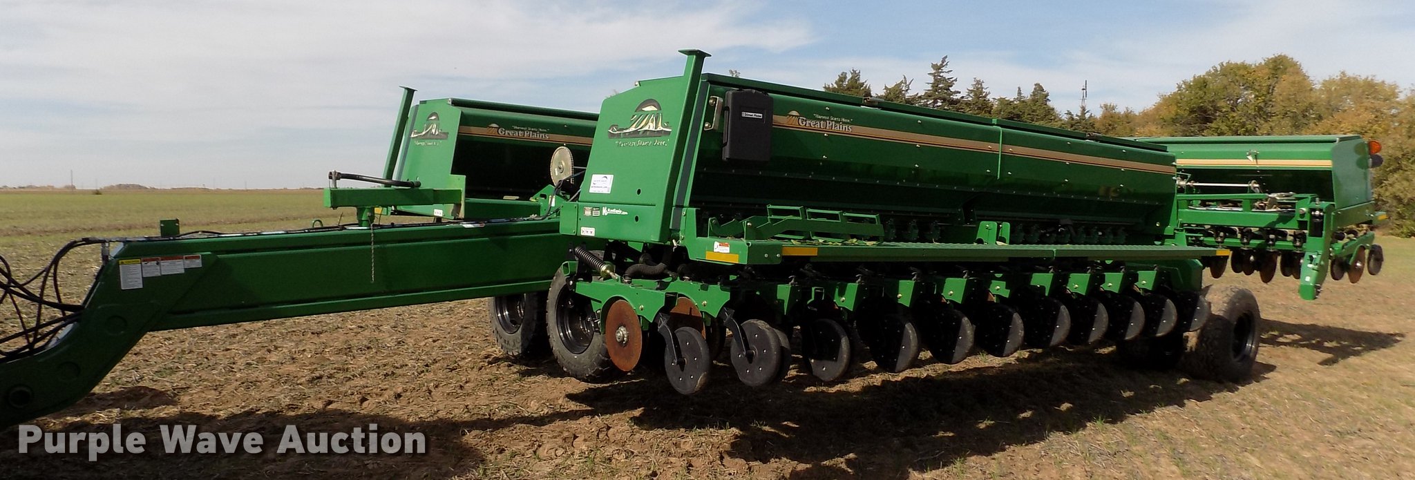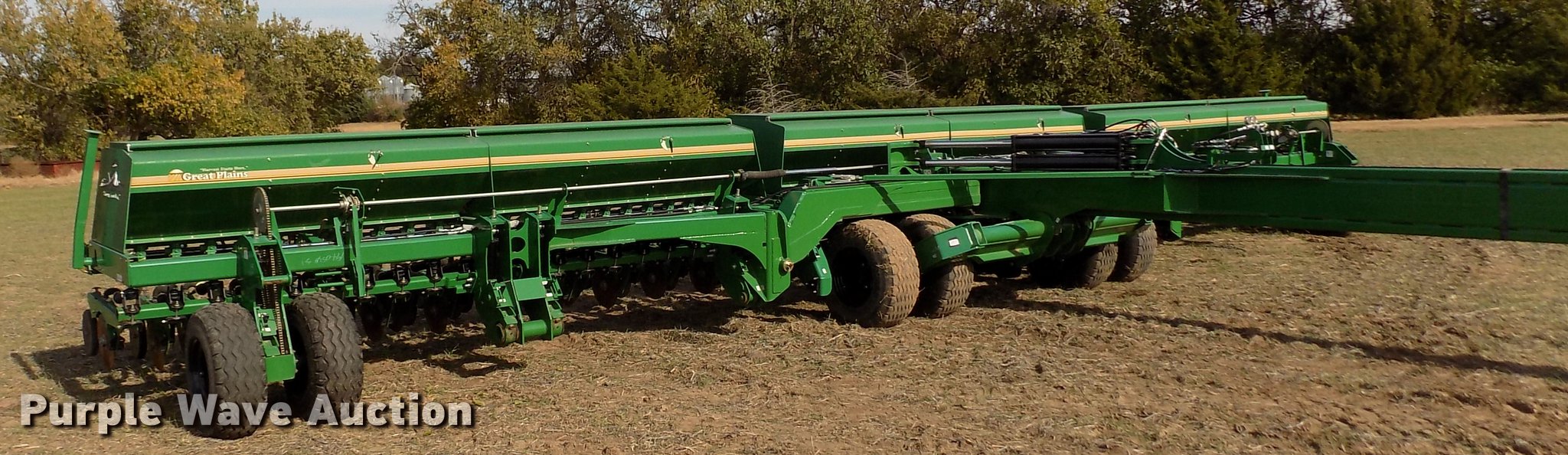 Purple Wave is selling a used Grain Drill or Seeder in Kansas. This item is a 2014 Great Plains 3S-5000HD-6010 grain drill with the following: 50'W, 60 row units, 10" row spacing, Hydraulic front fold, Bulk fill system, 148.7 bu. capacity, Ground meter drive, HD spring down pressure, Double disk openers, Single rubber closing system, Mini-Shaft four shaft monitor, Calibration device, Pin hitch, (4) 440/55R18 transport tires, (4) 340/60R16 drive/outside tires, Serial GPC1169L