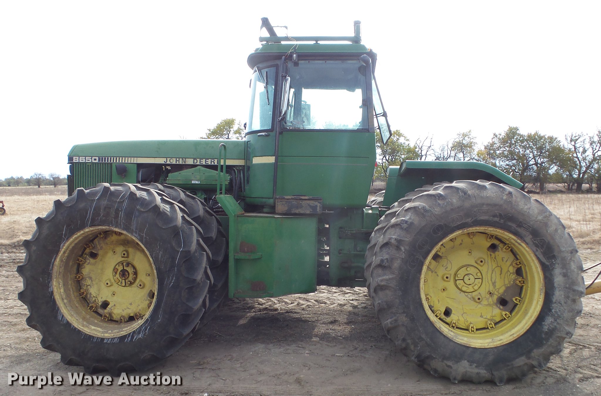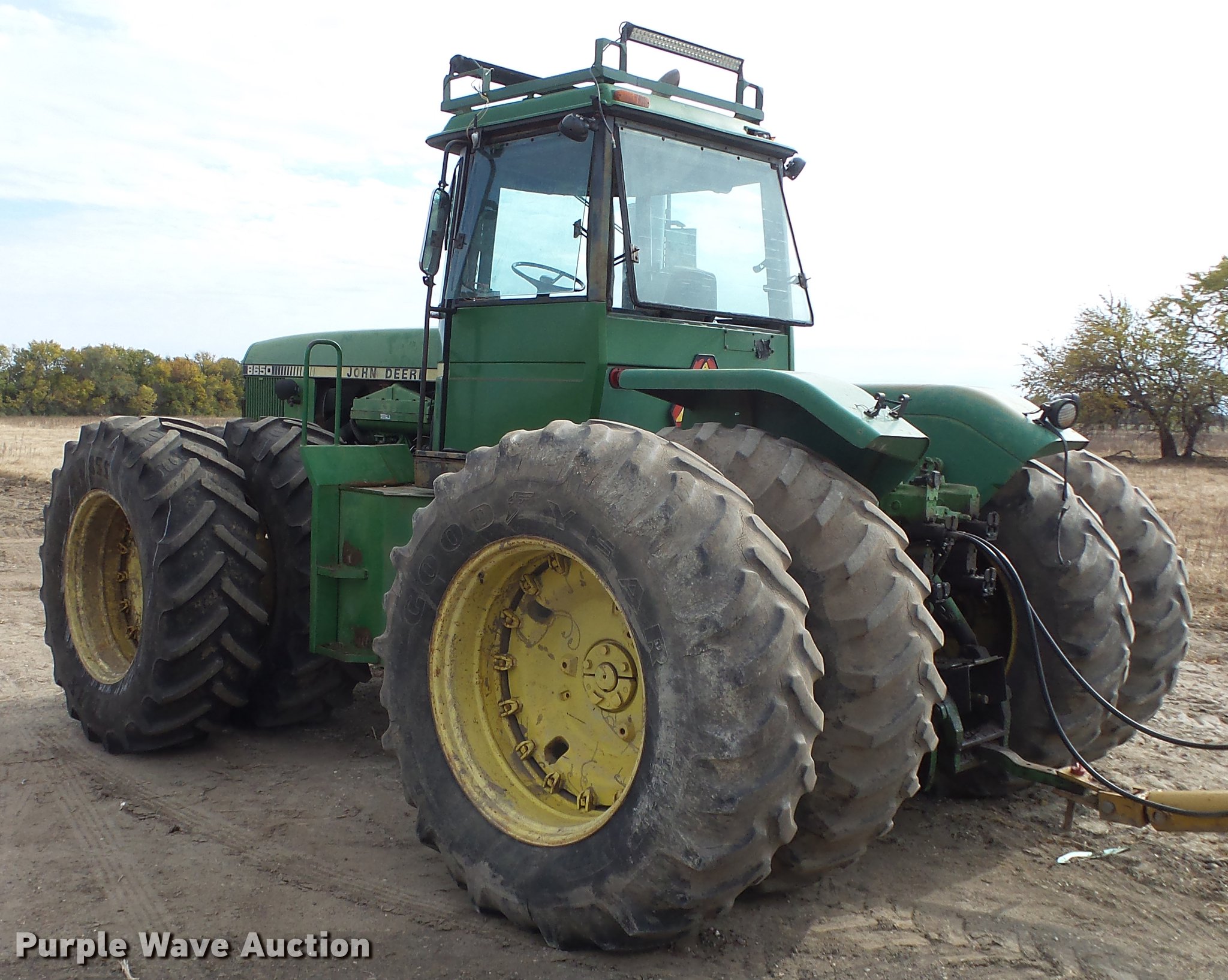 Purple Wave is selling a used Articulated 4-Wheel Drive Tractor in Kansas. This item is a 1982 John Deere 8650 4WD tractor with the following: 1,997 hours on meter, John Deere 10.1L six cylinder diesel engine, Partial powershift transmission, 16F-6R gears, Enclosed cab, AC and heat, Front and rear work lights, 1000 PTO, (4) rear hydraulic remote sets, 20.8-38 tires, Box blade not included, Serial 8650H001515RW