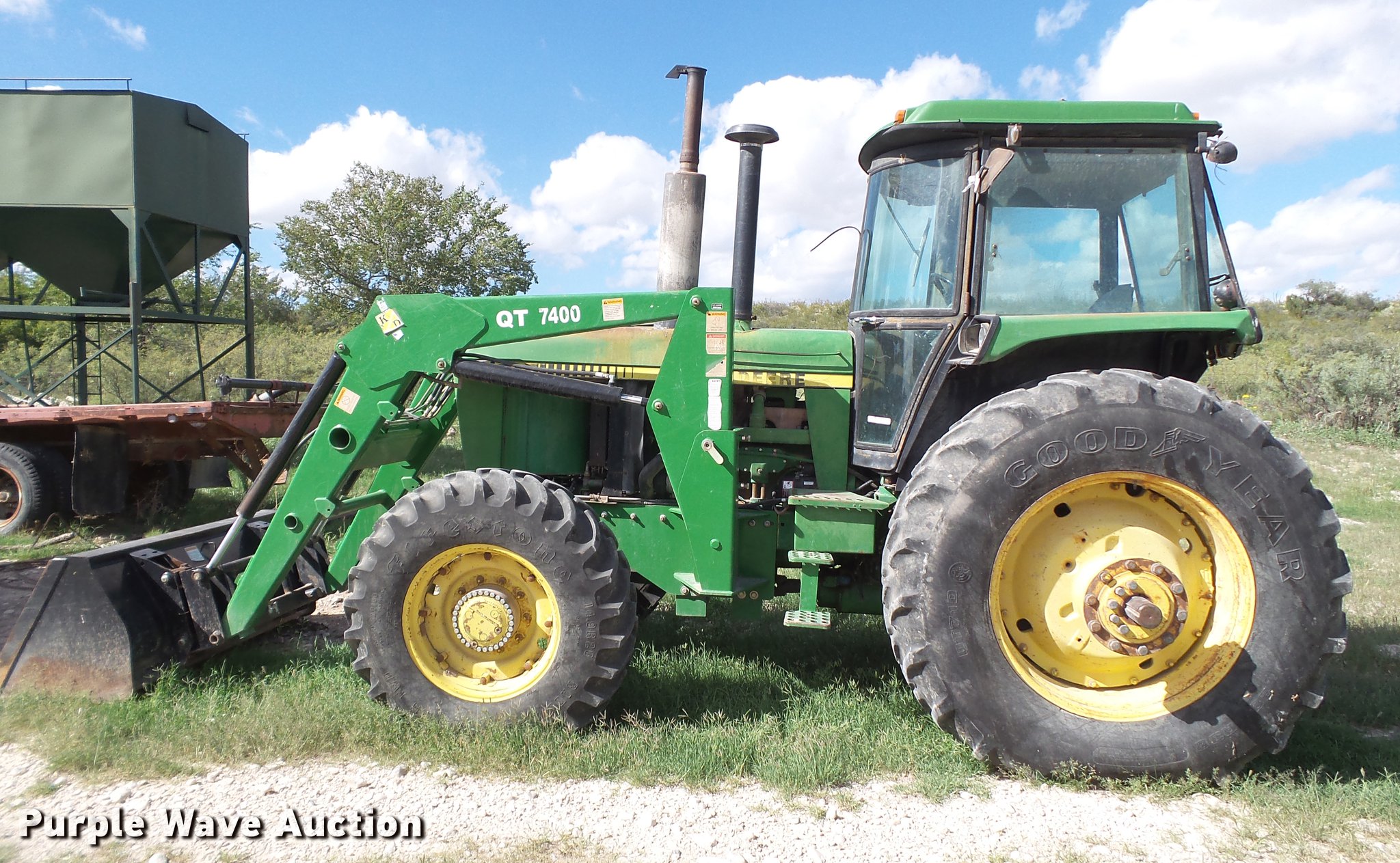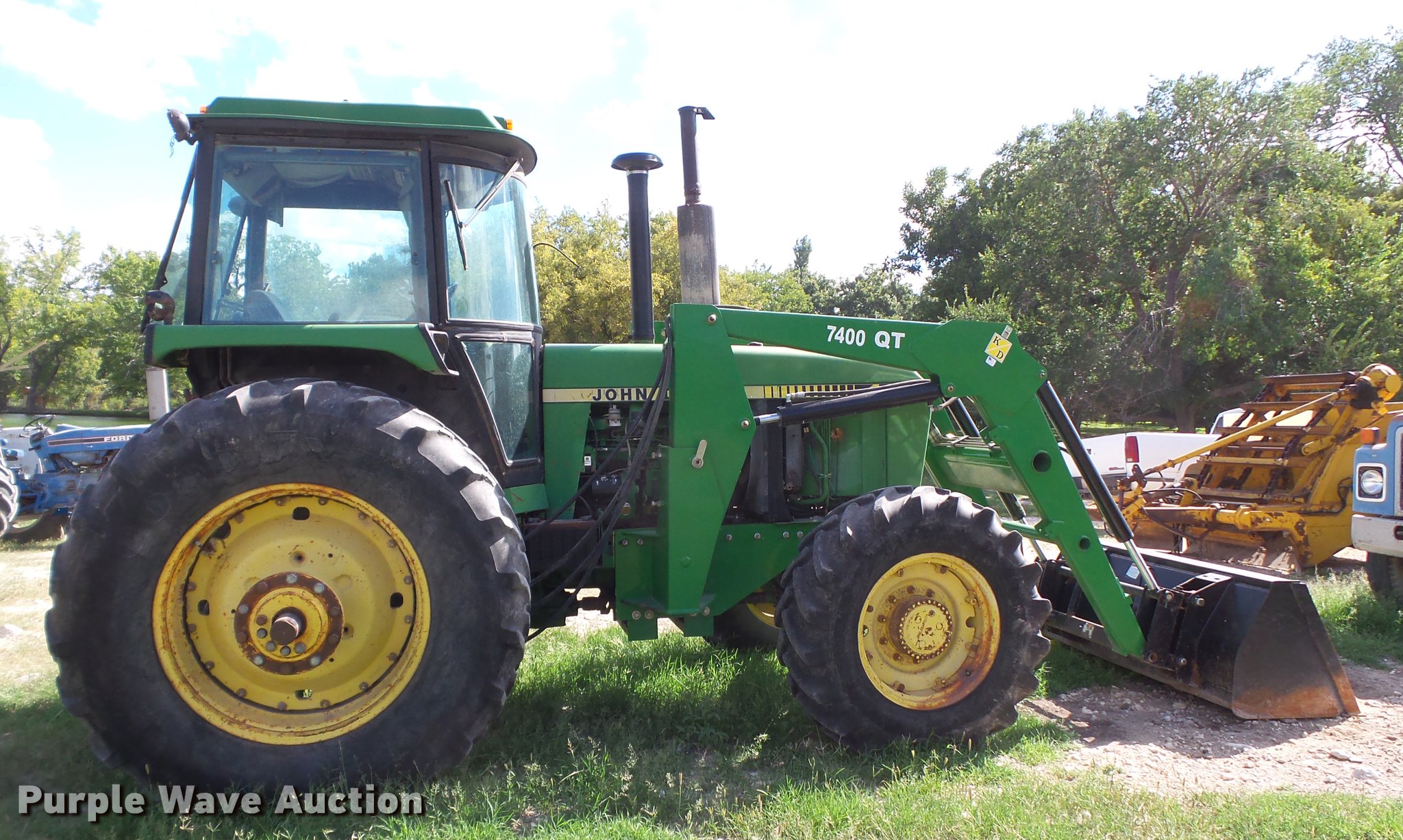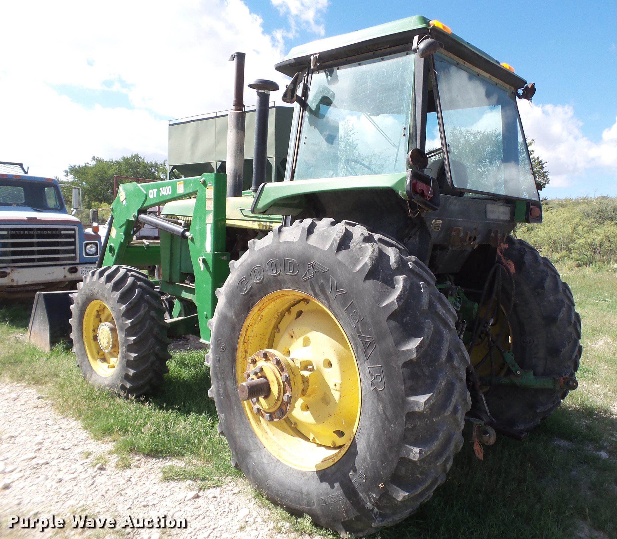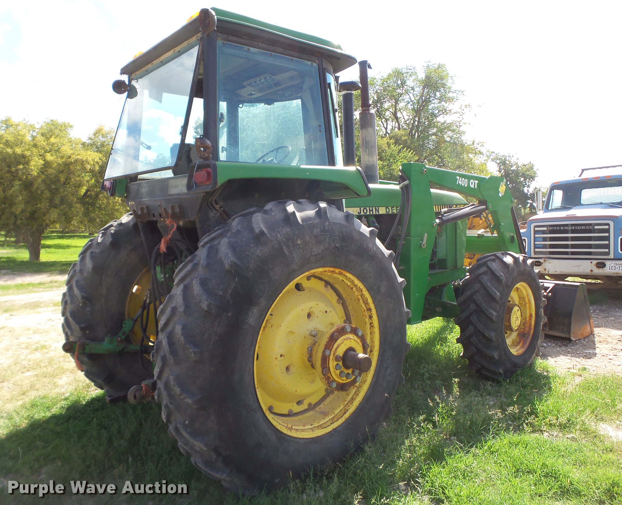 Purple Wave is selling a used Tractor in New Mexico. This item is a 1983 John Deere 4450 MFWD tractor with the following: 7,713 hours on meter, John Deere 7.6L six cylinder turbo diesel engine, 140 HP, Powershift transmission, 18F gears, AC and heat, Suspension seat, KD 7400QT loader, 72"W bucket, Two-lever controls, Three point, Top link, 540/1000 PTO, Rear hydraulic remote sets, 14.9R26 front tires, 20.8R38 dual rear tires, Serial RW4450P006337