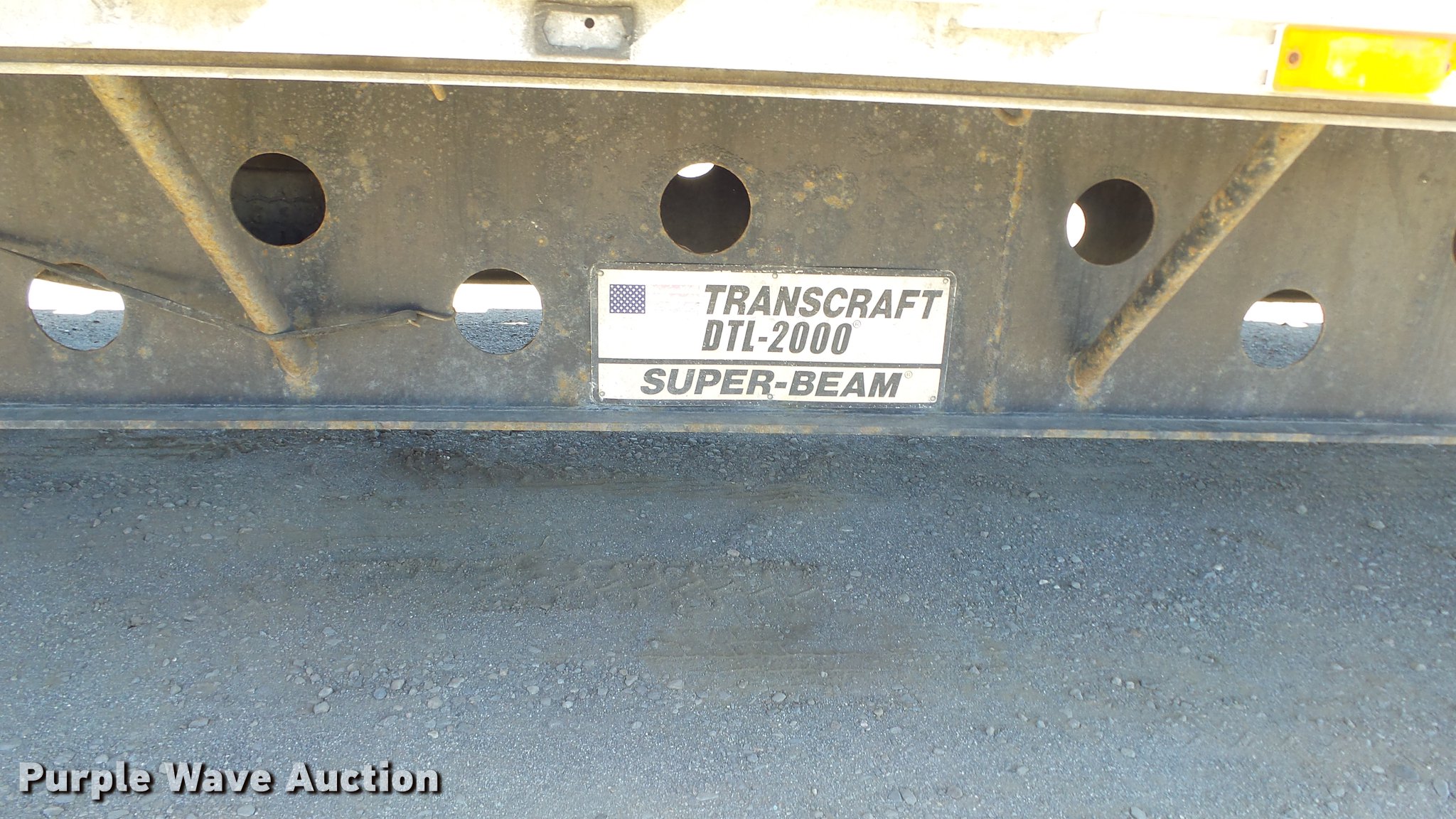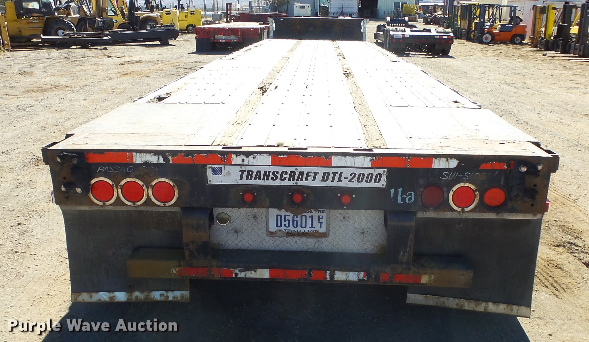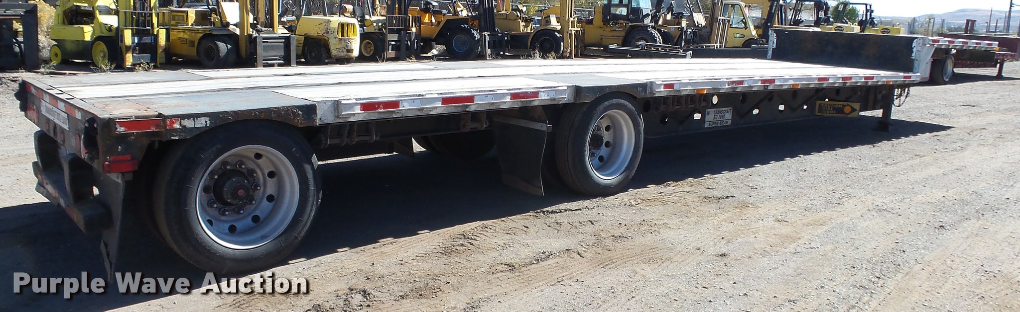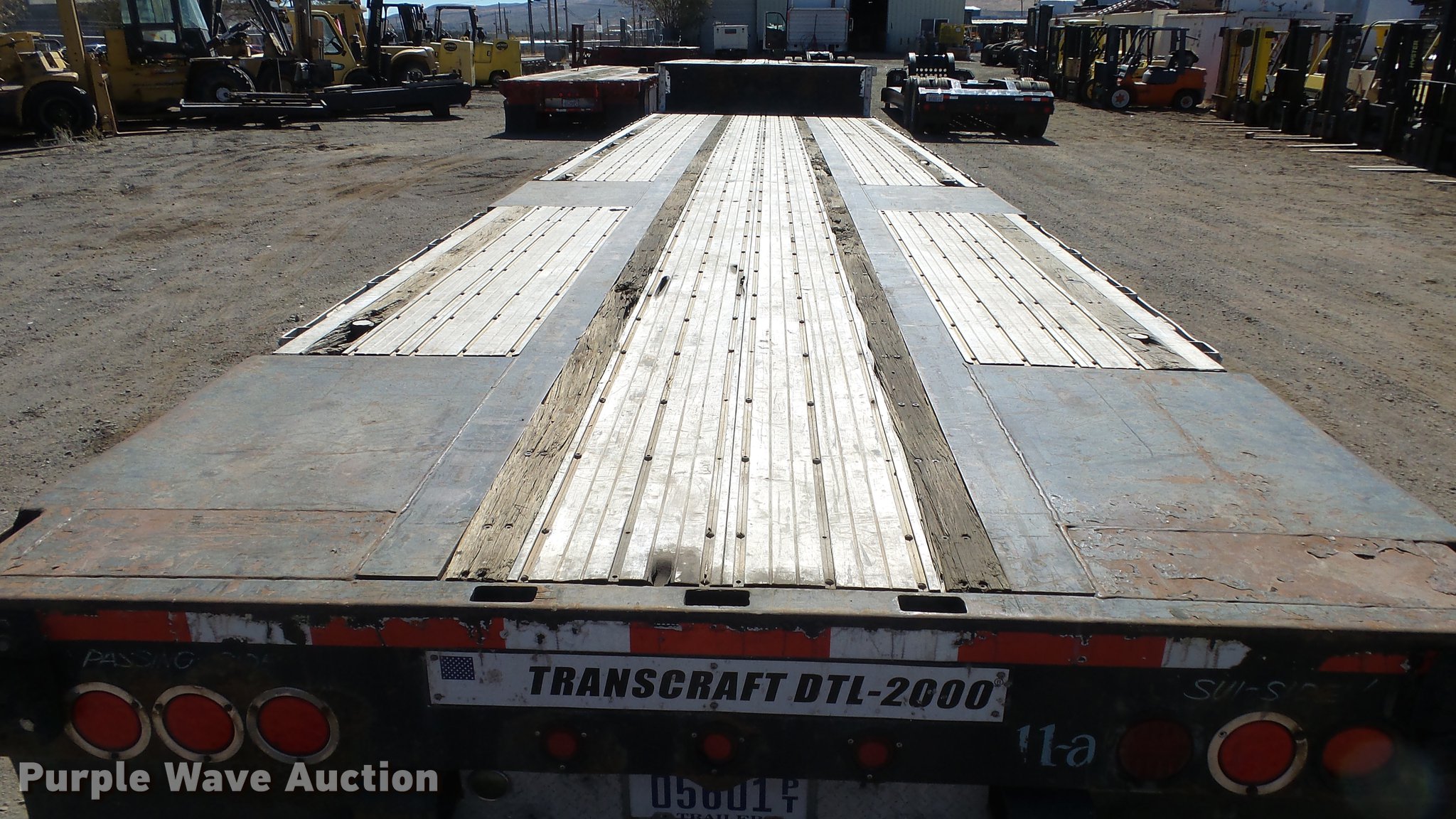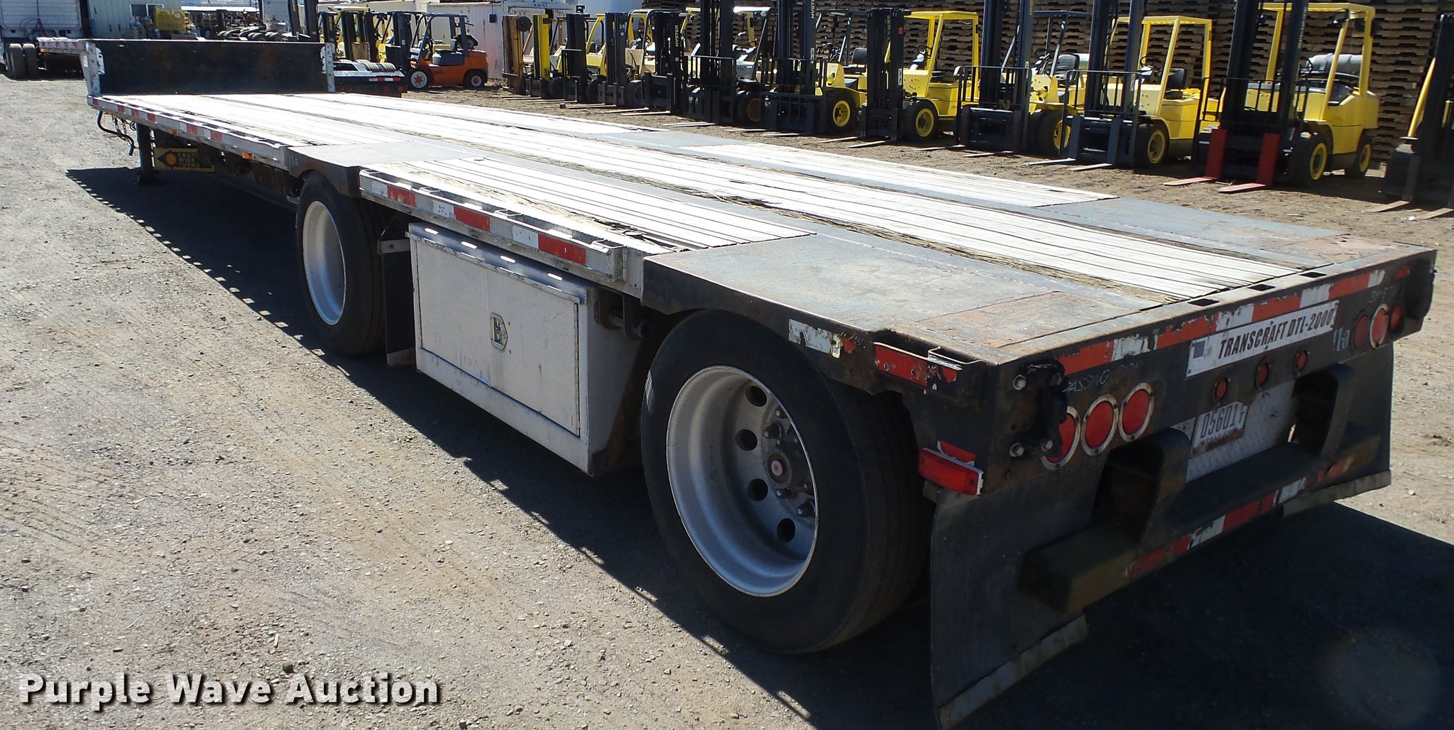Purple Wave is selling a used Flat or Drop Deck Trailer in Nevada. This item is a 1999 Transcraft DTL2000 drop deck trailer with the following: 45'L x 8'W, 11'L top deck, 34'L main deck, Aluminum deck, Wood runners, Stake pockets, Tie down rails, Sliding ratchet straps, Recessed chain anchors, Under-mounted toolbox, Mud flaps, Fifth wheel plate, Dual leg landing gear, Air suspension, Air brakes, Spread axle, Oil bath hubs, Aluminum wheels, 255/70R22.5 tires