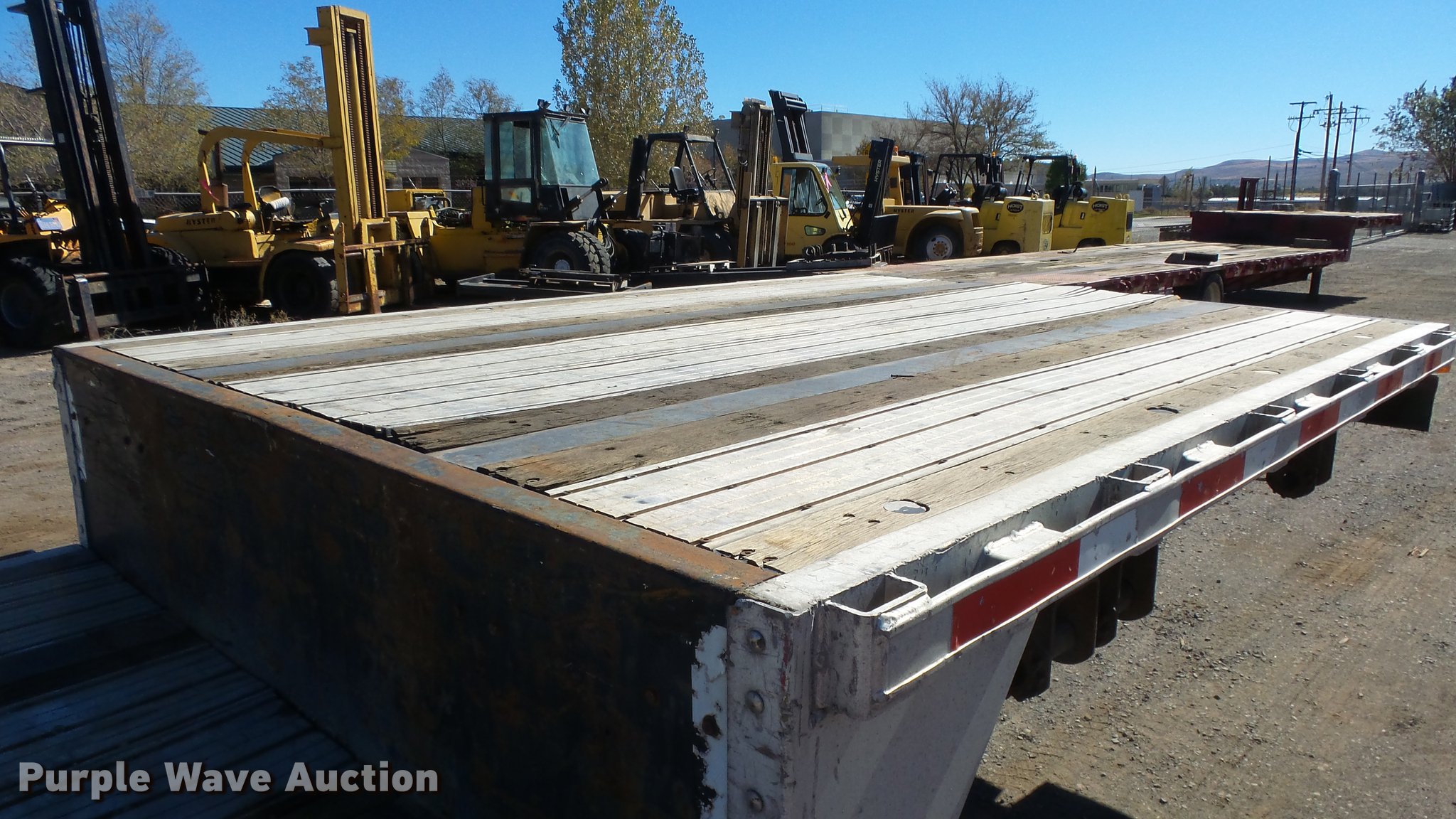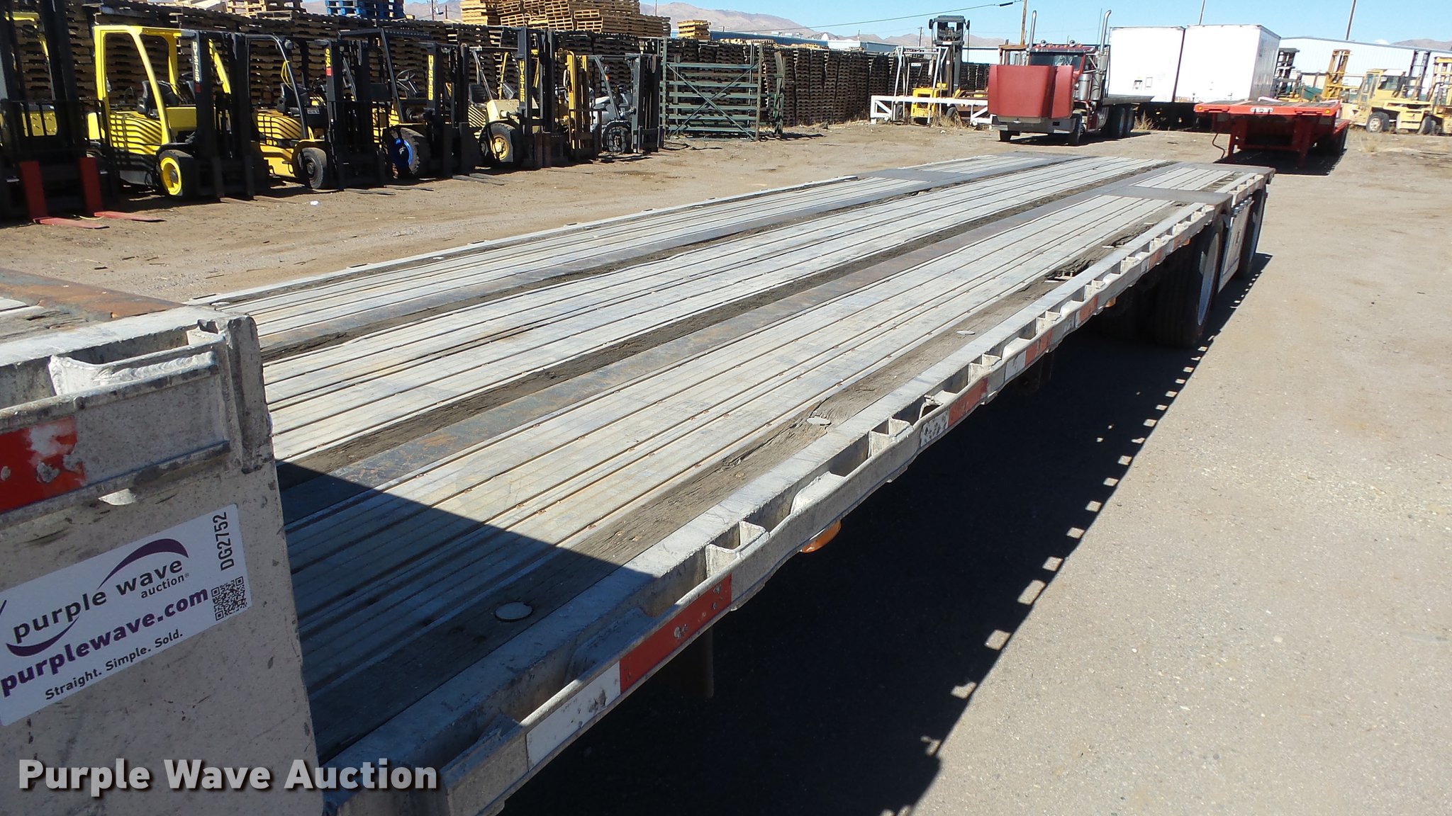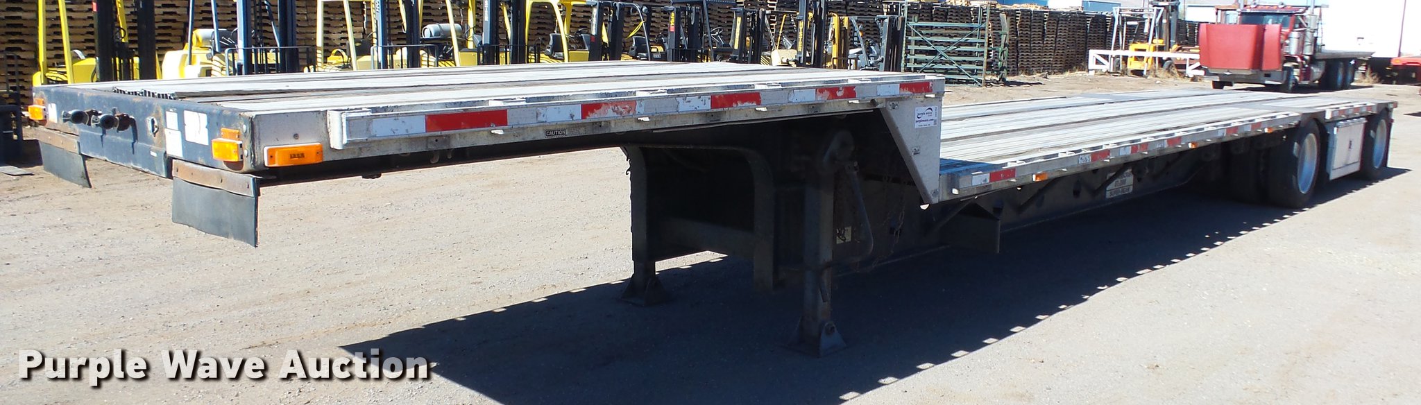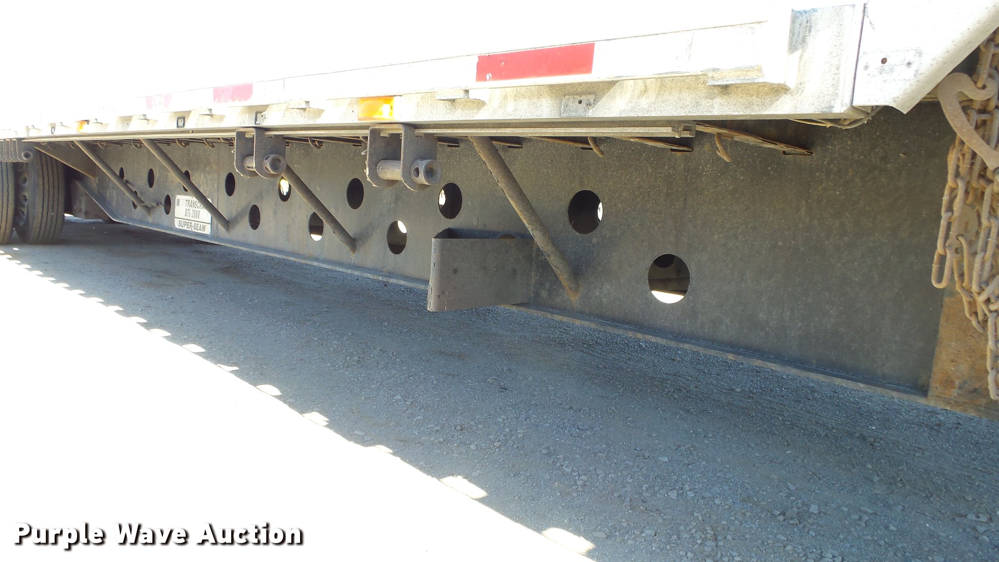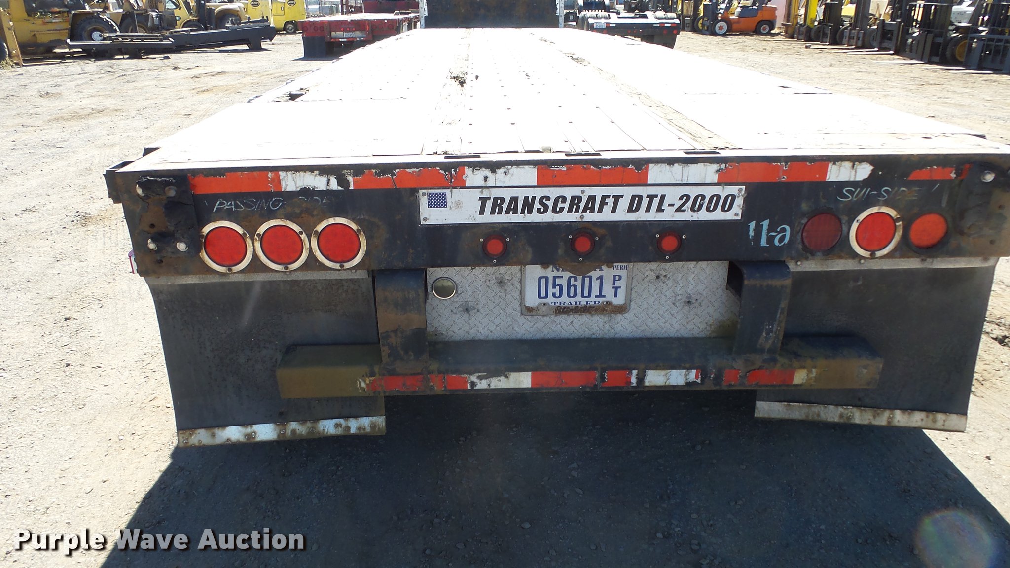 Purple Wave is selling a used Flat or Drop Deck Trailer in Nevada. This item is a 1999 Transcraft DTL2000 drop deck trailer with the following: 45'L x 8'W, 11'L top deck, 34'L main deck, Aluminum deck, Wood runners, Stake pockets, Tie down rails, Sliding ratchet straps, Recessed chain anchors, Under-mounted toolbox, Mud flaps, Fifth wheel plate, Dual leg landing gear, Air suspension, Air brakes, Spread axle, Oil bath hubs, Aluminum wheels, 255/70R22.5 tires