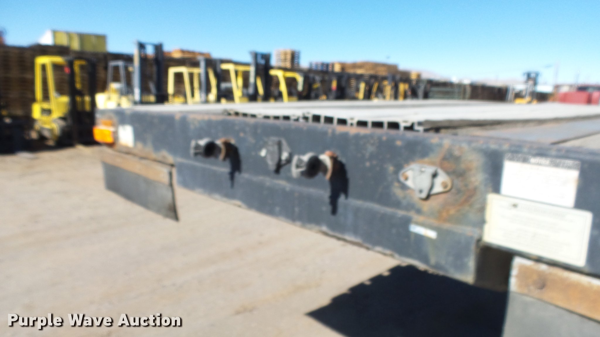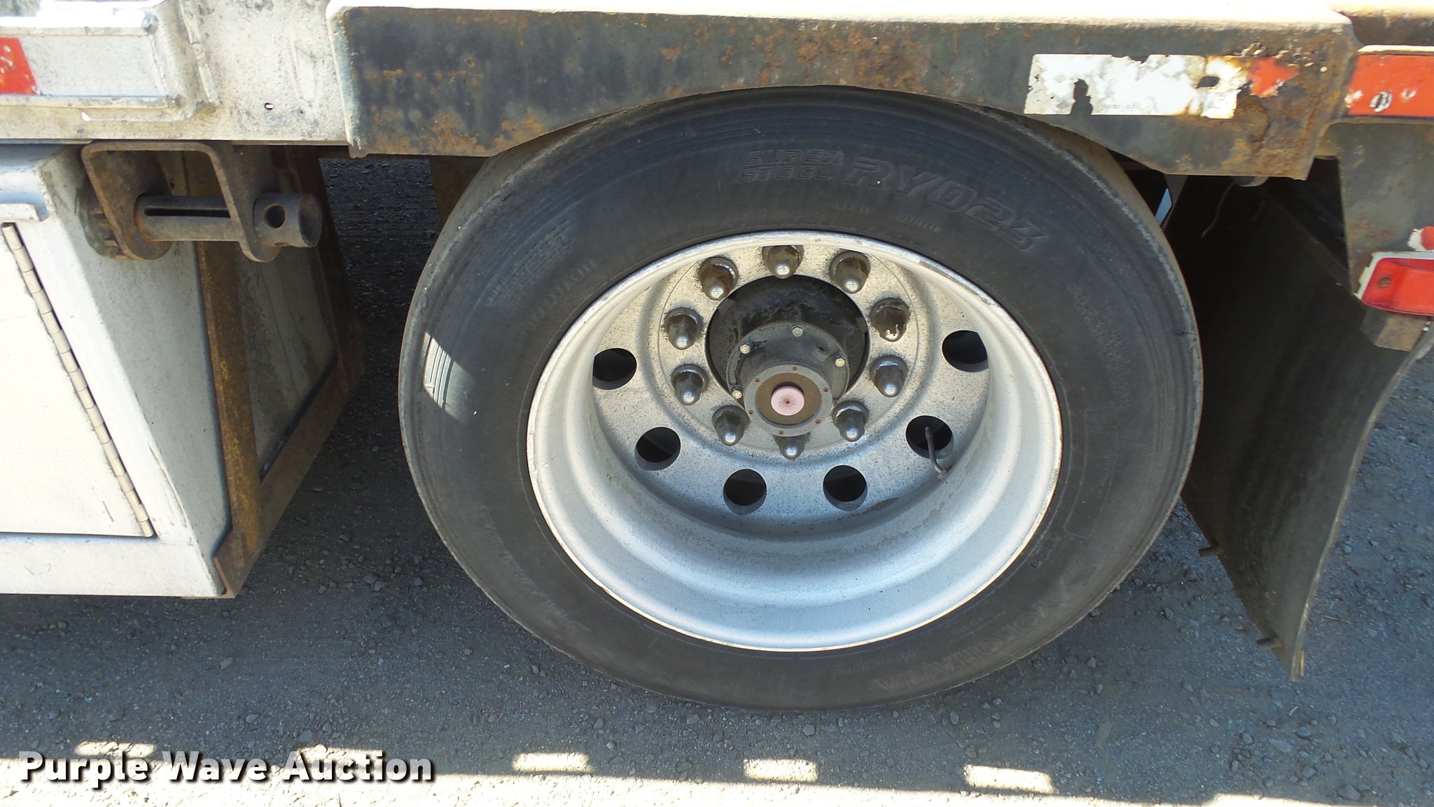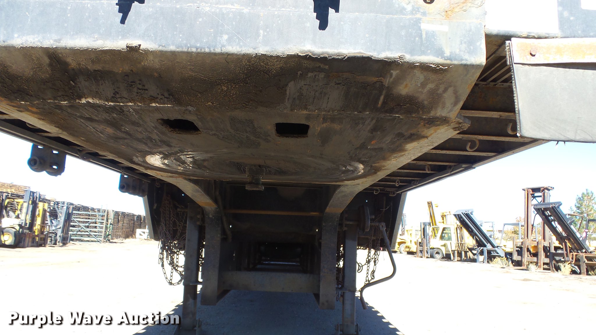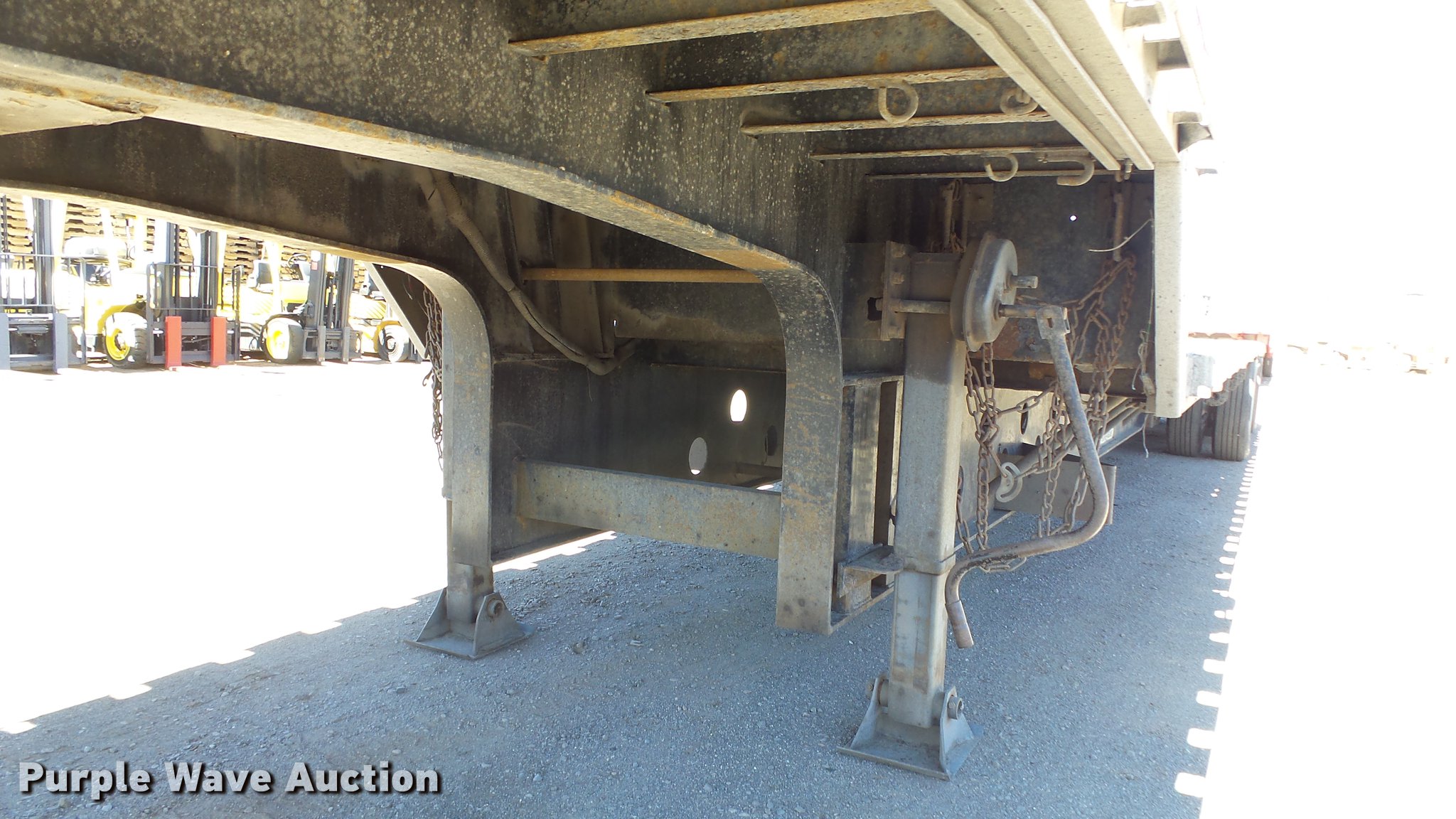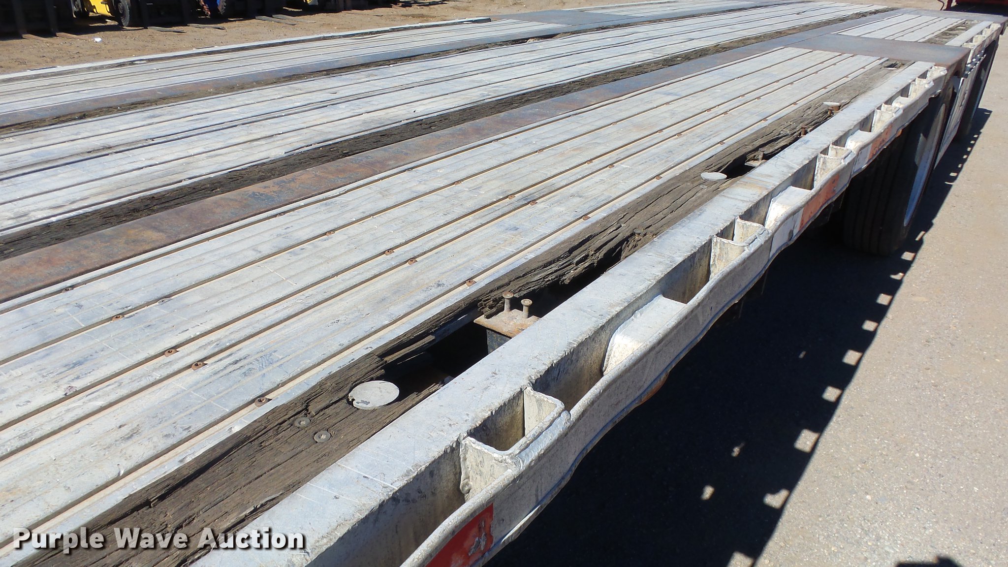 Purple Wave is selling a used Flat or Drop Deck Trailer in Nevada. This item is a 1999 Transcraft DTL2000 drop deck trailer with the following: 45'L x 8'W, 11'L top deck, 34'L main deck, Aluminum deck, Wood runners, Stake pockets, Tie down rails, Sliding ratchet straps, Recessed chain anchors, Under-mounted toolbox, Mud flaps, Fifth wheel plate, Dual leg landing gear, Air suspension, Air brakes, Spread axle, Oil bath hubs, Aluminum wheels, 255/70R22.5 tires